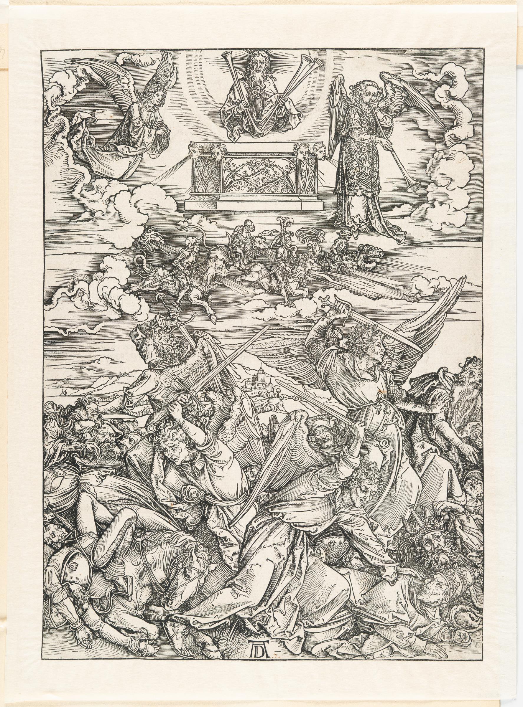 Figure VII from: The Apocalypse. A fine, crisp and richly-inked inked impression of the German text edition of 1498. Printing with good contrasts and little to no sign of wear. Trimmed to the borderline. – Fitted in a mask on transparent paper; the upper und lower left corner attached; the lower right corner made up. In the upper margin a 6 cm long, carefully restored tear; a closed vertical tear at the centre; scattered foxing and minimally discoloured on the reverse. Otherwise in good condition.