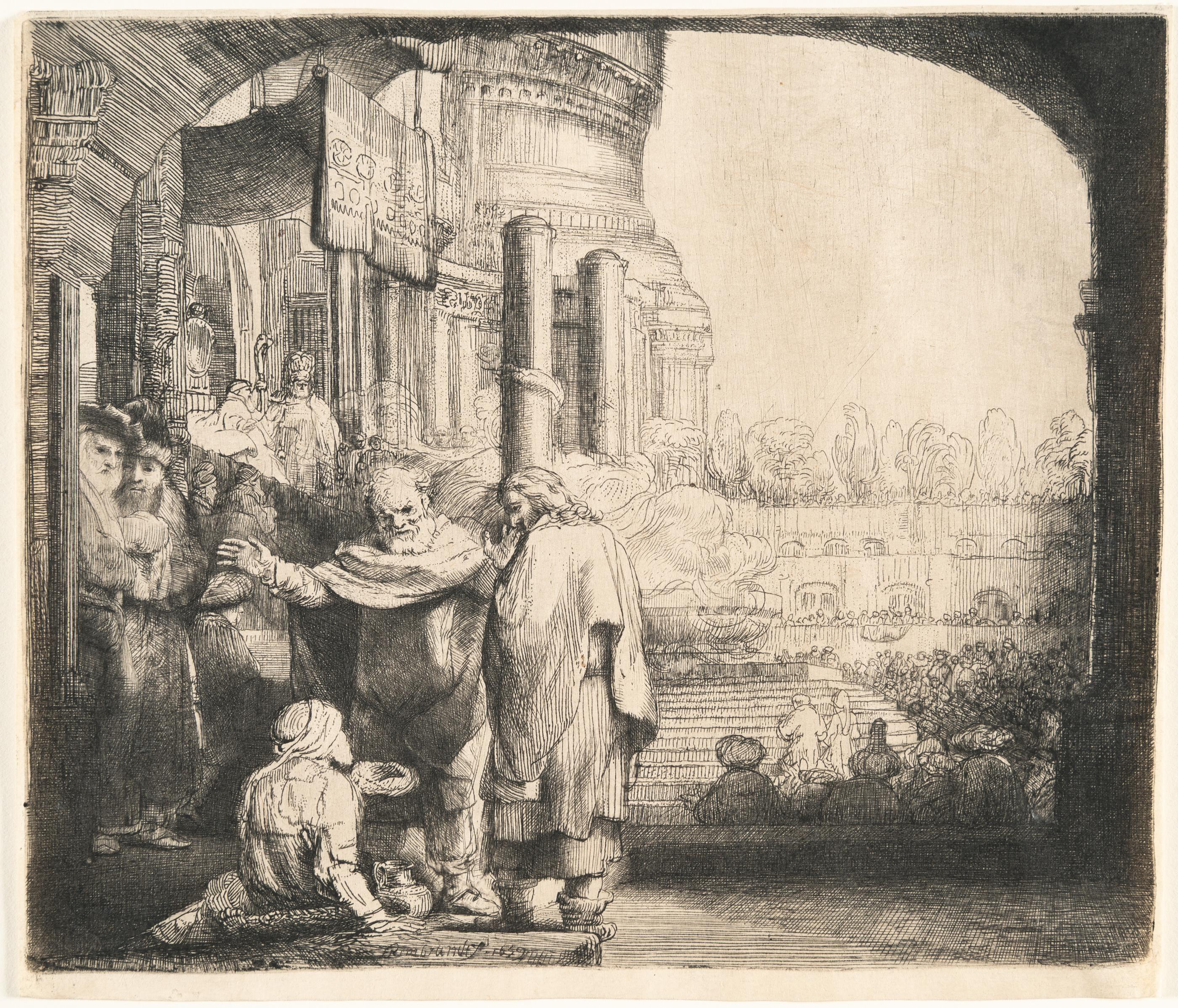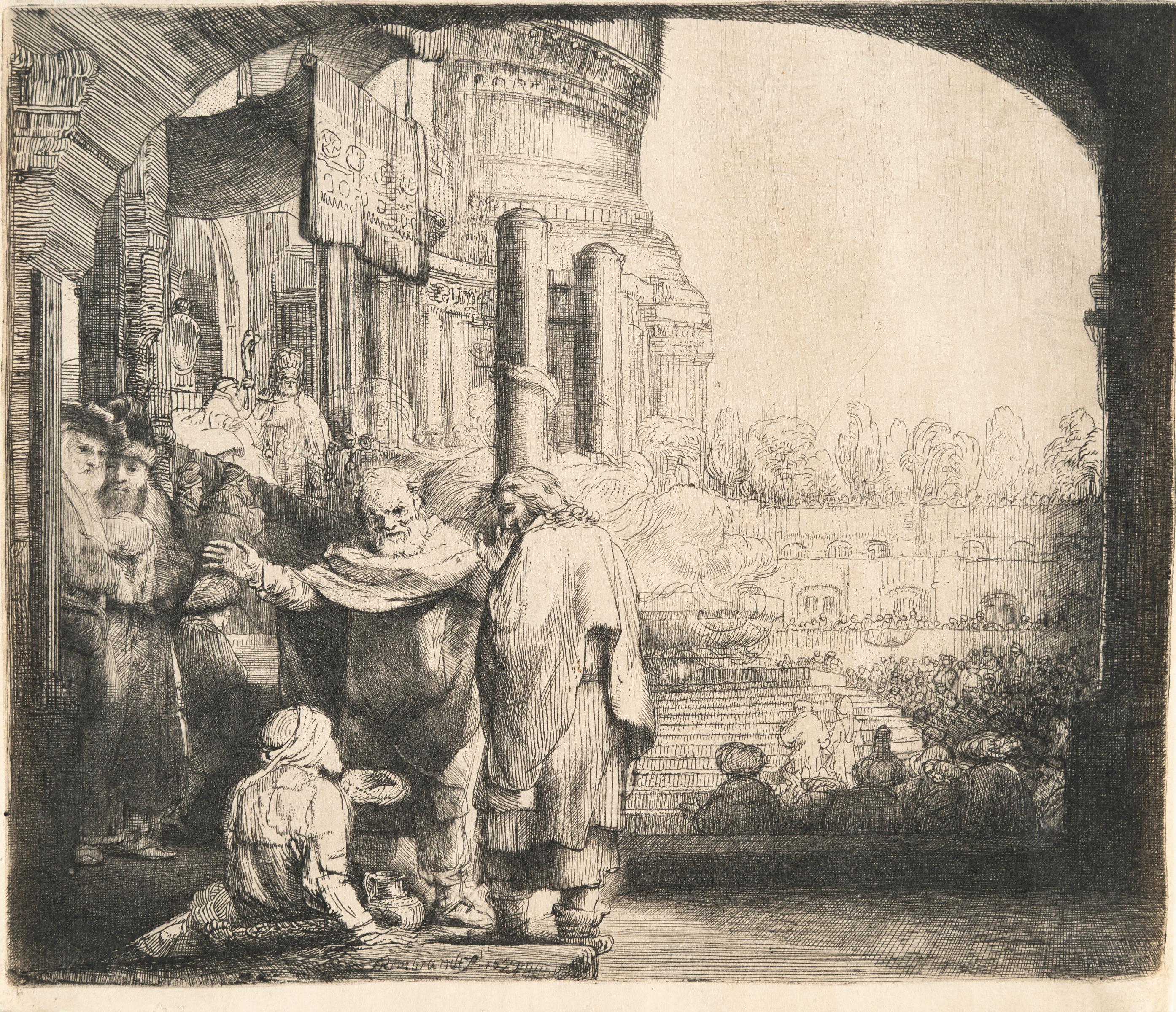 A very fine, early and atmospheric impression, printing with good contrasts and depth; the vertical wiping marks in the sky strong and with a light plate tone. Printing with burr in places (the canopy at top left and the hat at the left edge centre). With a small margin below and thread margins on the other sides. This impression represents the second state (of six). Peter’s right side has been straightened, and the line of the cloak across his chest now curves more deeply, reaching the level of his right elbow. Additional shading has been introduced in John’s garments, and Peter’s left foot has been redrawn. The scene depicts the biblical scene of Peter and John healing a crippled man at the gate of the temple, as recounted in the Acts of the Apostles (Acts 3:1–10). The cripple is seated on the ground at the left, seen from behind, collecting alms. In front of him, beneath the archway of the temple gate, stand Peter and John. A small group of onlookers gathers to the left, while in the background a large crowd observes the event from the broad steps of the temple, creating a sense of depth and public engagement. Verso with a few tiny, isolated brown spots and remnants of a former mounting in the corners of the upper edge, otherwise in very good condition. Very rare on Japan paper!