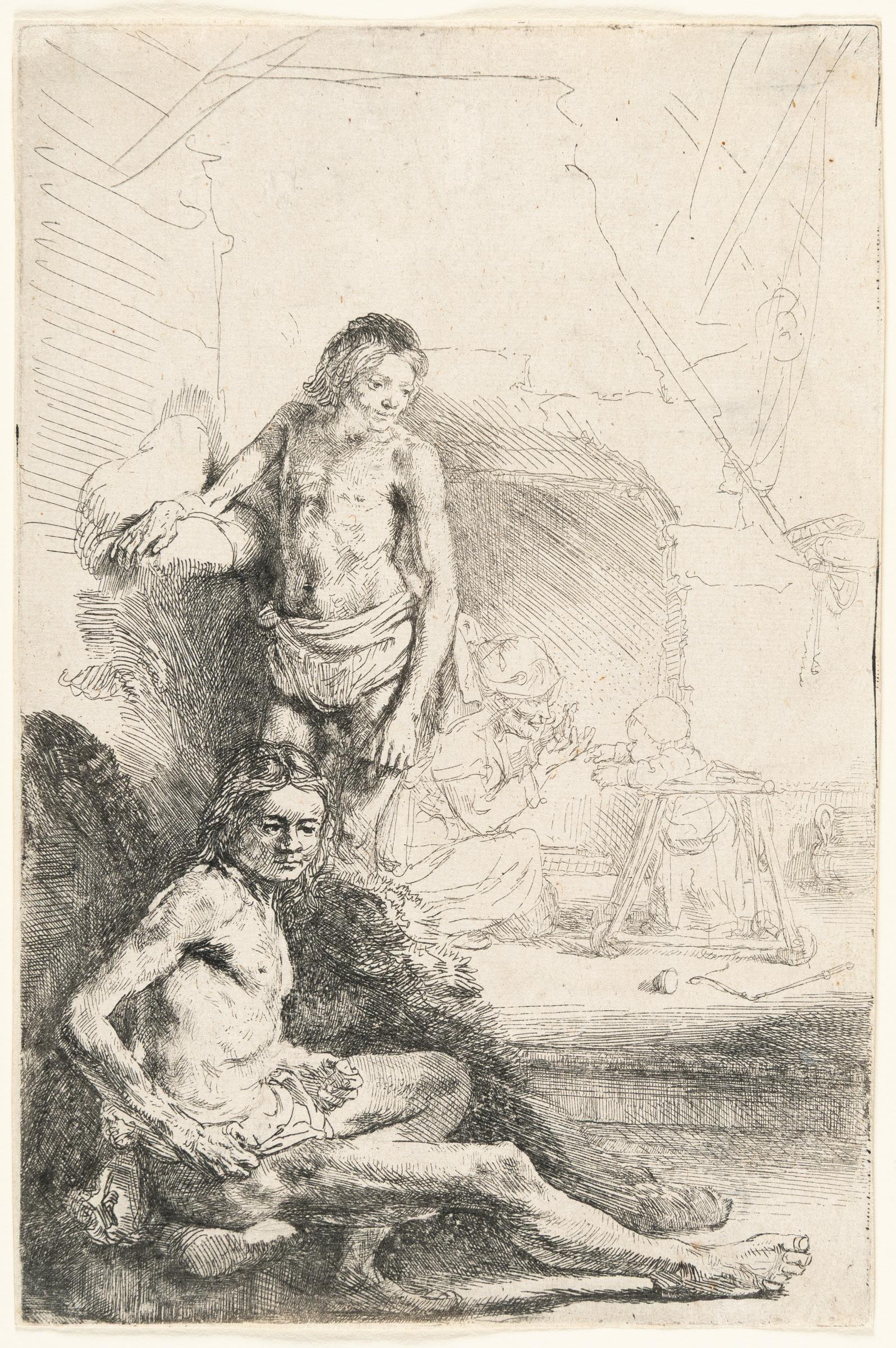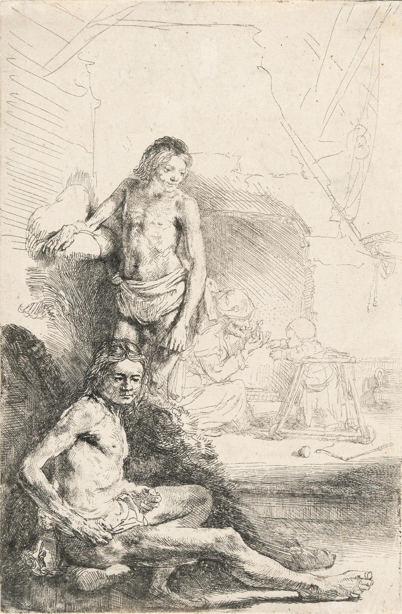 A fine lifetime impression of the first state, printed with plate tone. With false biting, resulting in irregular white spots, typical for the earliest state. It is likely that Rembrandt’s studies of male nudes, all created in 1646 from the same models, were part of a cohesive series. This particular sheet is especially intriguing due to the background scene: a young child, standing in a wheeled walker, is learning to walk in a Dutch kitchen with an open hearth, while a maid watches over him. The juxtaposition of two entirely distinct subjects in one composition is rare in Rembrandt’s work. Thread margins at top and left side; trimmed on the platemark on bottom and right side. – Minor thinning in the corner and along the side edges. The upper left corner carefully restored. Paper strips from a previous mounting along the right edge on the verso. Otherwise in very good condition.