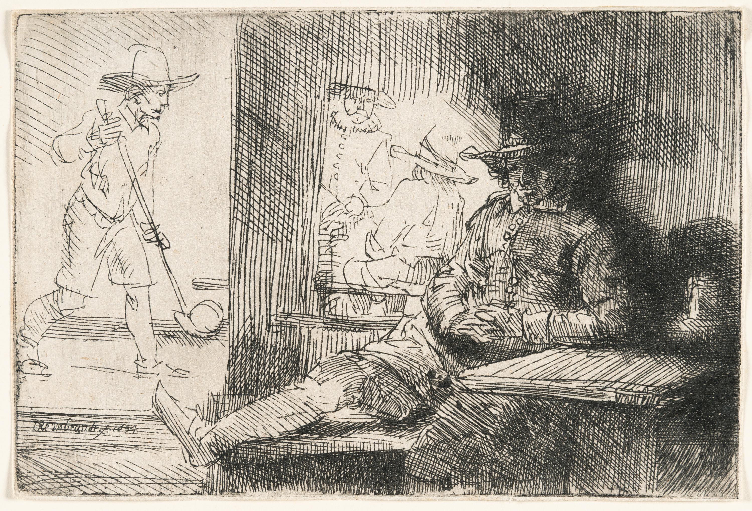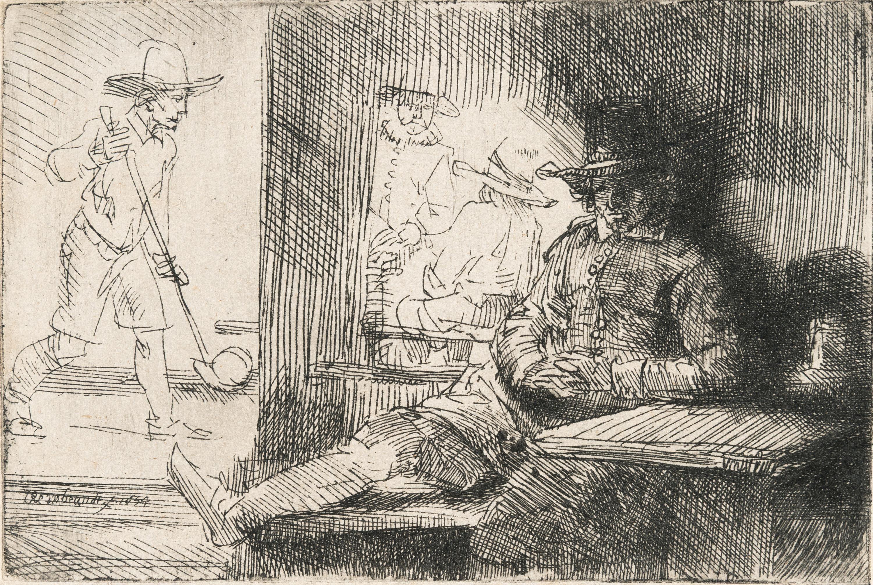 An exceptionally fine lifetime impression of the first state, showing the same watermark like the impressions in the British Museum and the Rijksprentenkabinet with rich relief in the shadowed areas, fine vertical scratches in the white rectangle on the left side and inky plate edges. Printed with a soft, atmospheric platetone. Still with the blank spots along the upper margin and lower margin to the right of the left knee of the sitting man, which are later shaded out with drypoint or burin. This sheet is among Rembrandt’s rare depictions of sports and leisure, illustrating a game of kolf, traditionally played on narrow lanes and considered a historical predecessor to modern golf. Thread margins. – Verso along the upper edge with a thin paper strip from an earlier mounting. Otherwise in very good condition.