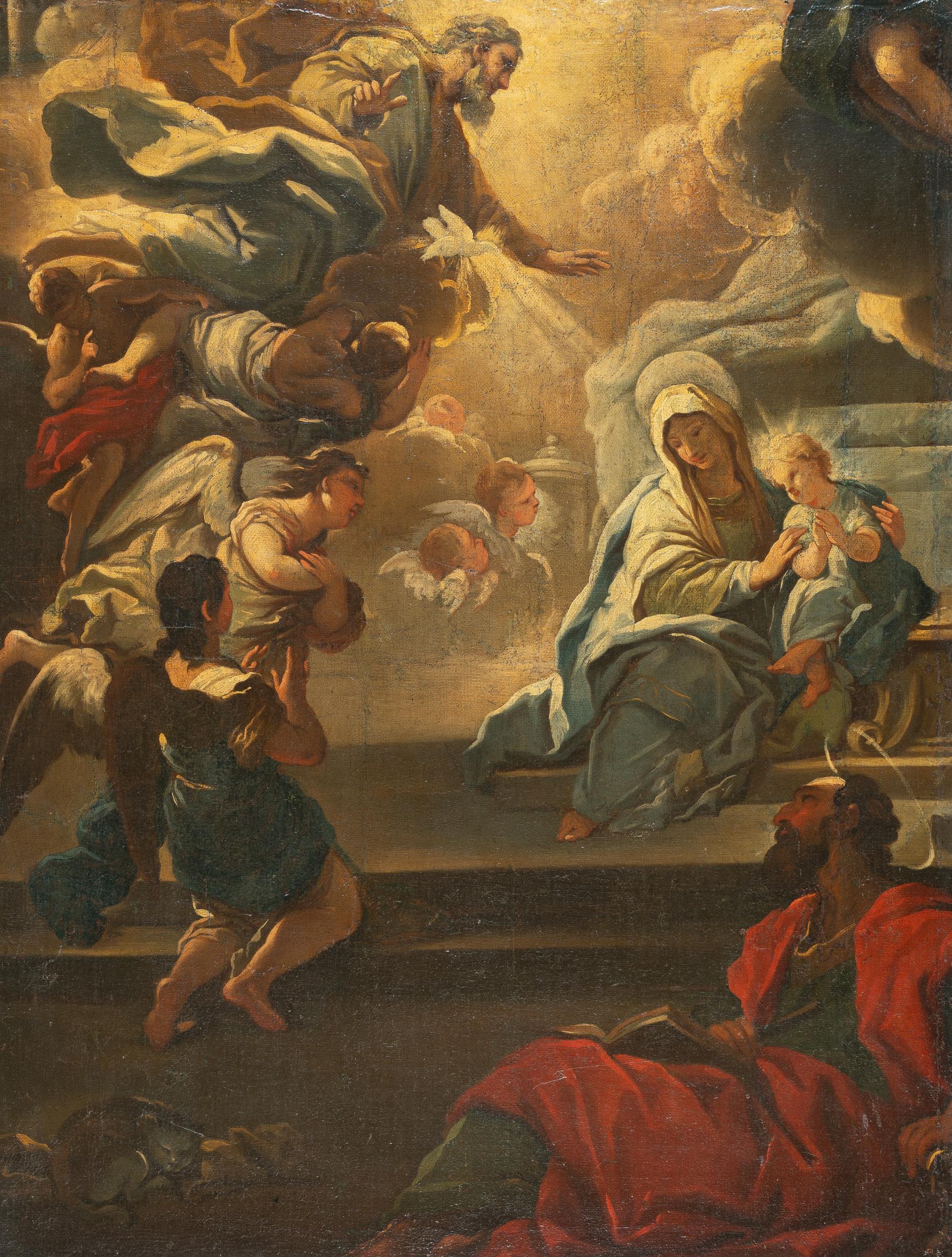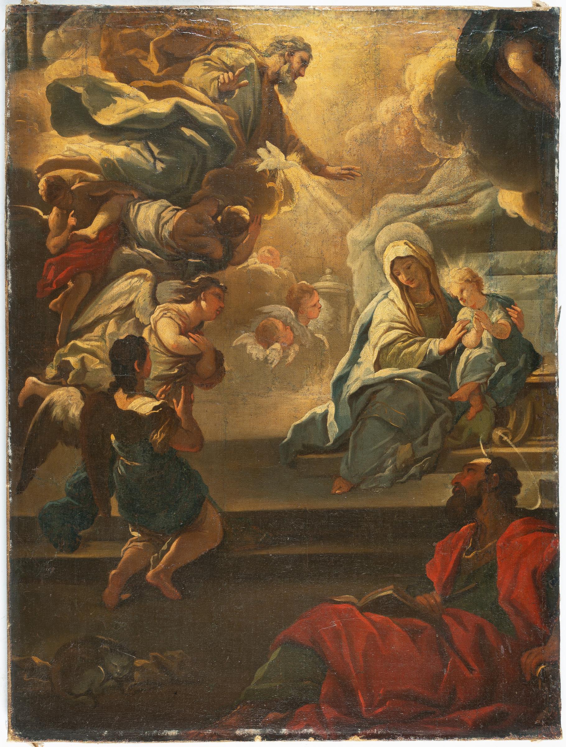 Von Gottvater und der Taube des Heiligen Geistes oben links fällt ein Lichtstrahl auf die rechts auf dem Schoß der Heiligen Anna sitzende Maria. Auf den Stufen darunter der Heilige Joachim. Links adorierende Engel. Laut Prof. Dr. Erich Herzog handelt es sich bei der Komposition um eine Vorstudie zu dem Altarbild in Santa Maria in Campitelli in Rom aus dem Jahr 1685. Eine weitere Studie, die anstelle Marias Vater drei kniende Heilige zeigt, wurde am 6. Dezember 1973 bei Parke-Bernet in New York (Los 79) versteigert. Mit einer Foto-Expertise von Prof. Dr. Erich Herzog, Kassel, vom 1.2.1974 (im Original).