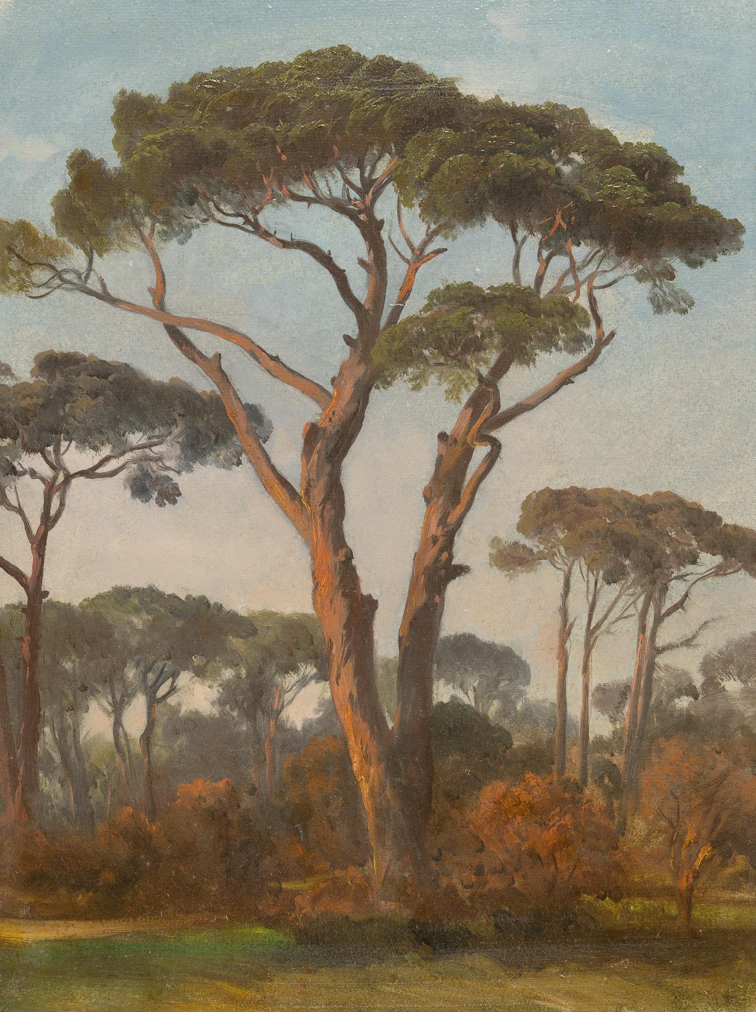 Im Jahr 1835 konnte sich Frey, gefördert durch die Basler Mäzenin Emilie Linder, in Rom niederlassen. Auf der Suche nach klassischen Landschaftsmotiven erkundete er rastlos die Umgebung von Rom. In München war er bereits mit der Landschaftsmalerei Johann Georg von Dillis' und Carl Rottmanns in Kontakt gekommen, die die Freilichtmalerei propagierten; und Frey ist ihnen mit seinen Ölskizzen in dem Aspekt nachgefolgt, als er nicht die Landschaft als solche malte, sondern ihre einzelnen Elemente: Bäume, Sträucher, Felsen und Bäche. So auch die dargestellten Pinienbäume, die im südlichen Klima hoch gewachsen sind und Frey wohl auf einer seiner Touren in den heißen Sommermonaten Schatten gespendet haben. Die Darstellung ist Teil eines Konvolutes von 31 Bildern, das von Hans Wendland 1925 in Chicago gefunden und von diesem Arnold Böcklin zugeschrieben wurde. Über die Frage der Autorschaft entbrannte ein seinerzeit teils erbittert geführter Streit in der Böcklin-Forschung, in dem sich als Befürworter Justi, Friedländer, Thormaelen, Bode, Meier-Graefe und Waldmann und als Gegner Heinrich Alfred Schmid, Wölfflin und Carlo Böcklin gegenüberstanden. Hans Holenweg, der den Fall 1998 noch als „ungelöstes Rätsel der Böcklin-Forschung“ bezeichnet hatte, schrieb 2006 die „Wendland-Bilder“ Johann Jacob Frey zu.