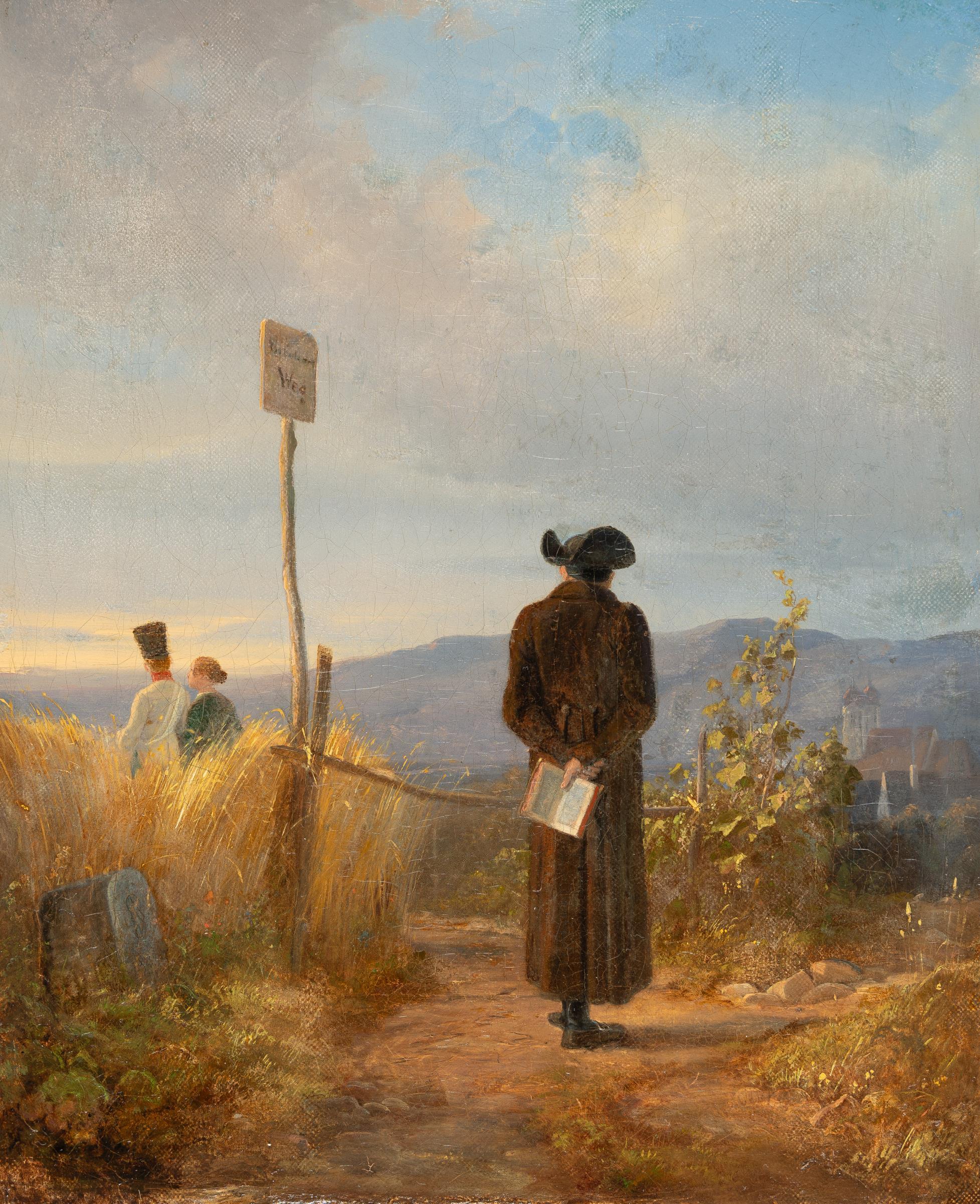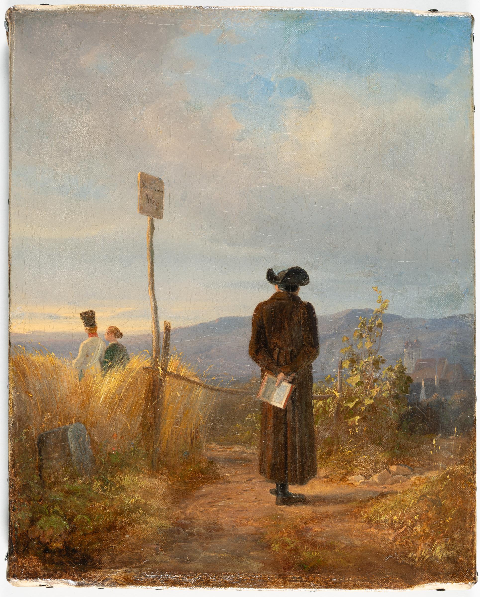 1850 erschien in Wien die Erzählung „Der verbotene Weg“, die der Autor Joseph Heilmann im Untertitel als Erzählung aus dem österreichischen Landleben für die Jugend inhaltlich genauer definiert. Im Laufe der Erzählung erfahren die Kinder über die Bedeutung von Gemeinschaft und Familie, werden mit den Anforderungen eines Gerechten und gottgefälligen, tugendhaften Lebens bekannt gemacht. Es ist eine erzählerische Anleitung in Moral und Sittlichkeit – wir wissen nicht, ob Spitzweg, der ja selbst viel las, diese kleine Schrift kannte, es dürfte sogar eher unwahrscheinlich sein, doch zeigt sie, wie das Thema von Moral und Tugend, die Frage nach einem redlichen und aufrichtigen Leben allgemein vor allem das aufstrebende Bürgertum in dieser Umbruchzeit des 19. Jahrhunderts beschäftigt hat. In seinen Gemälden thematisiert Spitzweg immer wieder den Konflikt zwischen Moral und Unmoral, zwischen der Freiheit der Gedanken und der Erfüllung gesellschaftlicher Normen. Er hält der Gesellschaft den Spiegel vor, dabei stets liebevoll, doch auch ironisch auf Außenseiter der Gesellschaft zielend, wozu in einer zunehmend säkularisierten Gesellschaft auch der Stand der Geistlichkeit zählte. Landpfarrer und Dorfpfarrer bevölkern ihr Brevier lesend Spitzwegs Landschaften, beobachtet sie auf ihrem Spaziergang, Mönche haben sich in einsame Waldklausen und Eremitagen zurückgezogen, weil ihre Klöster nicht mehr existieren – und immer sind sie allein. Es ist die Erzählung von der beginnenden Vereinzelung in der Gesellschaft, die später in der Kunst des ausgehenden 19. Jahrhunderts eine große Rolle spielen sollte. Das Thema war begehrt und Spitzweg war damit sehr erfolgreich; Siegfried Wichmann führt in seinem Werkverzeichnis nicht weniger als sieben Fassungen unserer Bilderfindung auf (Nr. 274-280).