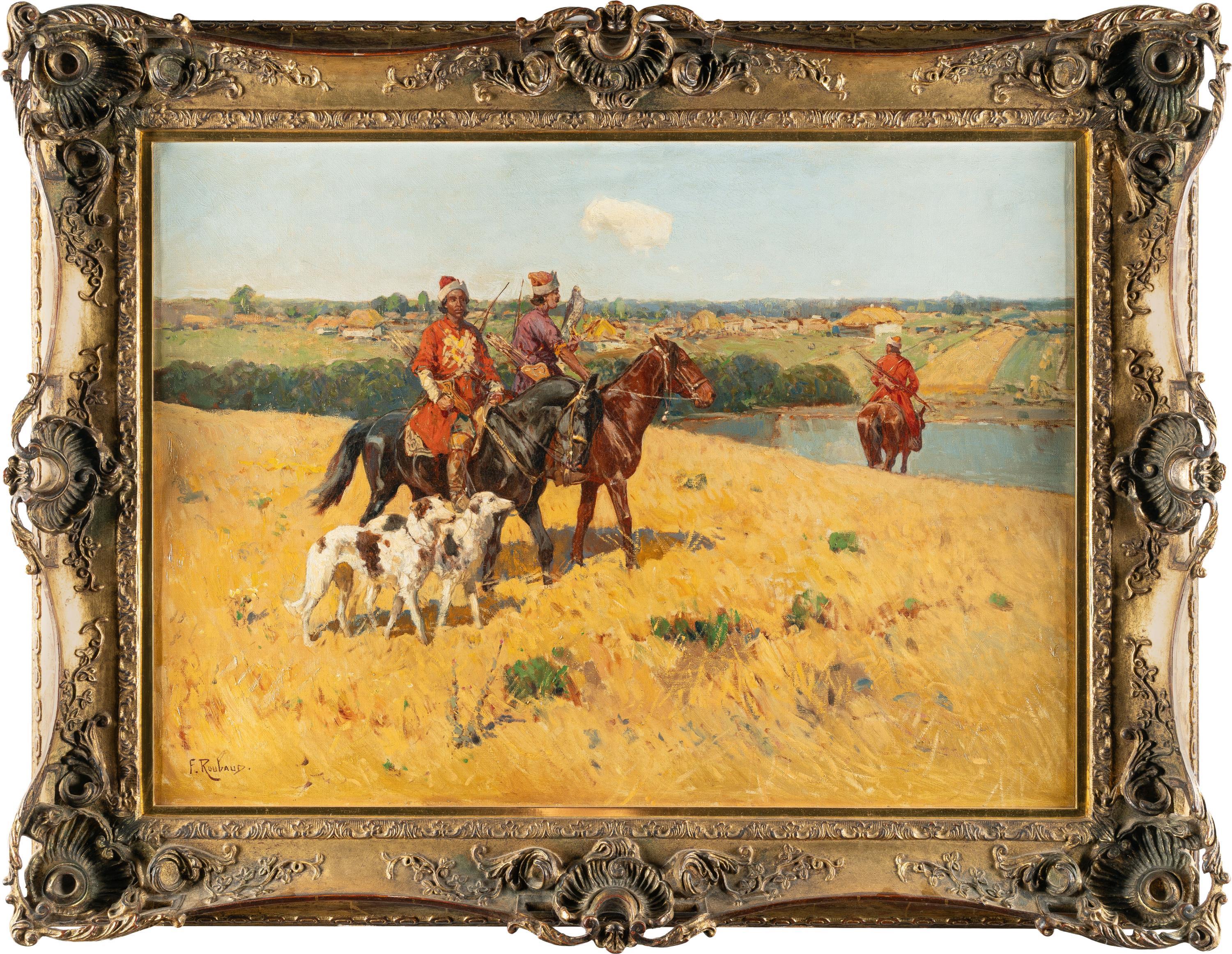 Nach seiner Ausbildung in München war auch Zar Alexander III. auf den aus Odessa stammenden Roubaud aufmerksam geworden und ermöglichte ihm zwischen 1882 und 1884 Aufenthalte im Kaukasus, die ihn bis nach Tiflis, Erivan, Baku und Taschkent, sogar nach Samarkand im heutigen Usbekistan führten. 1886 folgte ein weiterer längerer Aufenthalt im Kaukasus, als ihm der Zar den Auftrag gegeben hatte, die in Tiflis neuerrichtete Ruhmeshalle mit Schlachtengemälden auszustatten. Roubaud erlangte in der Folge in diesem Metier Bekanntheit, doch widmete er sich mit gleicher Begeisterung der Schilderung orientalischer Stadt- und Marktszenen, vor allem aber auch kaukasischer Reiter. Selbst ein passionierter Reiter, hat er Kaukasier und Kosaken zu Pferde in allen nur denkbaren Variationen dargestellt – einzeln als Reiter oder als Gruppe beim Überqueren einer Furt, als Standartenträger oder als musizierende und rastende Reiter. Und nicht zuletzt die Falkenjagd zu Pferde – Eckart Lingenauber und Olga Sugrobova-Roth listen in ihrem Werkverzeichnis 15 Jagdgemälde auf (Kat.-Nr. 490-505), die zumeist die Falkenjagd zum Thema haben.
