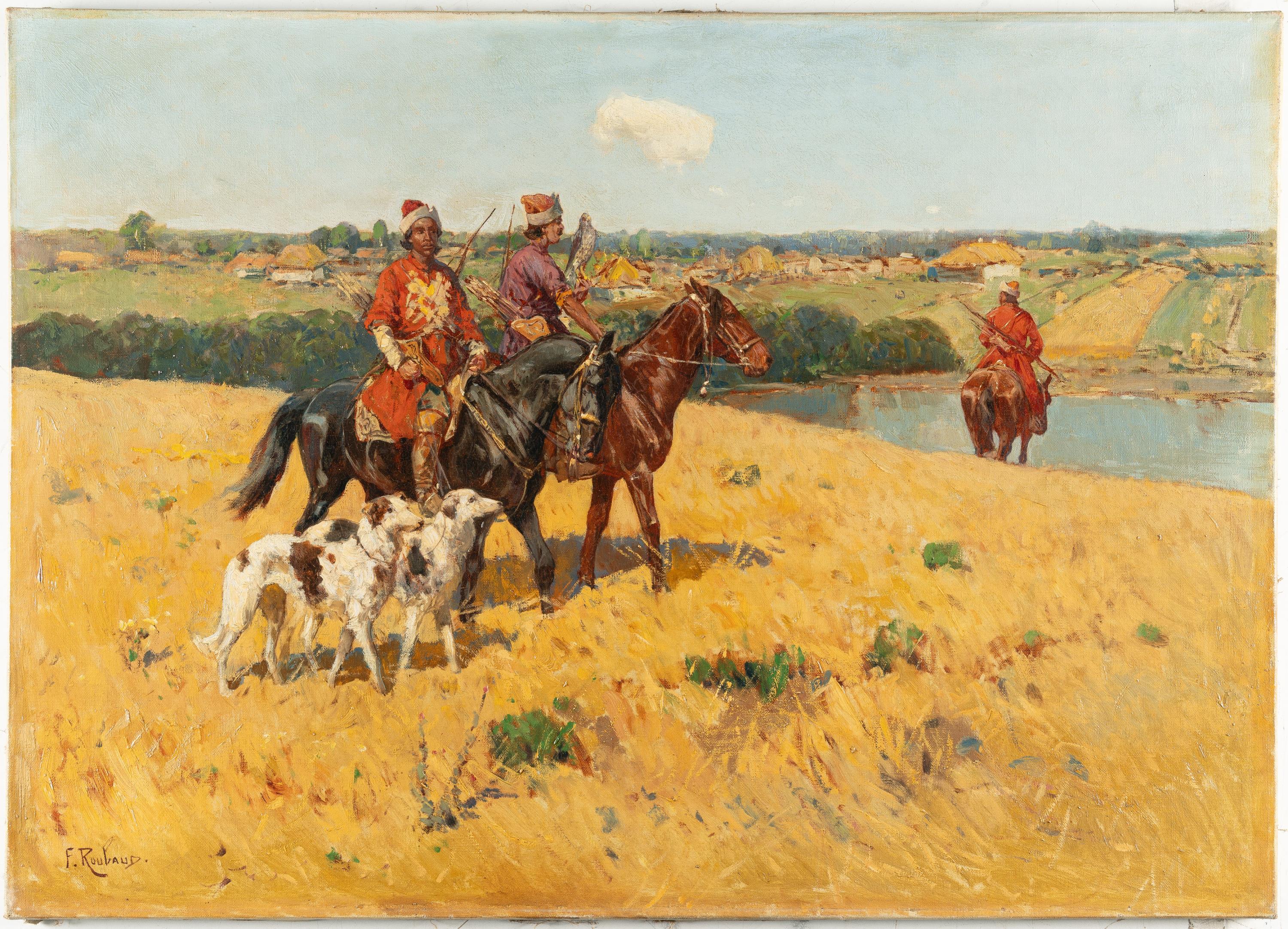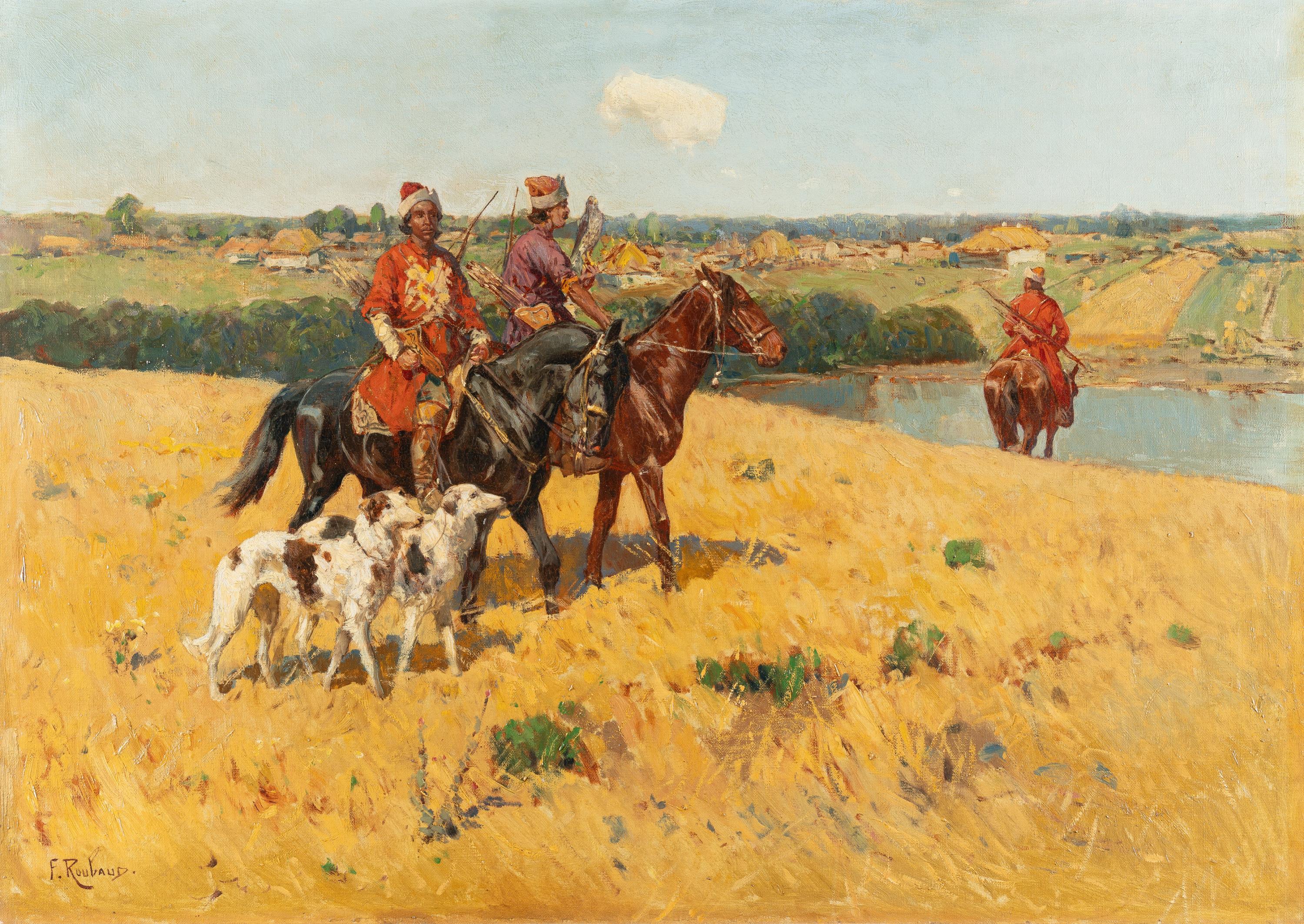Im Gegensatz zu dem rasanten kaukasischen Reiter, der in seiner Wildheit noch Anklänge an die Malerei von Roubauds Lehrer Josef von Brandt zeigt, strahlt dieses Gemälde, erfüllt von harmonischer Farbigkeit, erhabene Ruhe und Konzentration aus – drei Reiter in traditioneller kaukasischer Tracht stehen auf einem Feld, einer von ihnen ist nur von hinten sichtbar, er scheint zu einem unterhalb des Feldes liegenden See hinabzureiten. Die beiden anderen verharren auf ihren Pferden, bewaffnet mit Pfeil und Bogen, während der hintere einen Falken (oder Sperber?) auf dem Arm trägt. Zwei begleitende Jagdhunde blicken aufmerksam in die Landschaft – vielleicht schon in freudiger Erregung, die Beute zu suchen, die der Falke zu Fall gebracht hat. Die Jäger in ihrer Volkstracht begegnen einer Natur, die für ein städtisches Publikum weit entfernt war und den Charakter des Exotischen hatte. Es ist die Zeit, in der Tolstoi mit seinem autobiografischen Roman „Die Kosaken“ in ganz Europa eine Art Kaukasussehnsucht ausgelöst hatte. In Deutschland war es Karl May, der seine Leser in die exotischen Welten des Orients und seiner Ausläufer entführte und nicht zuletzt damit ein Interesse an der entlegenen Region entfachte.