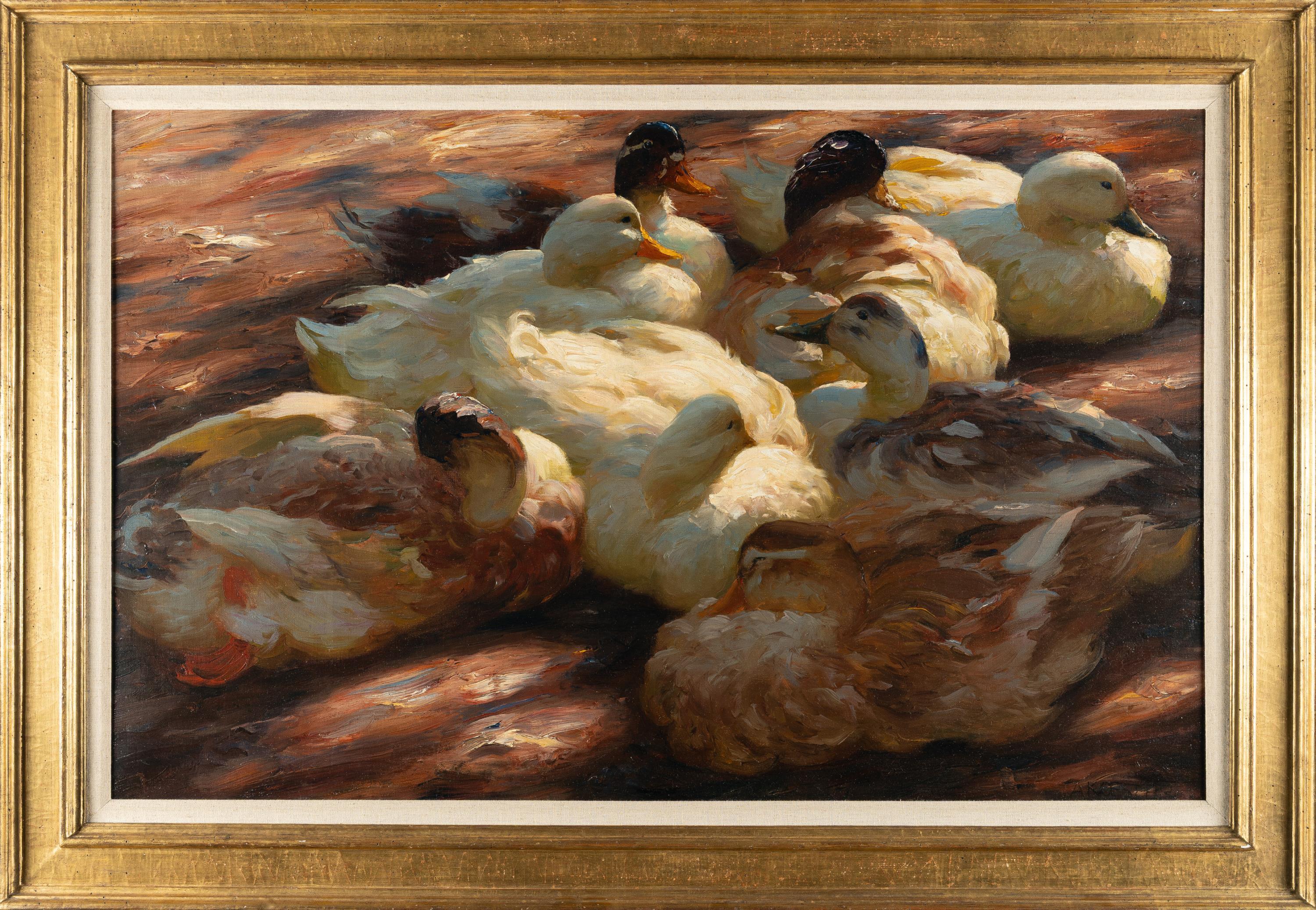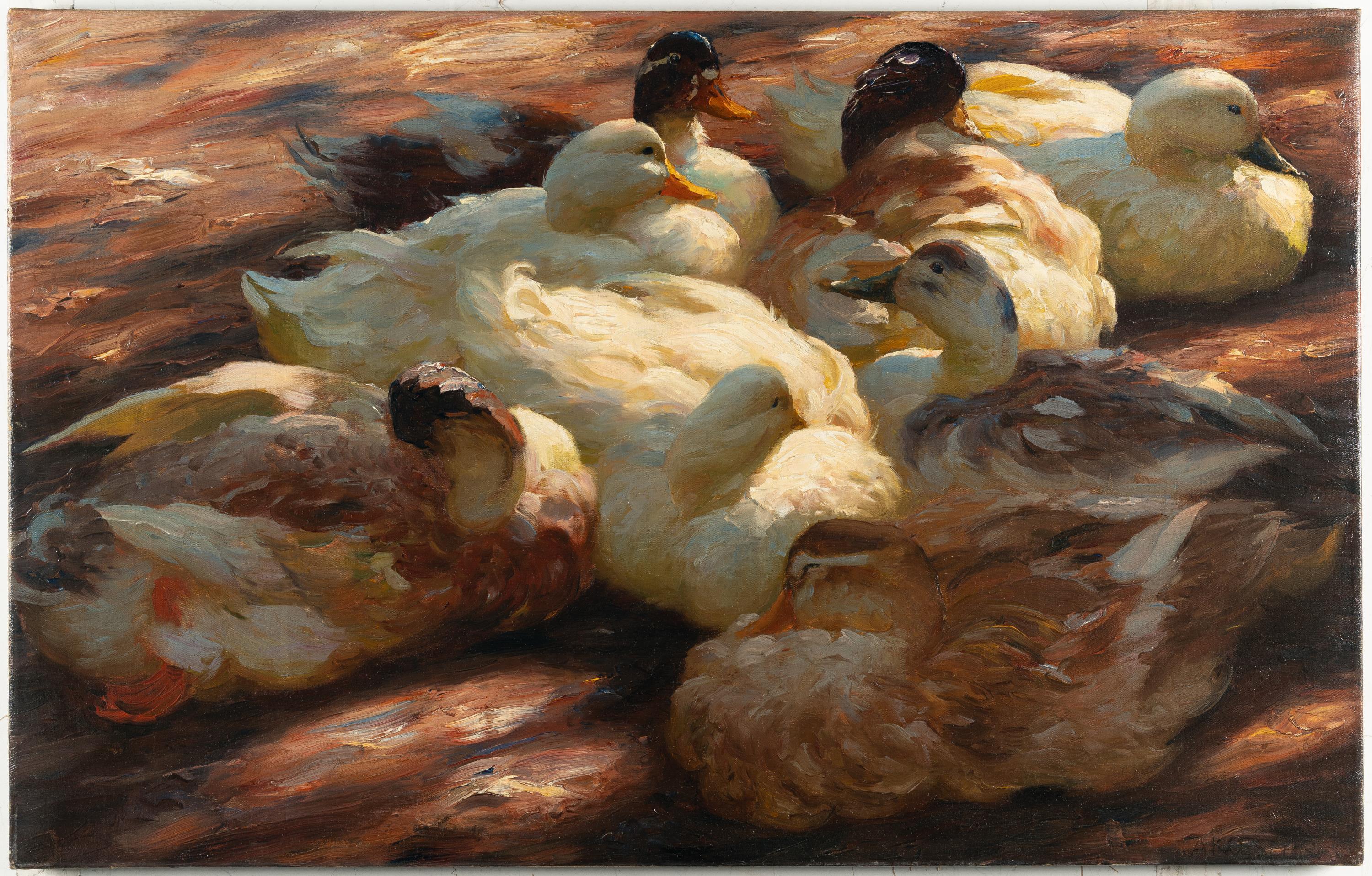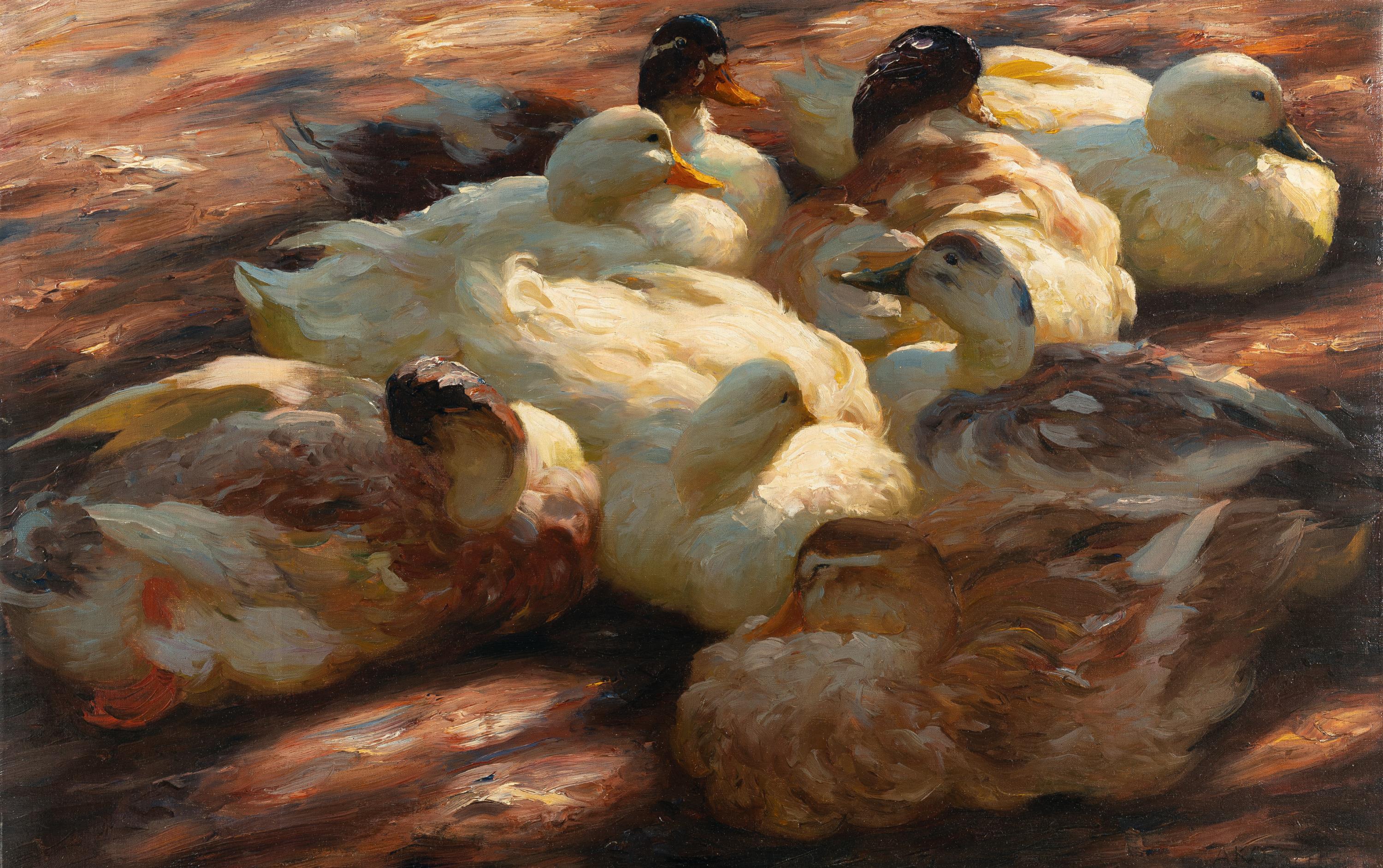 Nach seiner Übersiedlung nach Klausen im Eisacktal im Jahr 1896 sind die Enten im Teich seines Schwiegervaters, eines Gastwirts, tägliche Anschauungsobjekte des Künstlers. Sie werden zum zentralen Motiv seines Werks. Die Beobachtung der Tiere in ihrer natürlichen Umgebung bietet ihm Einblick in immer neue, feinste Nuancen von Farben und Beleuchtung, von Reflexen auf dem Wasser und aufgeplustertem Gefieder, von atmosphärischen Effekten. Das Flüchtige, Wandelbare seiner Beobachtungen hält er in verschiedenen Medien, besonders gern aber in Pastellkreide fest, die das rasche Arbeiten vor dem Objekt ermöglicht. Bei dieser Komposition in Öl, die er mehrfach variierte, zeigt er acht Enten, dicht nebeneinander im seichten Wasser schwimmend. Die Wasseroberfläche spiegelt die einsetzende Abendröte.