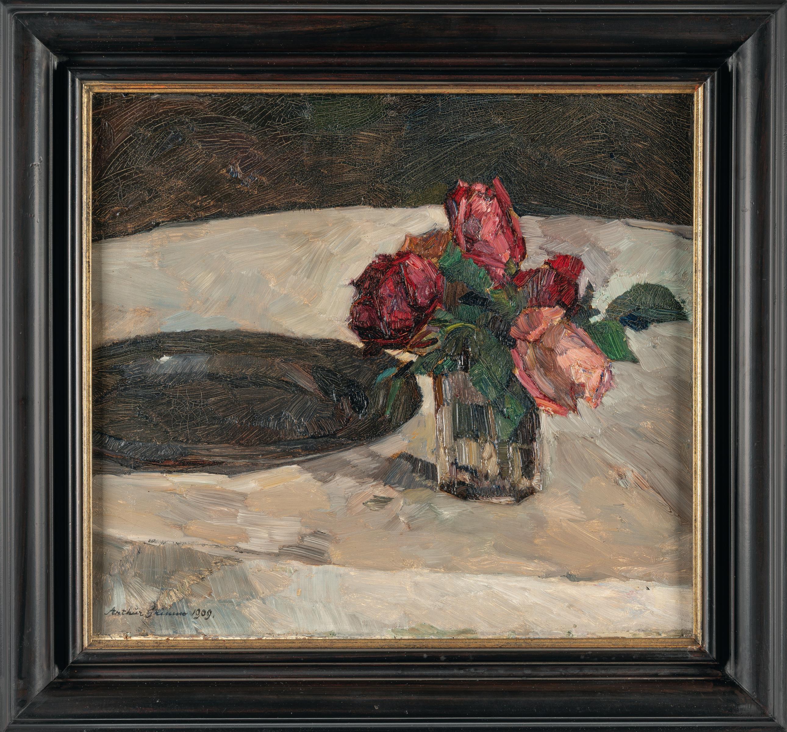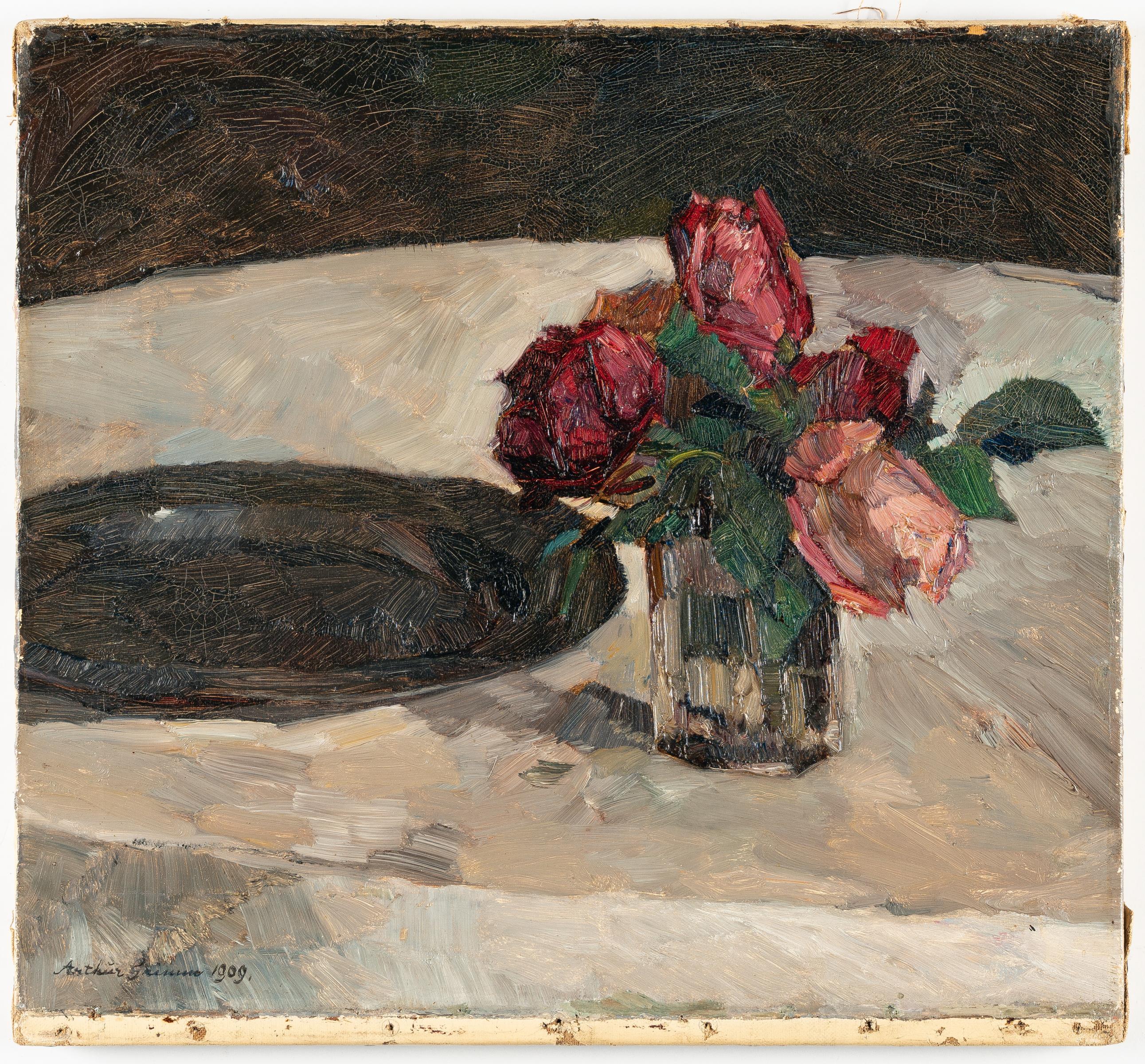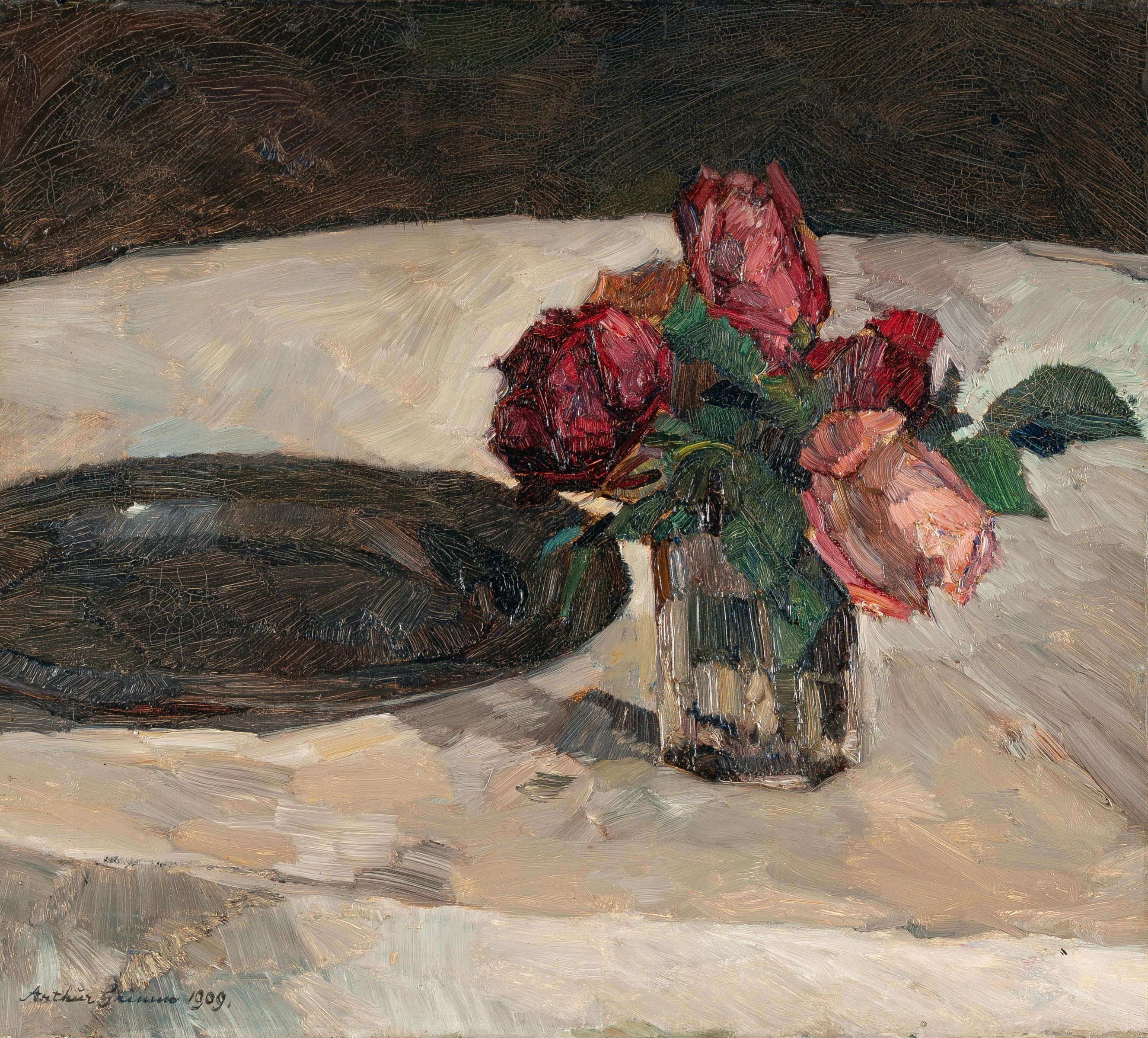 Arthur Grimm kombiniert in diesem Stillleben eine schlichte Vase mit Rosen und einen polierten Zinnteller – scheinbar beiläufig nebeneinander auf der Tischplatte platziert. Die kühle, satte Farbigkeit und das spannungsvolle Miteinander der Objekte erinnern an Stillleben von Éduard Manet. Im Frühjahr 1908 war Grimm nach Paris gereist, wo er in der lebendigen Atmosphäre des Café du Dôme dem Kreis der dort wirkenden deutschen Künstlern angehörte.