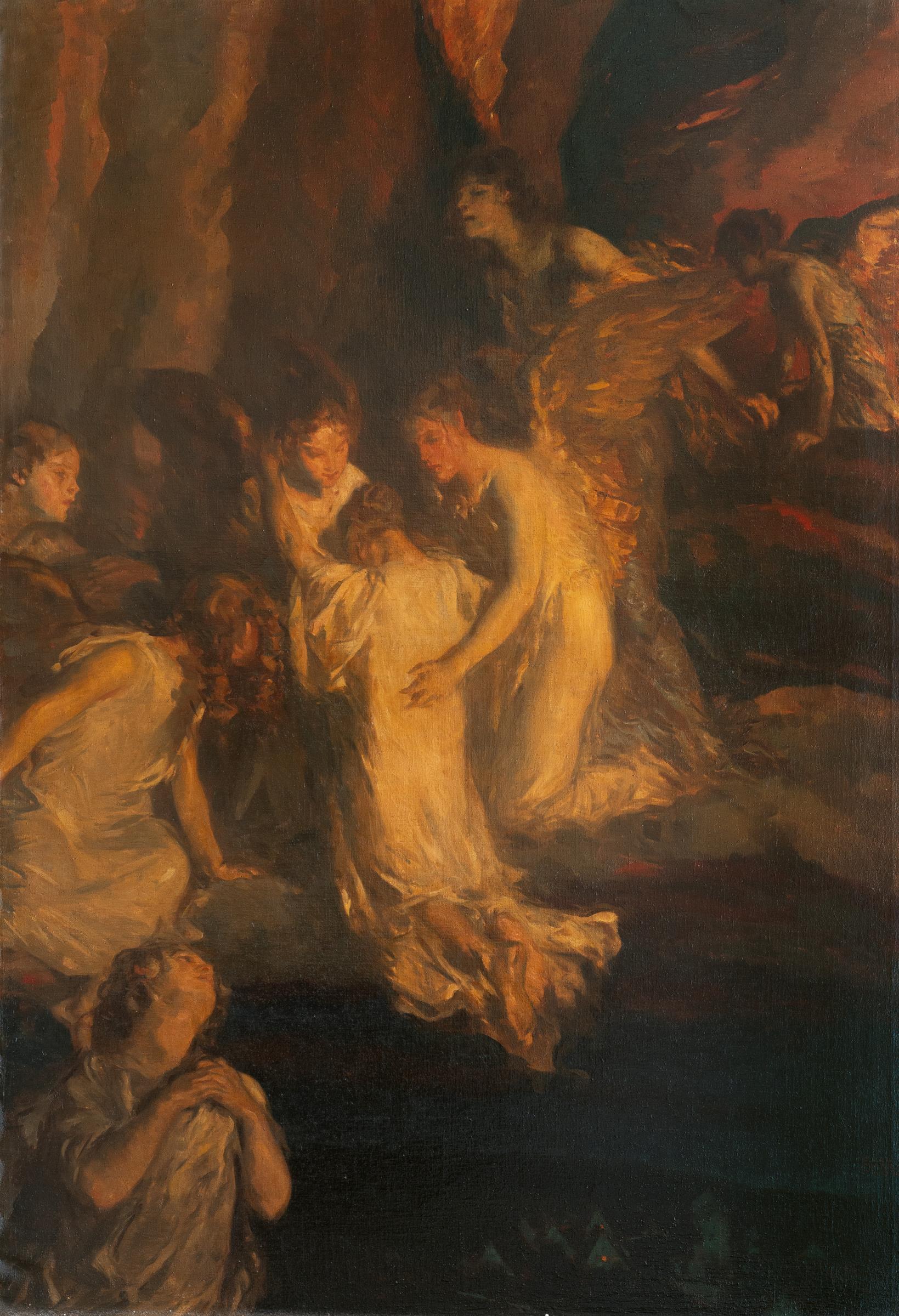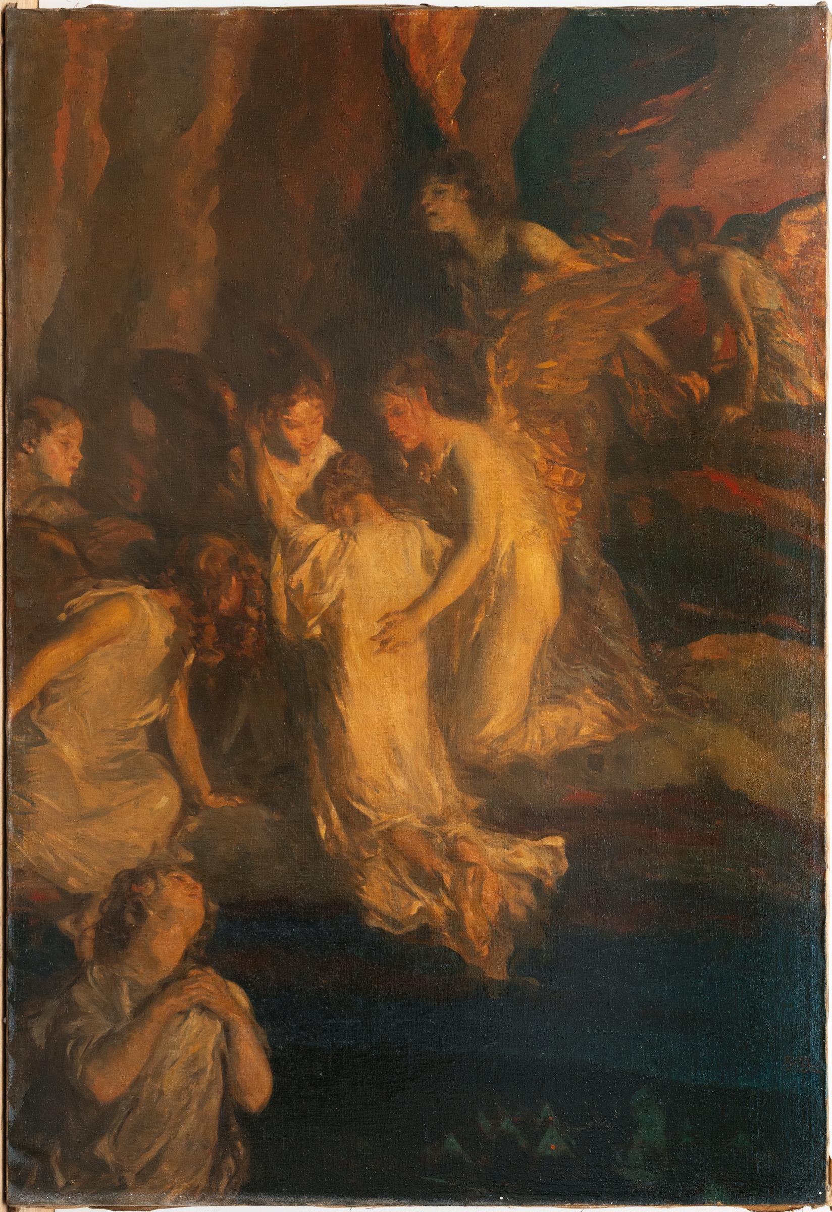 Carl von Marr begann seine künstlerische Ausbildung in Weimar bei Ferdinand Schauß, setzte sie anschließend in Berlin bei Karl Gussow fort und vervollständigte sein Studium schließlich in München unter Gabriel von Max und Wilhelm von Lindenschmit. Sein Œuvre umfasst vornehmlich Genredarstellungen sowie religiöse Sujets, in denen – wie auch in dem vorliegenden Werk – symbolistische Elemente eine zentrale Rolle spielen. Die Komposition zeigt den transzendenten Augenblick des Heimgangs, in dem die Seele eines Verstorbenen von einer Engelschar tröstend empfangen und in die jenseitige Sphäre geleitet wird. Eine weitere Fassung fast identischer Größe, als „Back to God“ betitelt, befindet sich im Museum of Wisconsin Art in West Bend (Sammlung Louise Zinn Bardes Family).