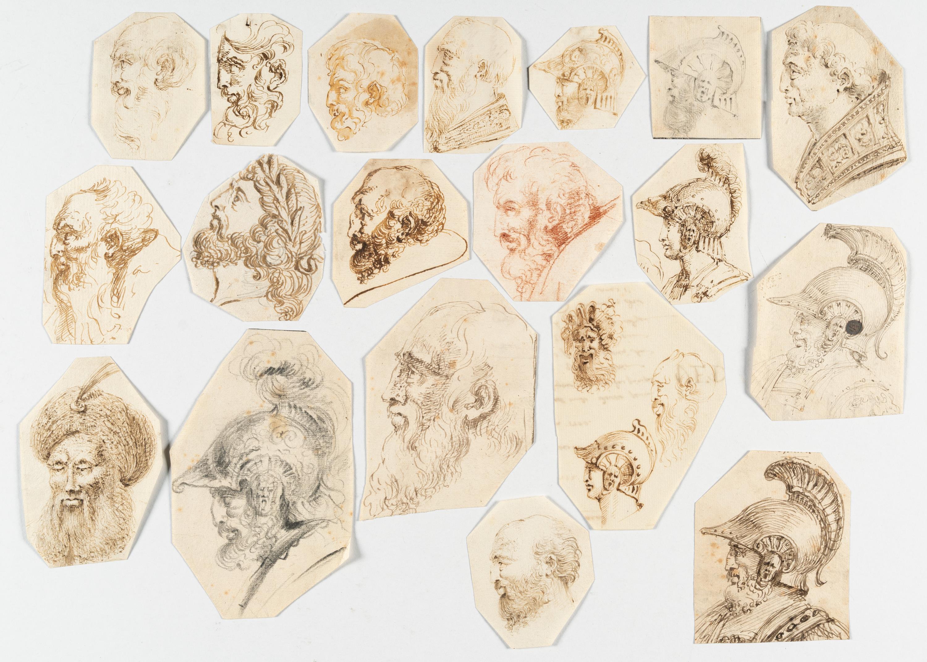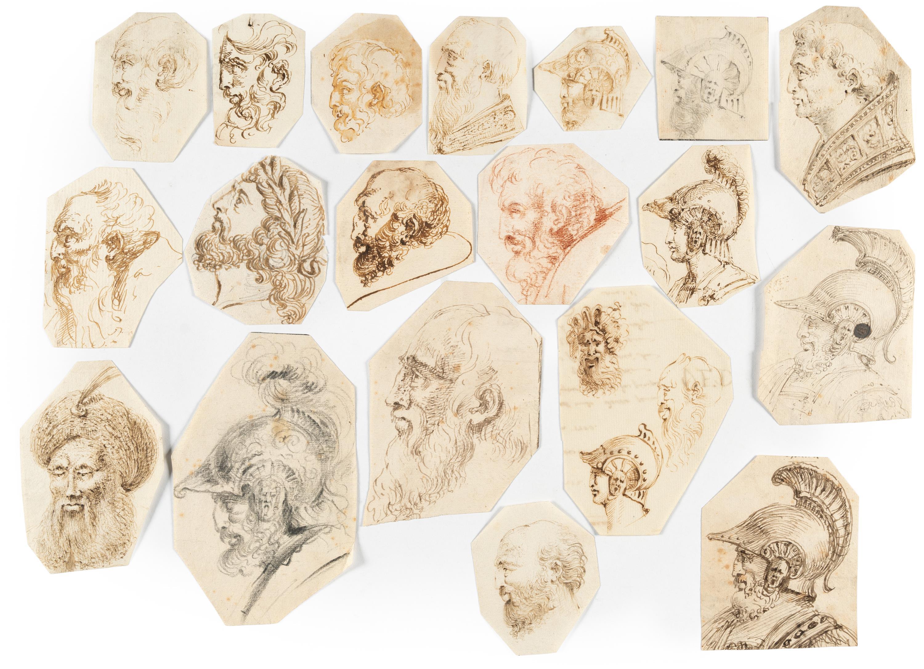 Feder in Braun, teils laviert, schwarze Kreide (2) bzw. Rötel (1) auf Bütten. 4,5 x 5 cm bis 12,7 x 8 cm (Blattgrößen). Verso teilweise mit weiteren, fragmentierten Köpfen und handschriftlichen Notizen.
