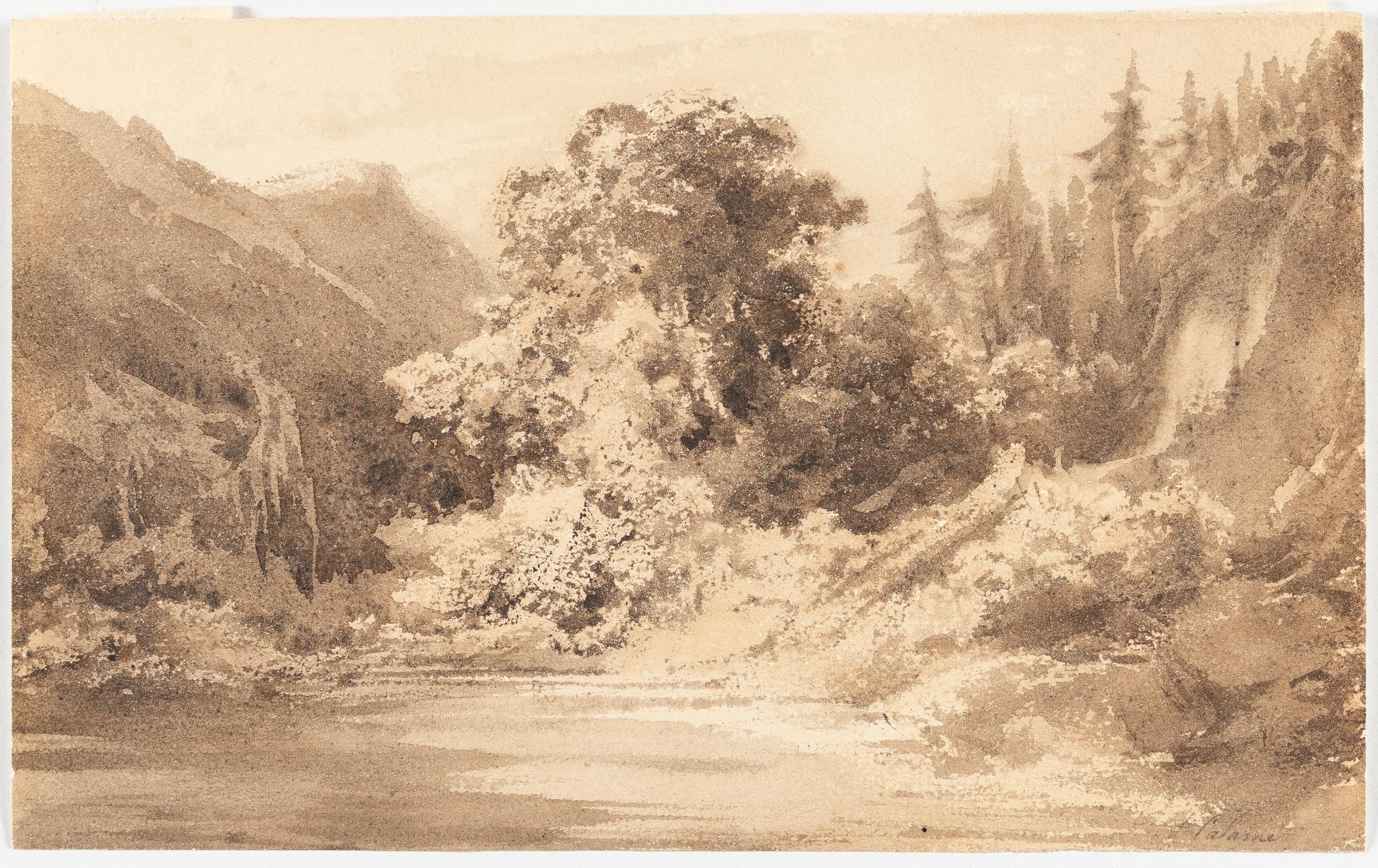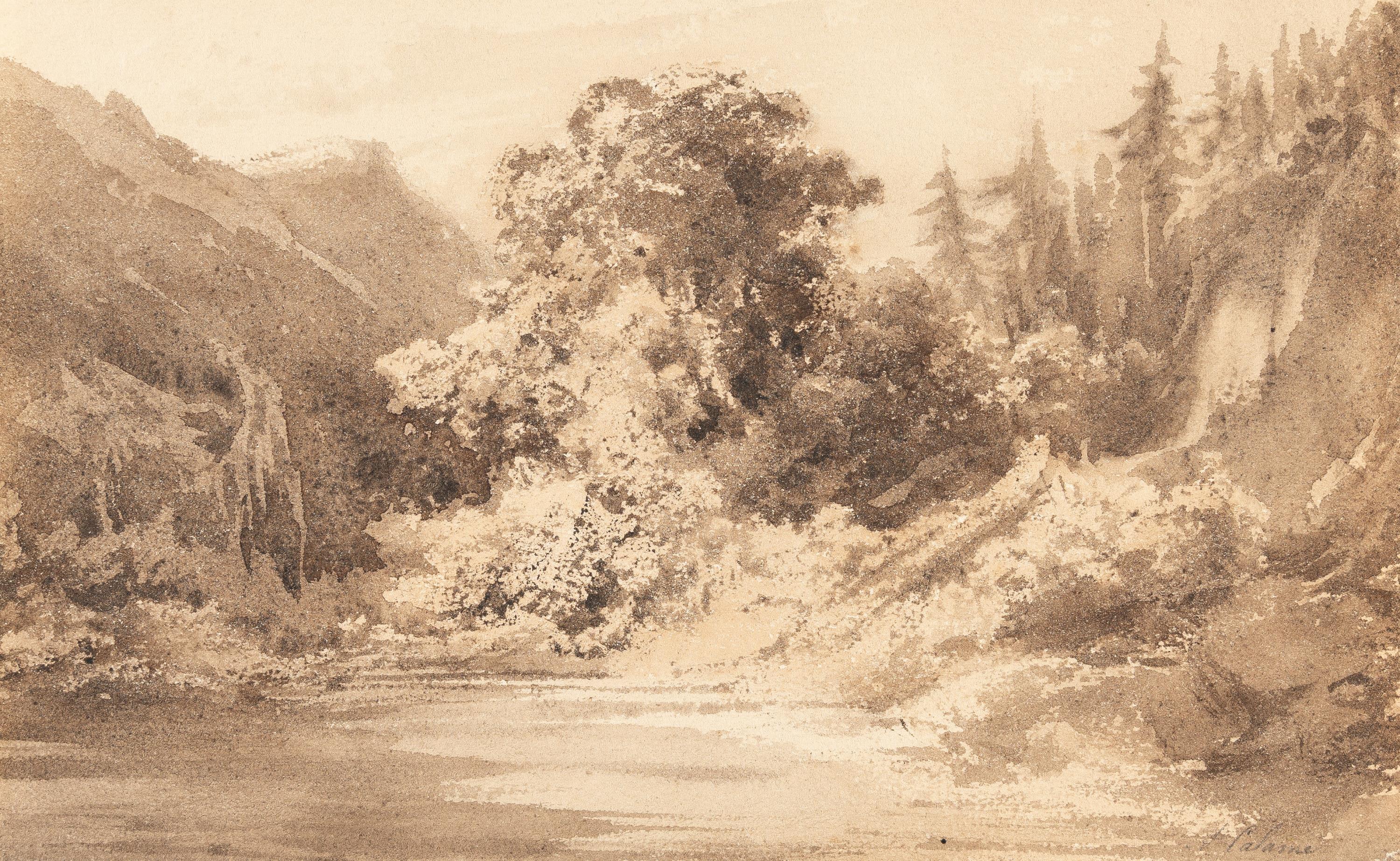 Die vorliegende Zeichnung ist eine virtuose und unmittelbare Naturstudie. Mit schnellem Pinselstrich fängt Calame das Idyll einer dicht bewachsenen Uferböschung an einem Gebirgsfluss ein. Durch die meisterhafte Lavierung gelingen ihm eindrucksvolle Lichteffekte und ein stimmungsvolles Schattenspiel, das sich insbesondere beim Laubwerk und bei den fernen Tannenwipfeln beobachten lässt. – Nur vereinzelt winzige Braunfleckchen, ansonsten in schöner Erhaltung.
