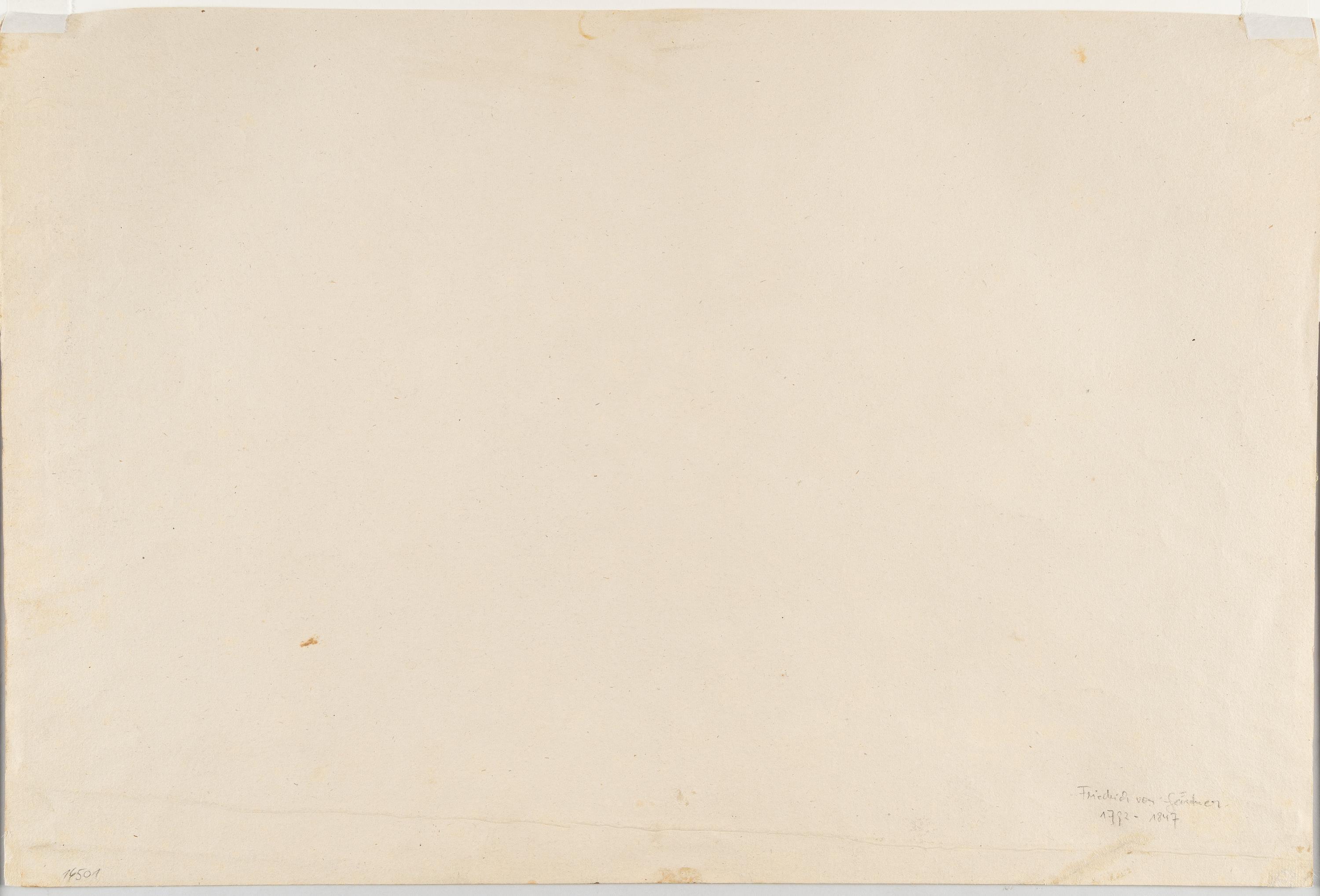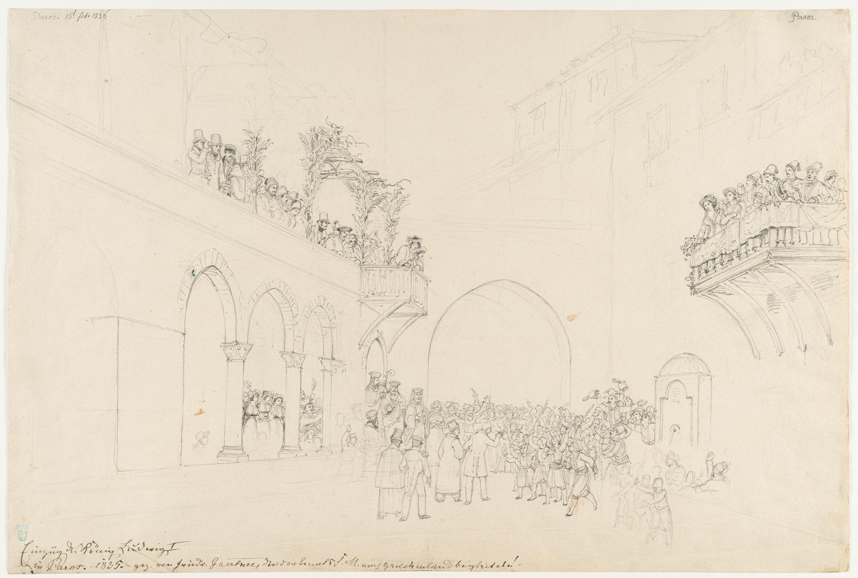 Bleistift auf bräunlichem Velin mit Wz.-Schriftzug „M. Heusler“. 1836. 28,9 x 43 cm. Links oben ortsbezeichnet und datiert „Paros. 15. febr. 1836“, rechts oben nochmals mit der Ortsangabe. Im Unterrand von fremder Hand in brauner Feder wie oben betitelt und mit „–1835– gez. von Friedr. Gaertner …“ bezeichnet, danach undeutlich.