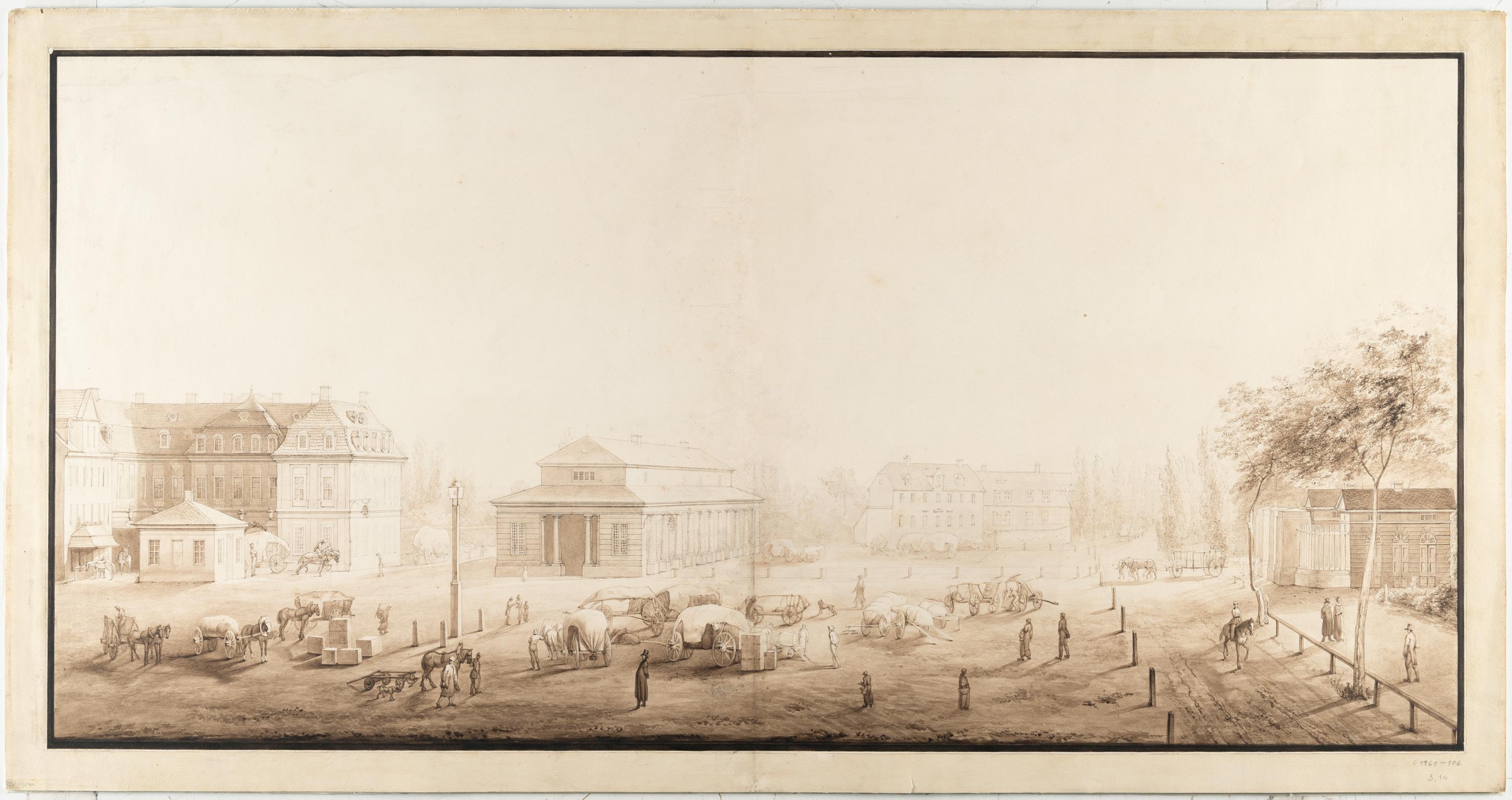 Feder und Pinsel in Braun, braun laviert, auf zwei Bögen festen, zusammengefügten Velins. (Frühes 19. Jh.). 55,9 x 107,2 cm (Blattgröße). Mit einer Einfassungslinie in schwarzem Pinsel.