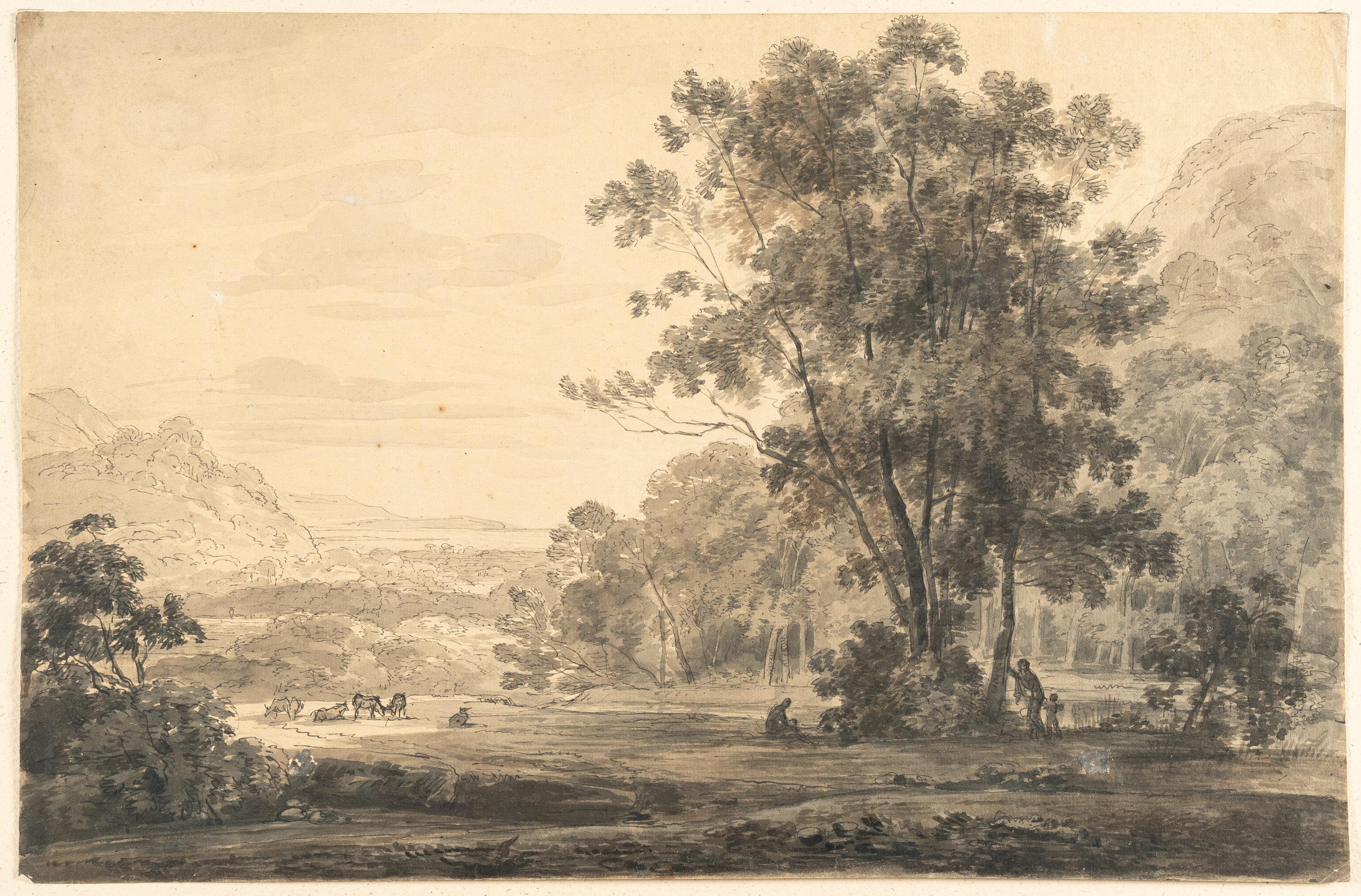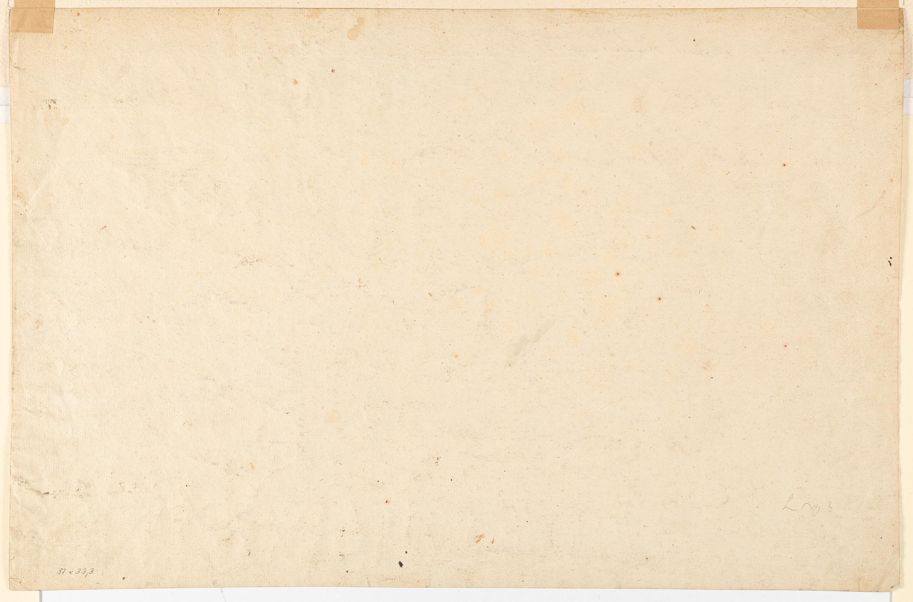 Feder in Schwarz, grau laviert über Bleistiftspuren, auf Bütten. 33,6 x 51,1 cm.