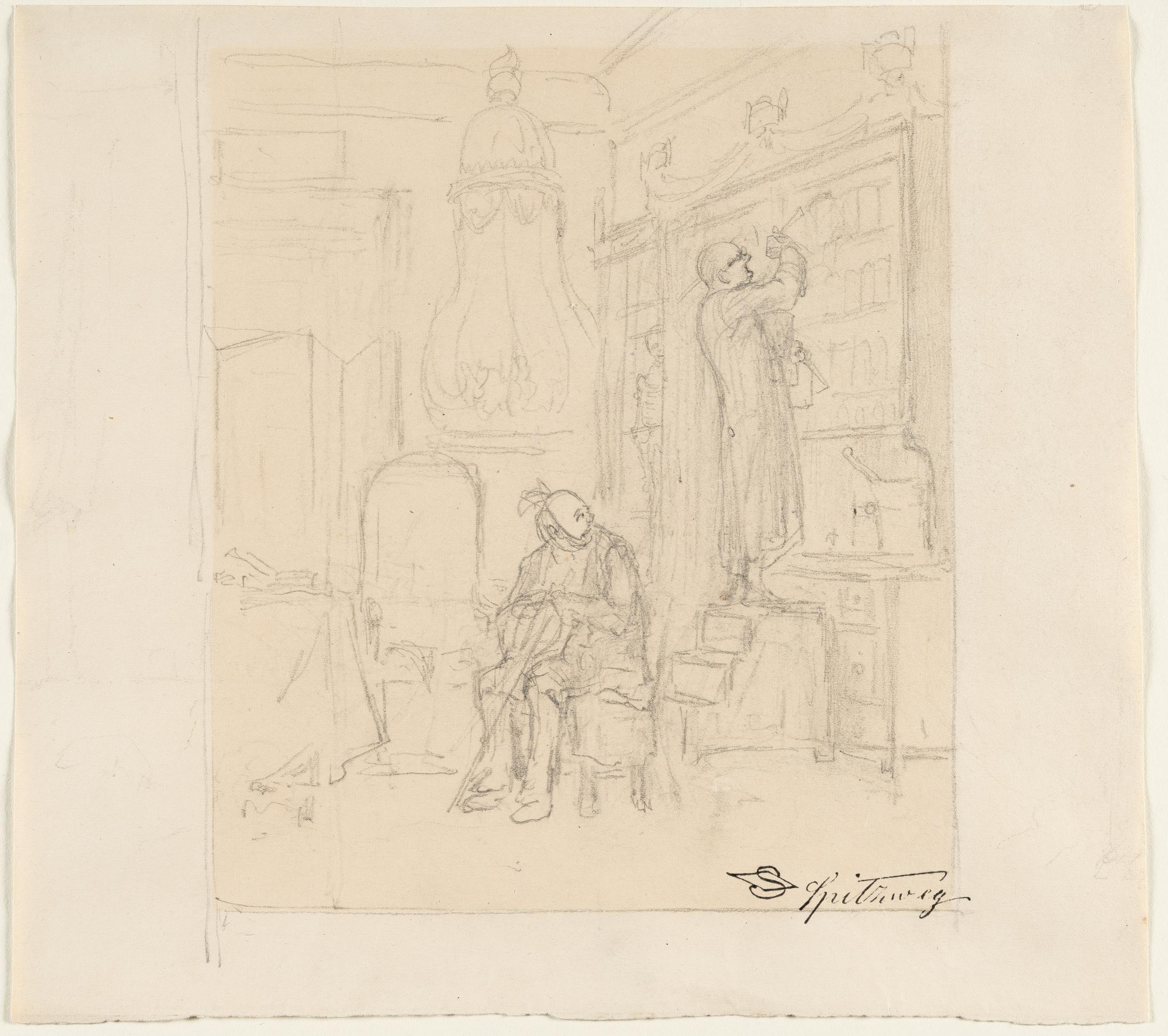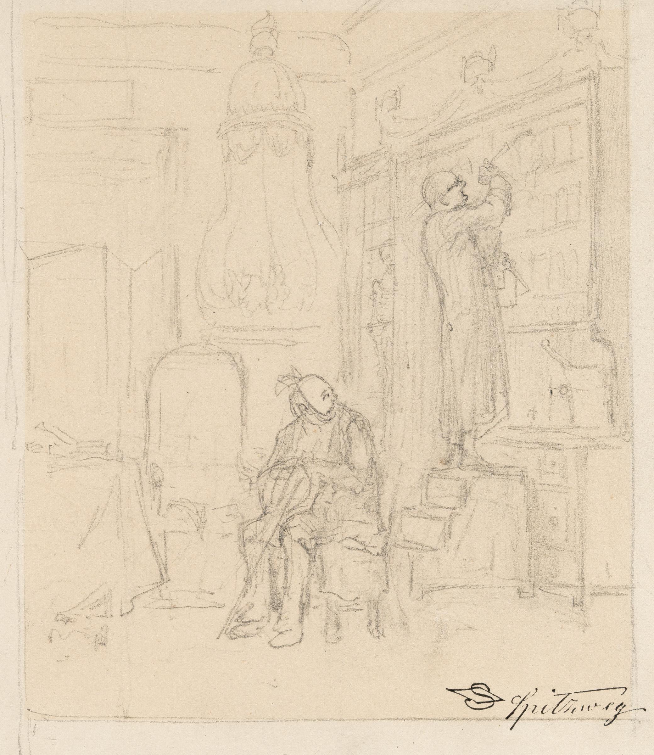 Geboren als mittlerer von drei Söhnen eines wohlhabenden Kaufmanns, zeigte Spitzweg schon früh Interesse an der Kunst sowie außergewöhnliches Zeichentalent. Doch zunächst wählte er einen anderen Weg: Ab 1825 begann er eine Lehre bei Franz Xaver Pettenkofer in der Münchner Hofapotheke, bevor er ein Pharmaziestudium an der Universität München aufnahm. Durch das väterliche Erbe finanziell unabhängig geworden, beschloss er bereits 1833 während eines Kuraufenthaltes nach überstandener Krankheit, sich ganz der Kunst zu widmen. Hier zeigt er einen Apotheker, der, sich auf einer Treppe reckend, die dringend benötigte Medizin gegen Zahnschmerz sucht – sein Kunde, sichtlich leidend und mit einem Tuch um die pochende Backe – wird es ihm danken. – Im ehemaligen Passepartoutausschnitt nachgedunkelt. Die Blattkanten teils etwas ungerade beschnitten. In altersgemäß guter Erhaltung.