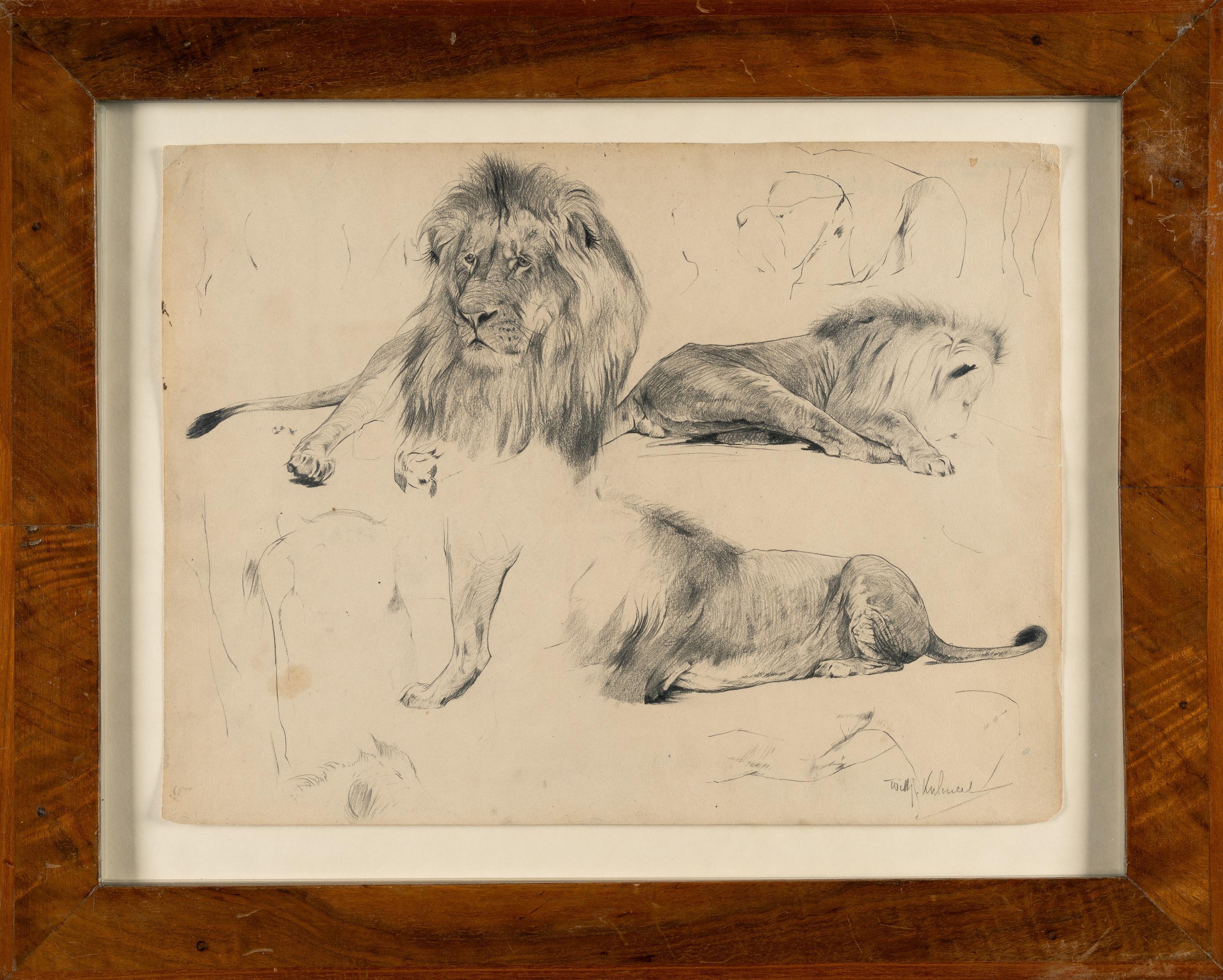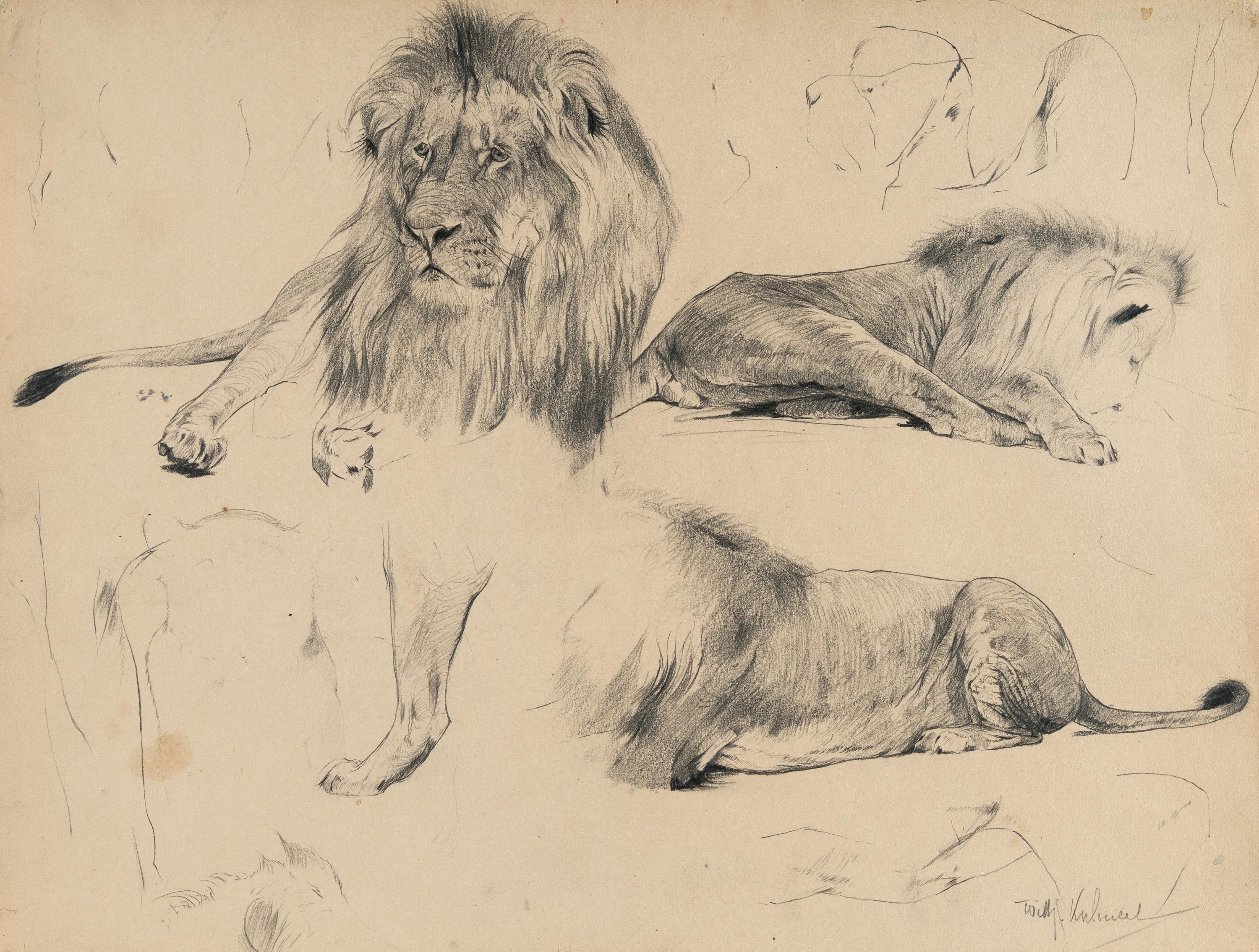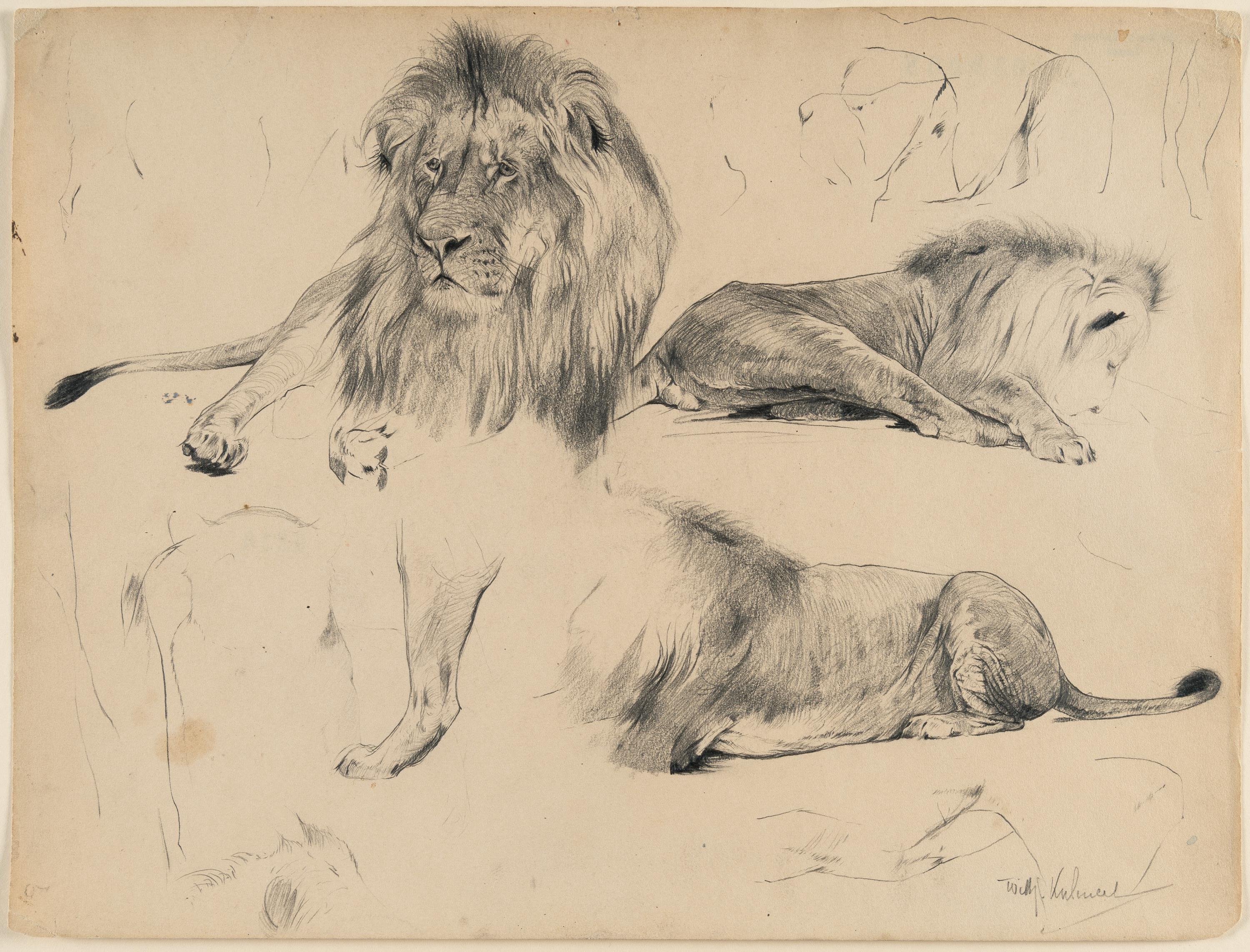 Studienblatt. Löwe von vorn, liegender und schlafender Löwe