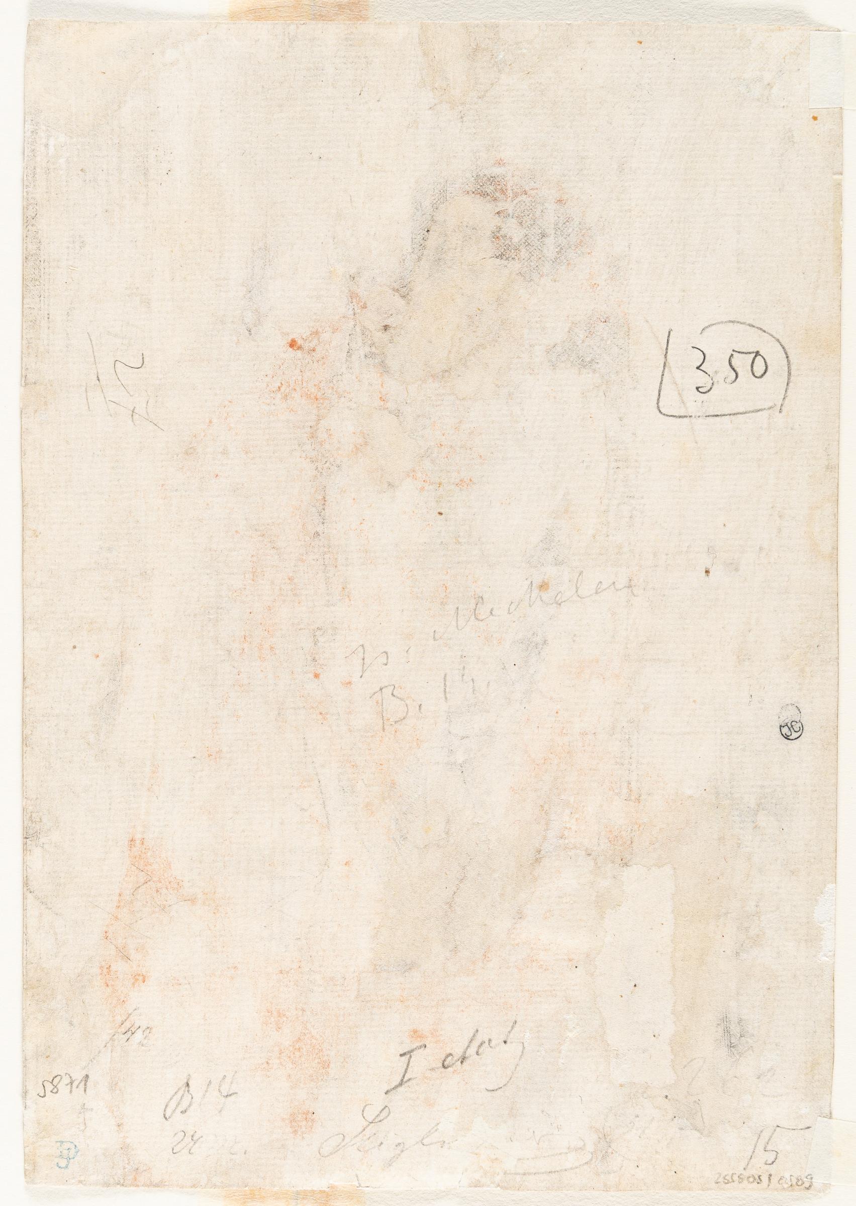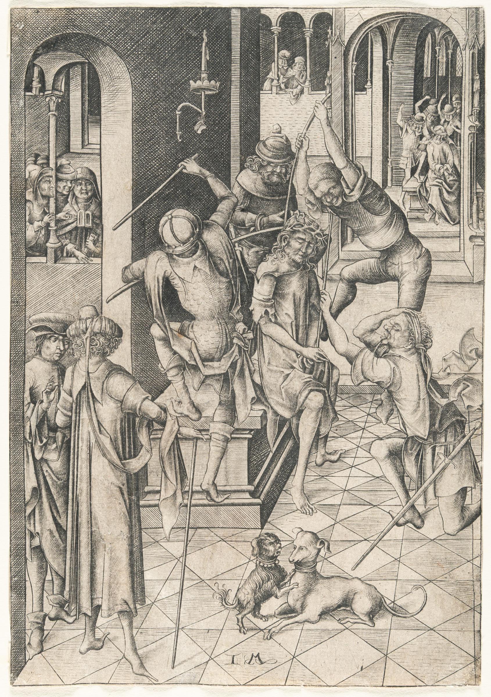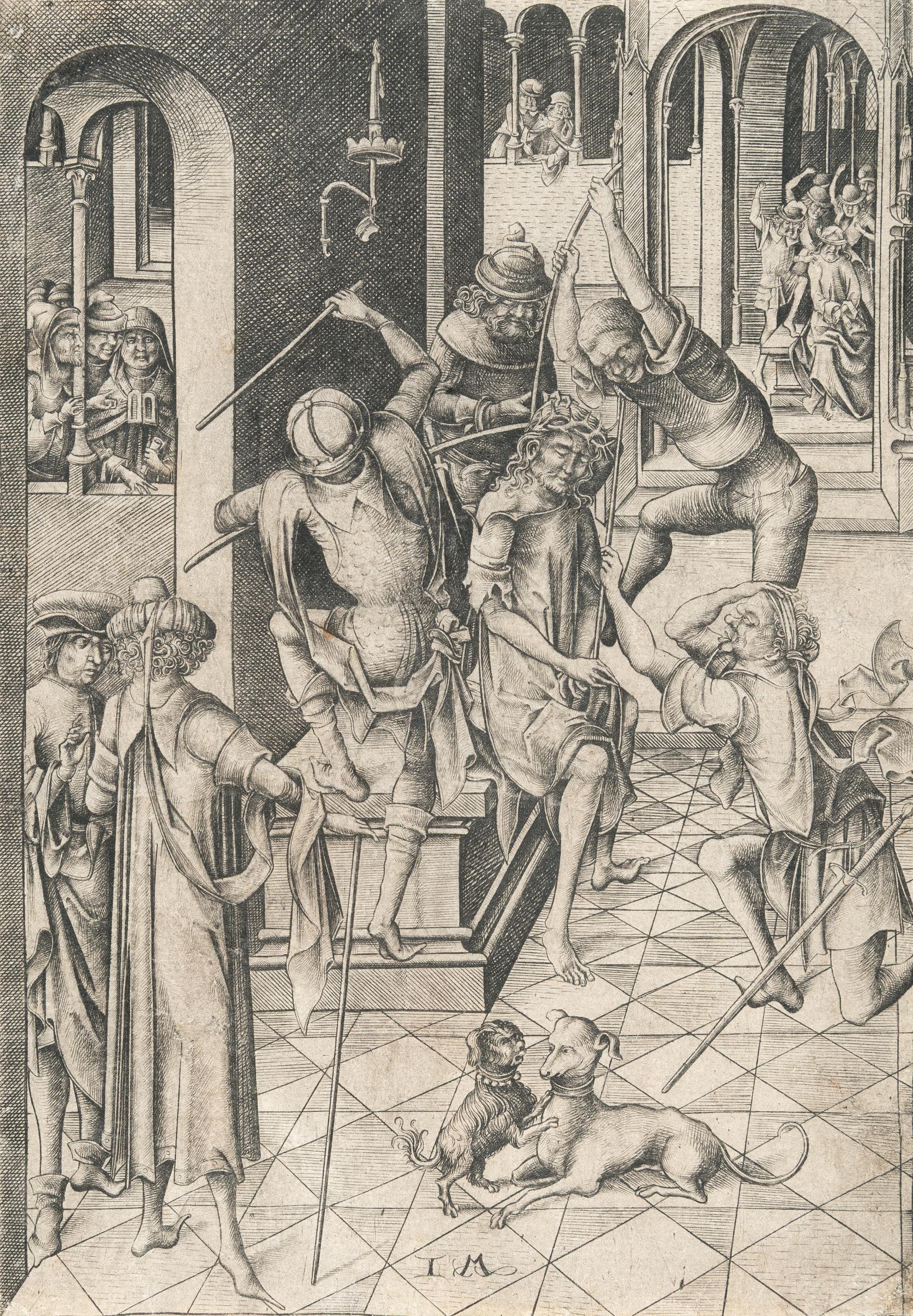 A very fine, early, slightly silvery impression, after the diagonal lines in the wall with the chandelier, yet before the vertical lines on the step underneath the arm of the soldier kneeling at right. Part of the largest Passion series, consisting of twelve sheets (L 142-153), with secondary scenes in the background. Thread margins or trimmed to the borderline. – On the reverse, paper slightly stained and thinned in places. An inconspicuous, smoothed horizontal centrefold. A few tiny marginal tears. Somewhat wavy and creased in the lower margin. Still in good condition. Very rare!