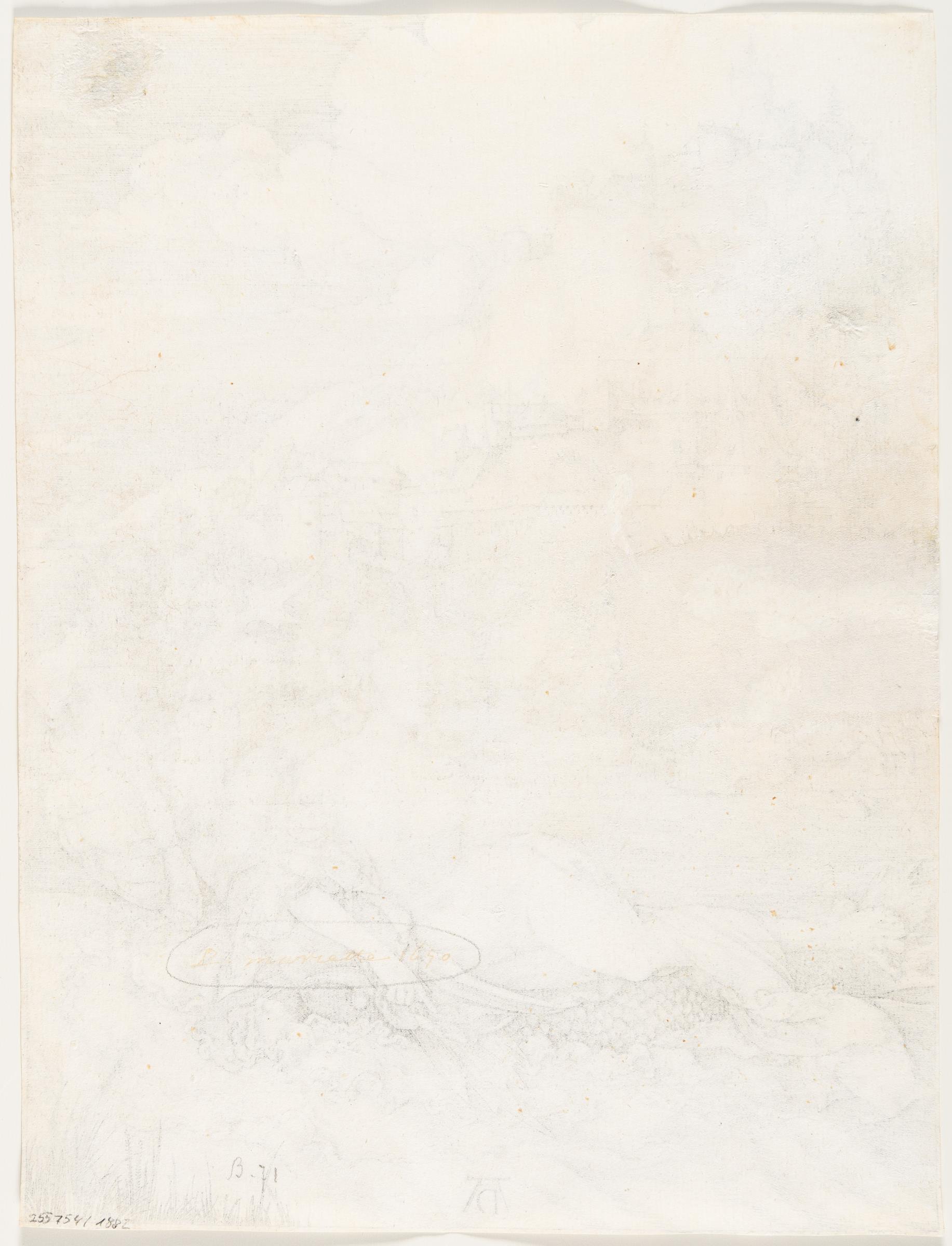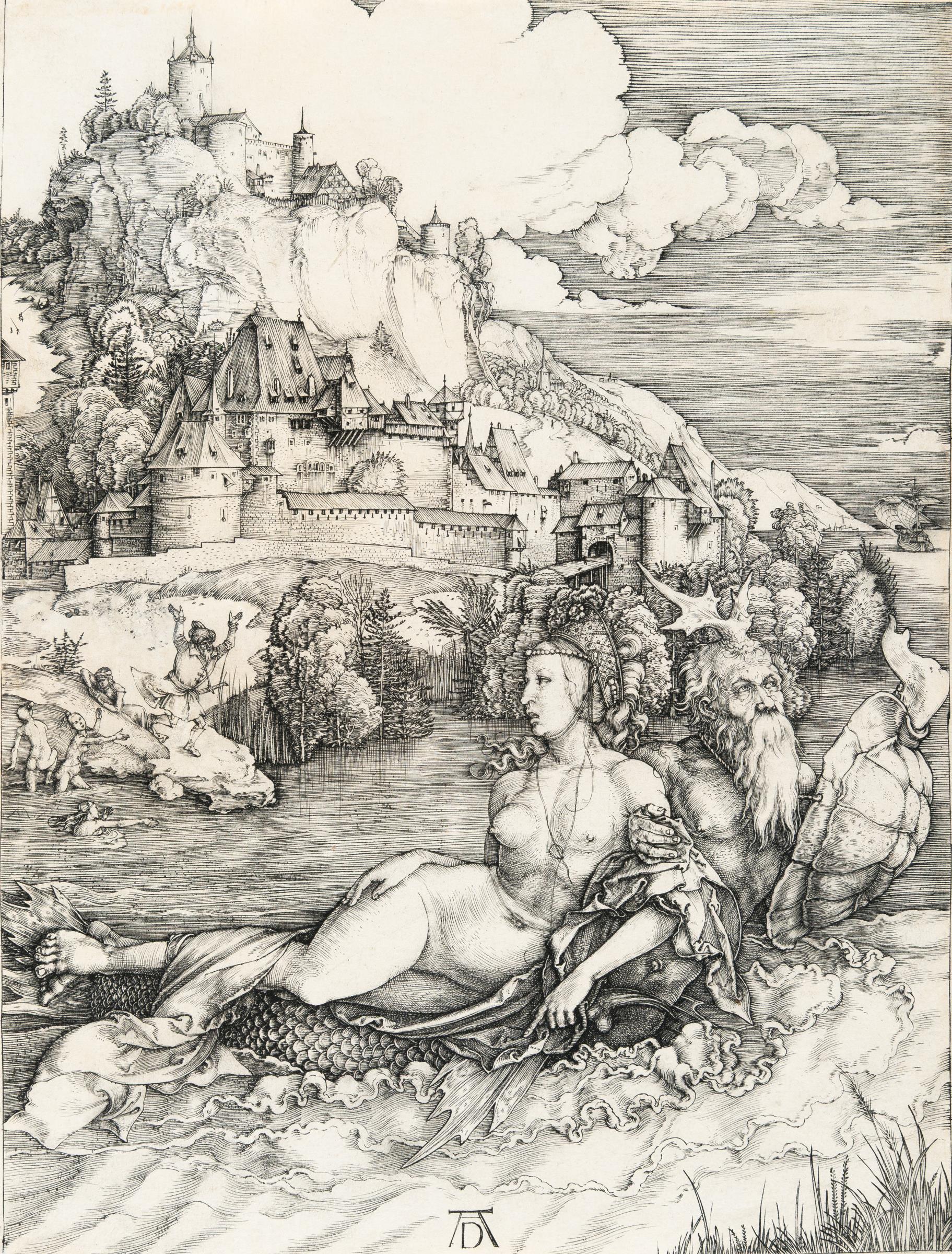A very good, evenly-printed and well-inked Meder d impression with strong contrasts and little to no sign of wear, printing with great clarity. With a fillet of paper around the borderline, trimmed to it at the upper edge. A bearded sea creature – half man, half fish – carries a young woman across the waves. In one hand, it wields a turtle shell pierced by a jawbone, used as a weapon. The abducted figure, scarcely covered by a cloth, appears curiously unfazed; her gaze is calm, almost detached. Her beauty stands in striking contrast to the bizarre and grotesque being that holds her tightly in its grasp. The scene draws on a mythological subject that has yet to be conclusively identified in iconographic terms. Albrecht Dürer himself referred to the print in the diary of his journey to the Netherlands as “Meerwunder“. The female nude reflects Dürer’s engagement with a new ideal of beauty rooted in reason and measurability – a concept inspired by classical antiquity and central to the spirit of the Renaissance (cf. R. Schoch, p. 74). The paper is slightly stained. Verso with isolated areas of thinning paper. Restoration on the left margin extending to the hands of the Oriental man, where the paper is wavy. Otherwise still in good condition.