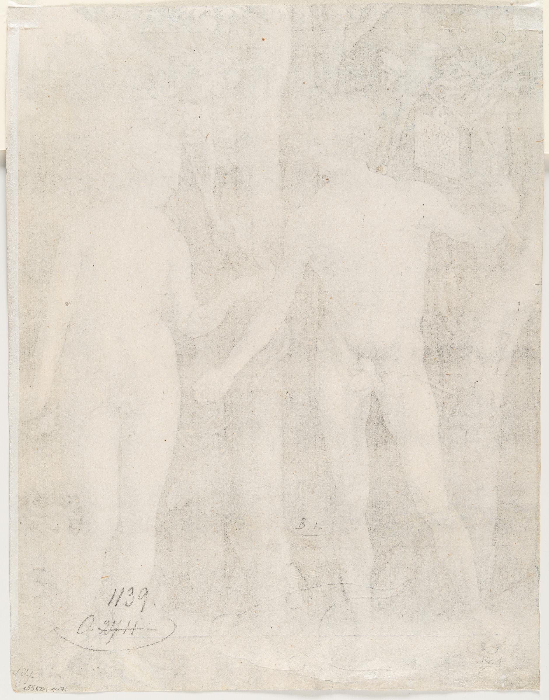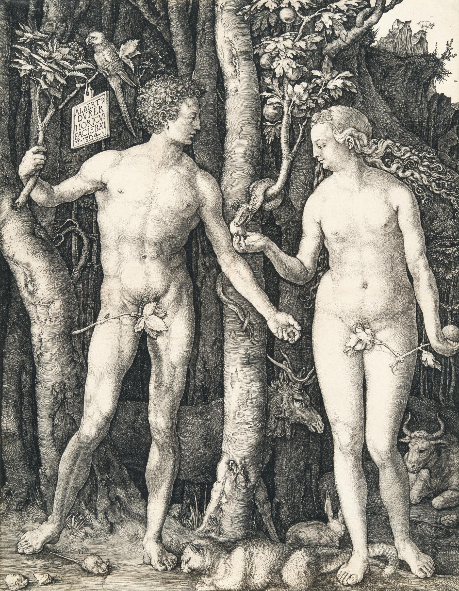 A very fine, rich, luminous impression, printing very sharply, with great clarity, intense contrasts and considerable inky relief. Albrecht Dürer’s Adam and Eve reflects Dürer’s profound study of classical antiquity and his assimilation of Italian proportion theory—particularly through his exposure to the works of Leonardo da Vinci and antique sculpture—while simultaneously maintaining a characteristically Northern emphasis on meticulous detail and symbolic richness. The two nude figures are presented in classical contrapposto, set against a shallow, densely wooded backdrop. The confined pictorial space underscores their corporeality while alluding to Eden as an enclosed yet precarious realm. This print marks the first fully developed representation of the male and female nude together in German printmaking, deliberately echoing ancient prototypes such as the Apollo Belvedere and the Venus Pudica, in an effort to render ideal human form. Dürer’s figures are informed not only by direct anatomical observation but also by proportional systems he would later articulate in his theoretical treatises. The composition is replete with iconographic elements that foreshadow the impending Fall: the serpent, coiled around the Tree of Knowledge, hands Eve the forbidden fruit, while a parrot—symbol of the Virgin birth—and a collection of animals including elk, cat, ox, and rabbit, function as personifications of the four humours. This reference to humoral theory situates the image within a contemporary understanding of human nature as a fragile equilibrium soon to be disrupted by sin. The fig branch modestly covering Adam, as well as the overall interplay between physical idealisation and moral tension, underscore the paradox between divine command and earthly beauty. Technically, the engraving reveals Dürer’s unmatched mastery of line, his nuanced modulation of light and shadow, and his capacity to suggest sculptural volume through purely graphic means. The intricate rendering of flora, the compositional harmony, and the density of symbolic content elevate this print to a masterwork not only within the German Renaissance, but within the broader canon of European print history. The lower right corner rounded. A tiny tear approx. 2-3 mm long on the lower edge; a small restored paper defect on the upper left edge. A tiny brown spot on the tree trunk. Otherwise in very good condition. Rare in this exceptional print quality!
