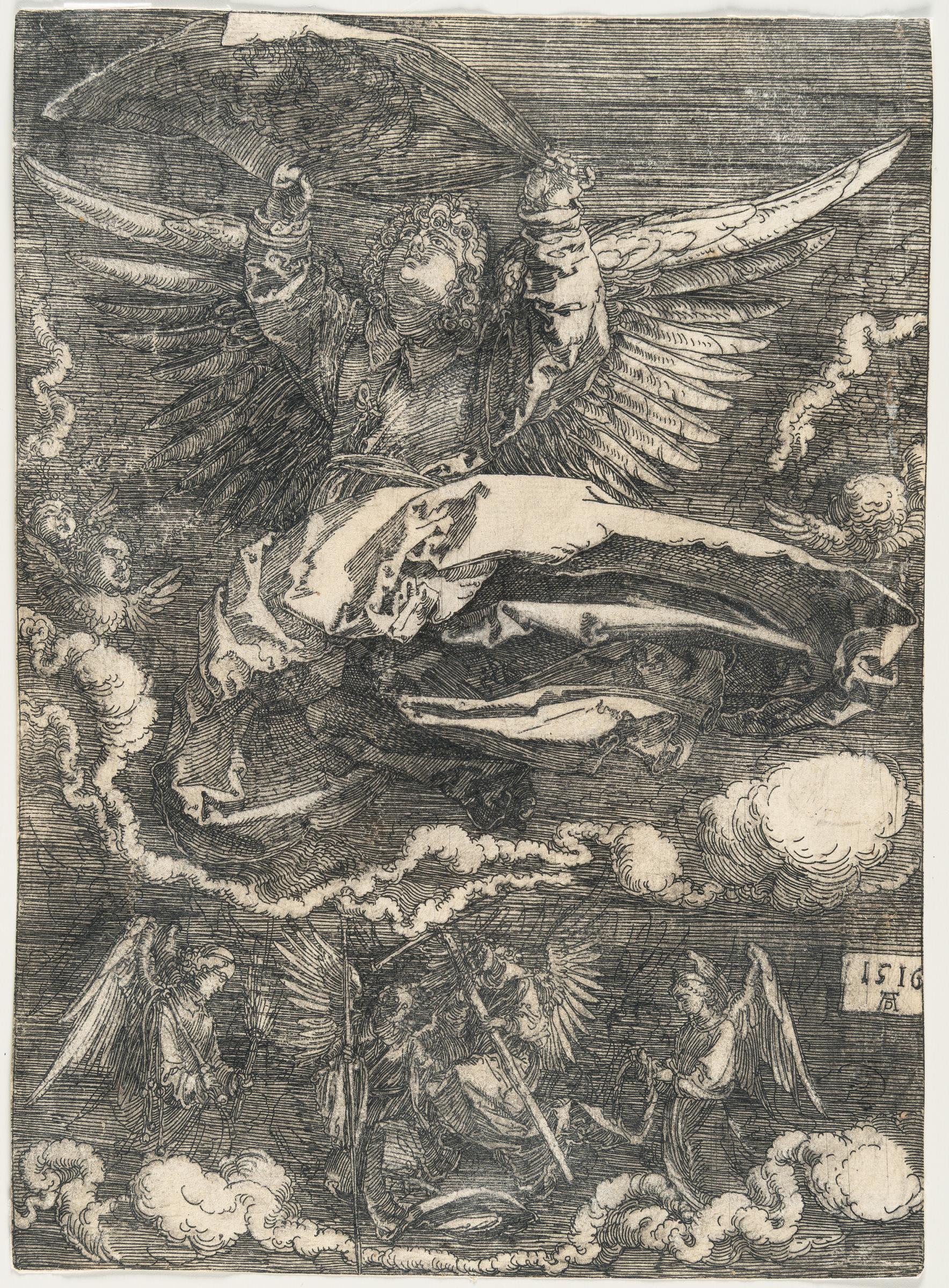 A very good Meder I c impression, before the rustmarks, with the vertical scratches through the wing feathers on the left and through the flying garment; printing with good contrasts, trimmed to the image. – The lower left corner on the reverse slightly thinned; a smoothed horizontal crease on the reverse. With tiny brown spots on the reverse and a pinhole-sized hole on the right edge. Remnants of a previous mounting on the reverse. Otherwise in good condition.