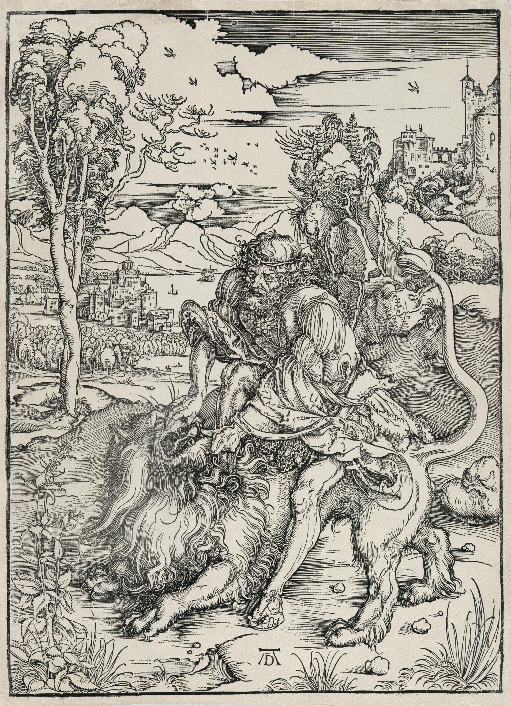 A good, even impression of the last state with the gaps and wormholes in the block indicated by Meder. With wide margins around the borderline. – The gaps in the borderline and the wormholes partly filled in. The upper corners with crease marks. The corners slightly bumped. The lower right corner reinforced on the reverse. A small paper flaw backed at the top right edge. Verso light paper soiling and with traces and remnants of a previous mounting. Otherwise in good condition.