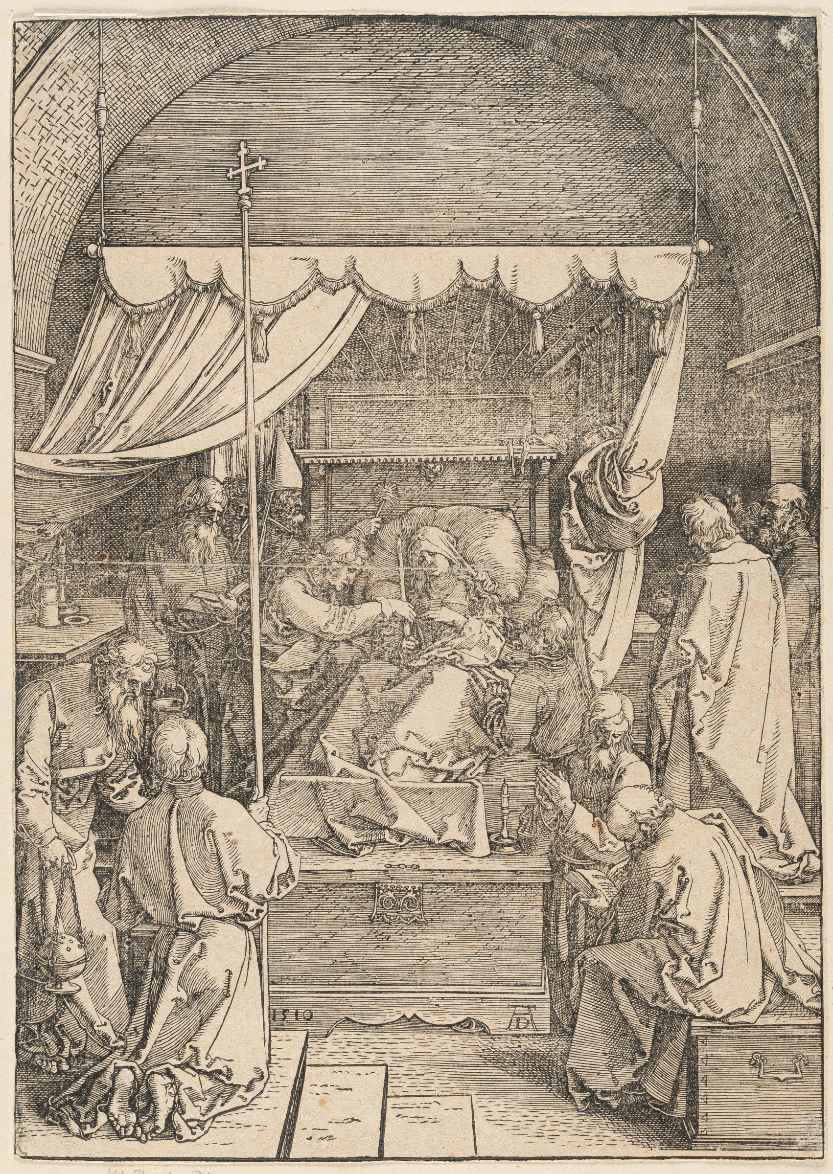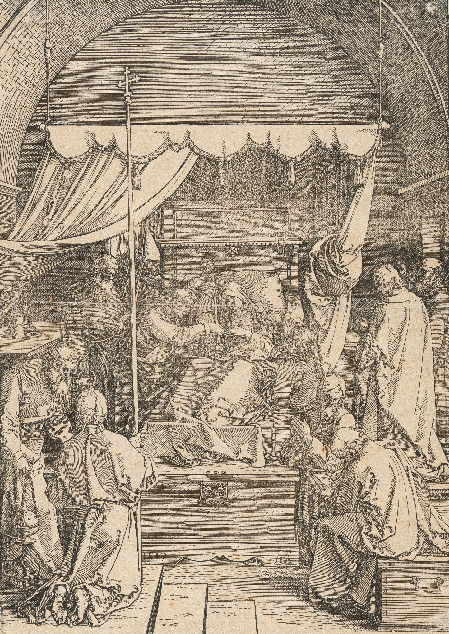 Plate 18 from: The Life of the Virgin. A good, but partially dry impression. With the fine gap under the chest on the right; a thin margin or trimmed to the borderline. – A tear in the top right corner; restored horizontal centrefold. On the reverse, with a former mounting tape along the upper edge. The lower left corner filled in. The upper right edge slightly rubbed. In good condition.