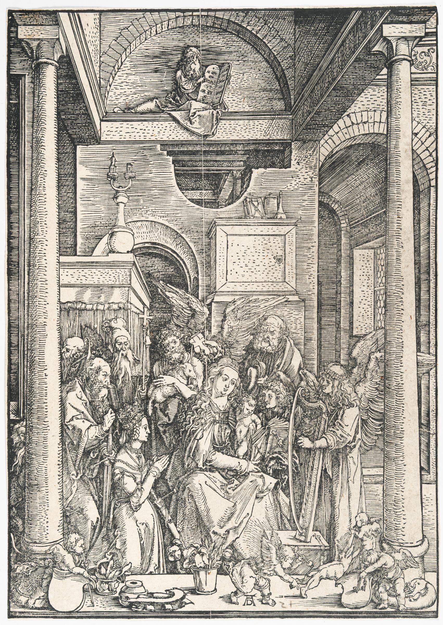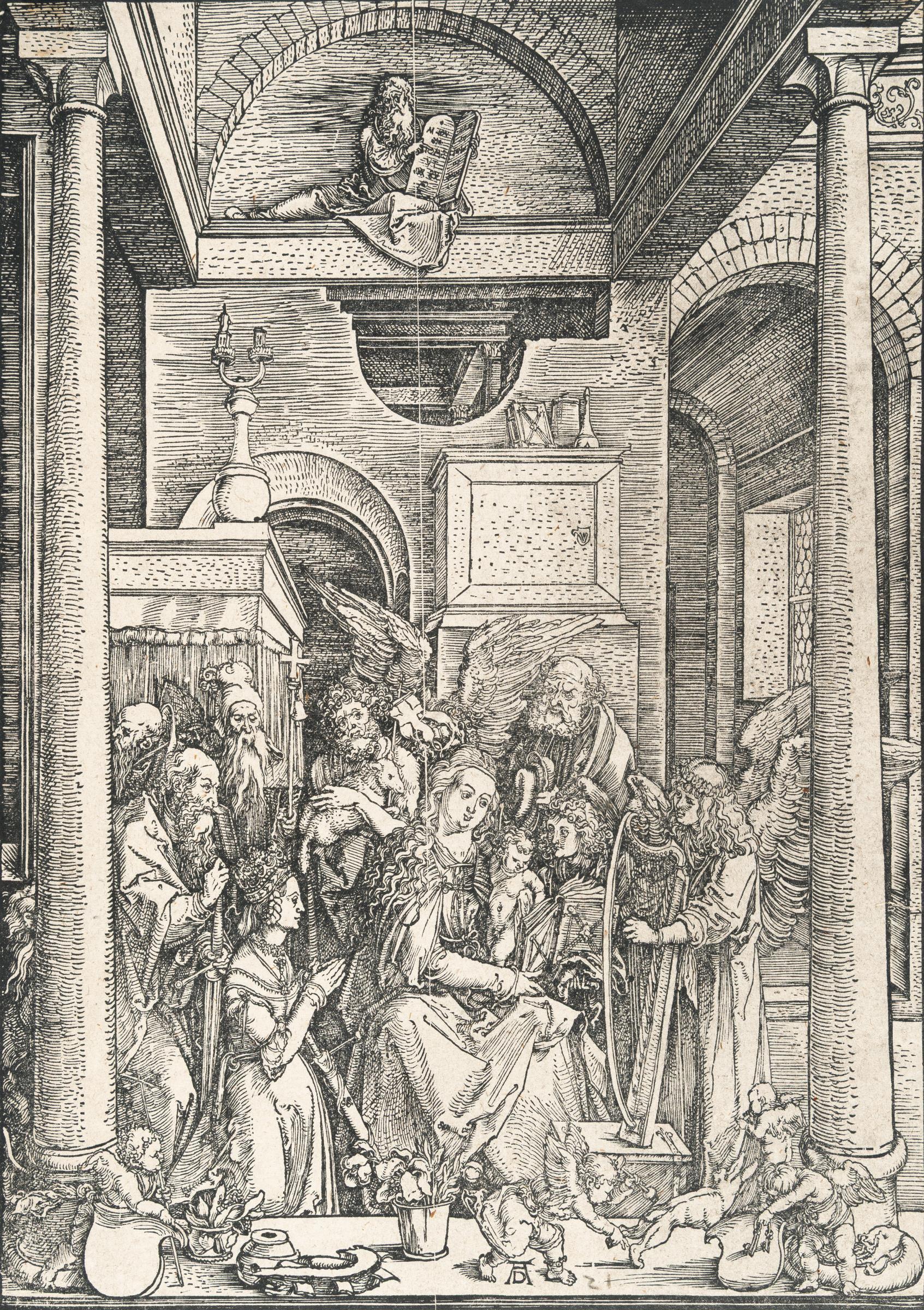 Plate 20, from: The Life of the Virgin. A good, partially slightly dry Meder c impression, with the crack up to Mary's hair and from the bottom edge up to the flowerpot. With a tiny margin around the borderline, at the top centre trimmed to the borderline. – Smoothed horizontal fold. Very faint, barely noticeable foxing. Verso in the upper corner with remnants of former mounting, otherwise in good condition.
