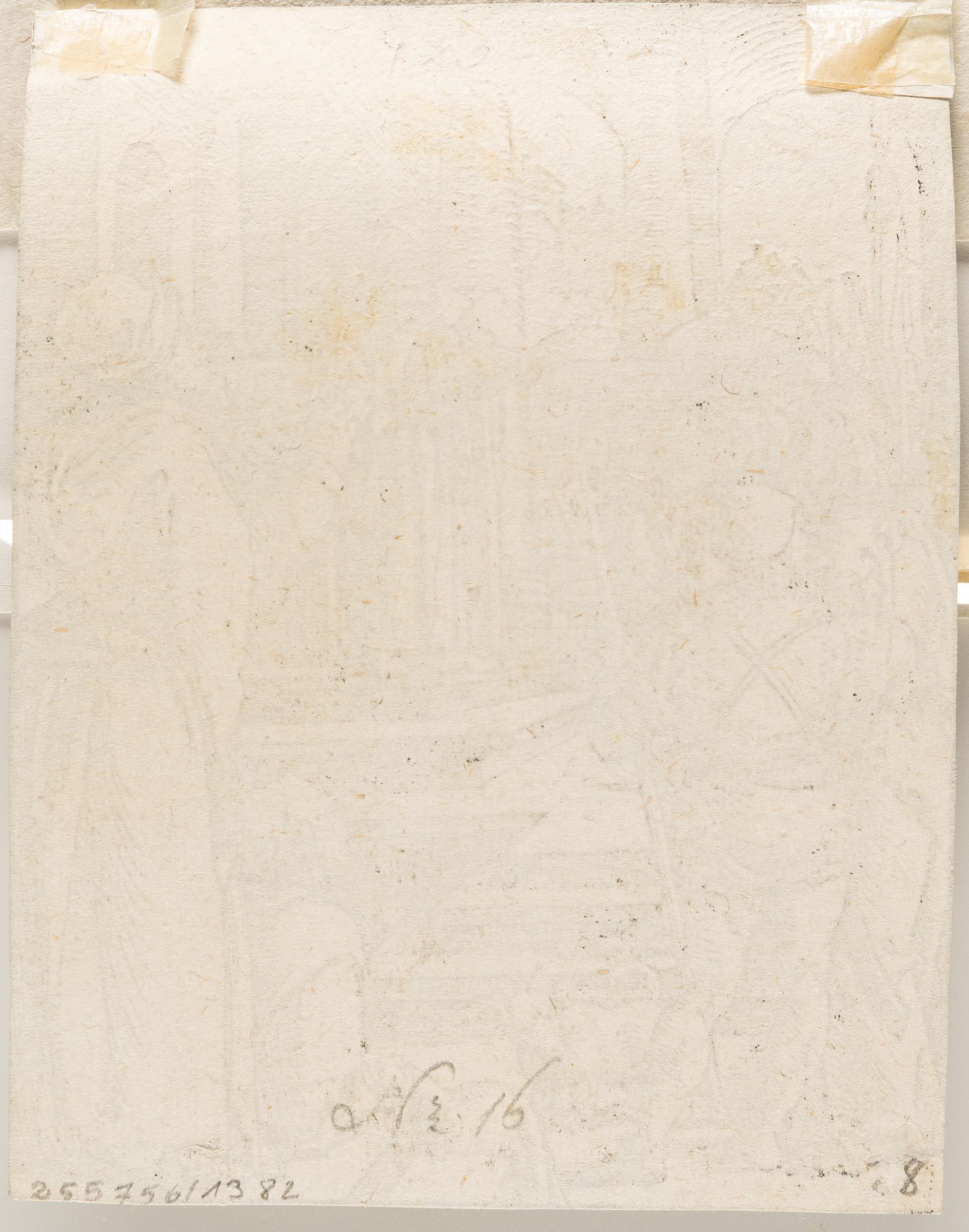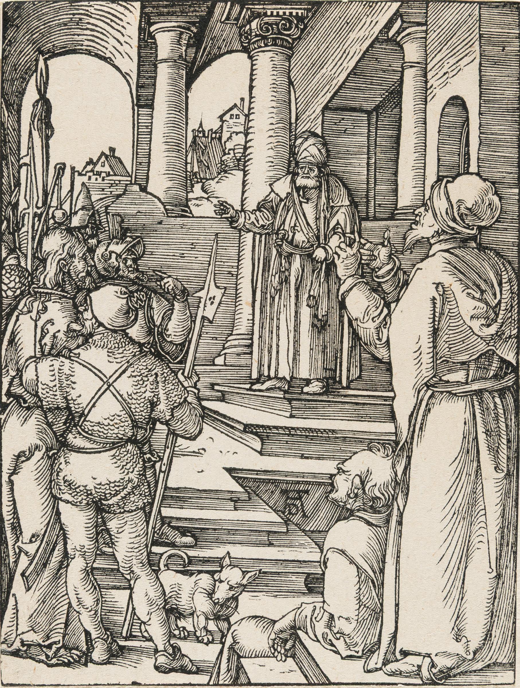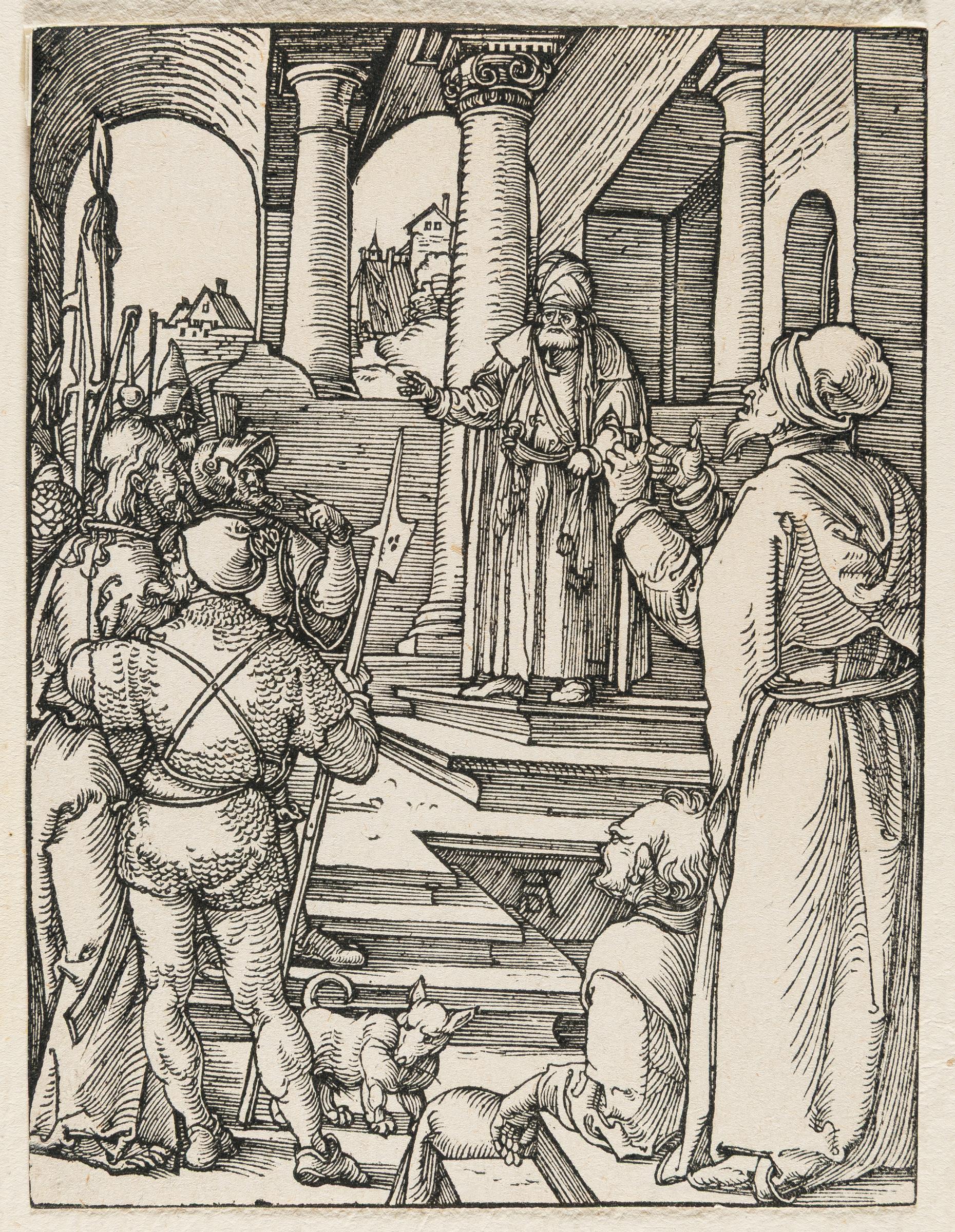 Plate 16, from: The Small Passion. A very fine, sharp proof impression, before the Latin text edition of 1511. Trimmed to the borderlines, lower left to the image. – Verso in the upper corners with remains of former mounting strips, otherwise in good condition.