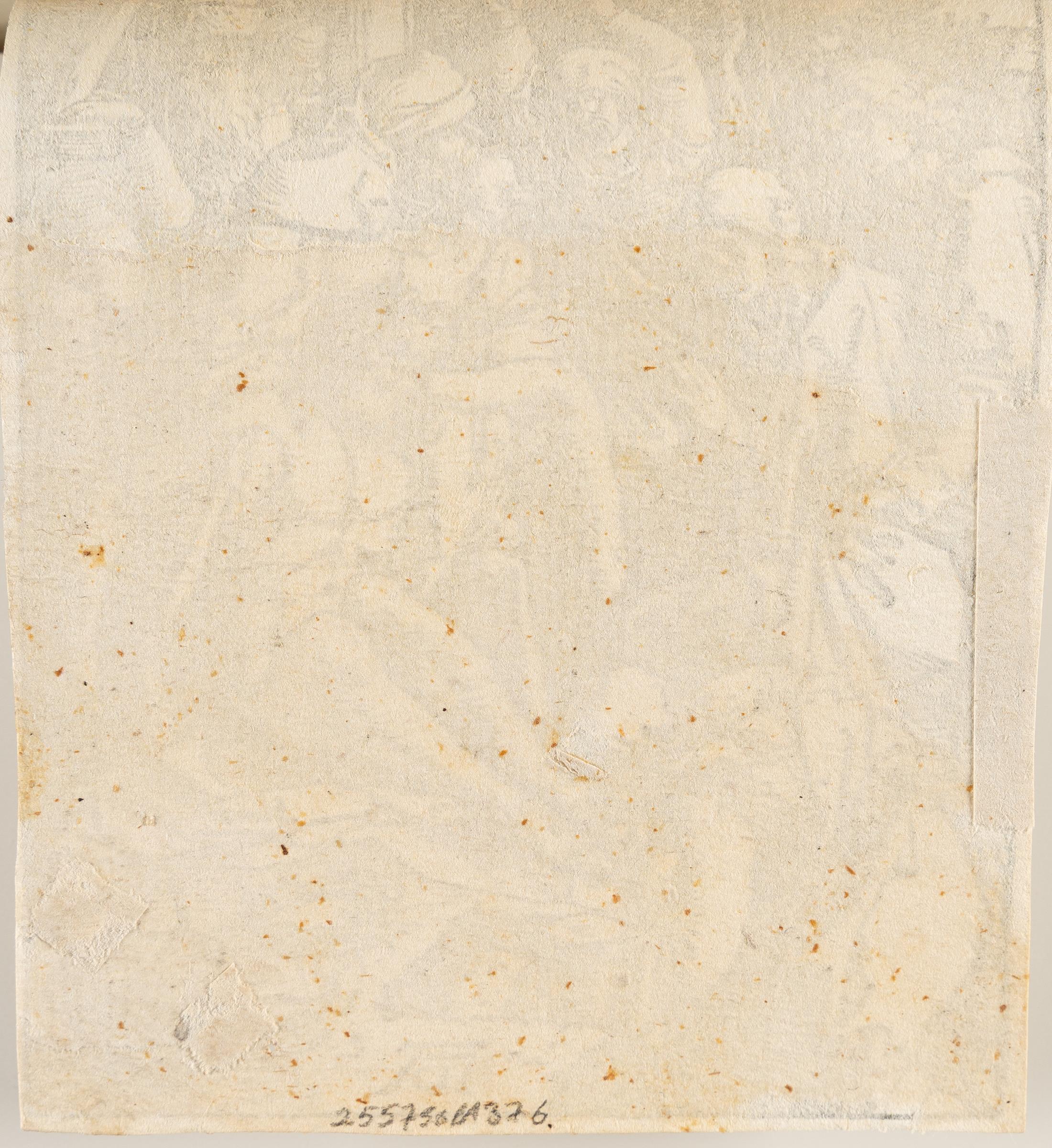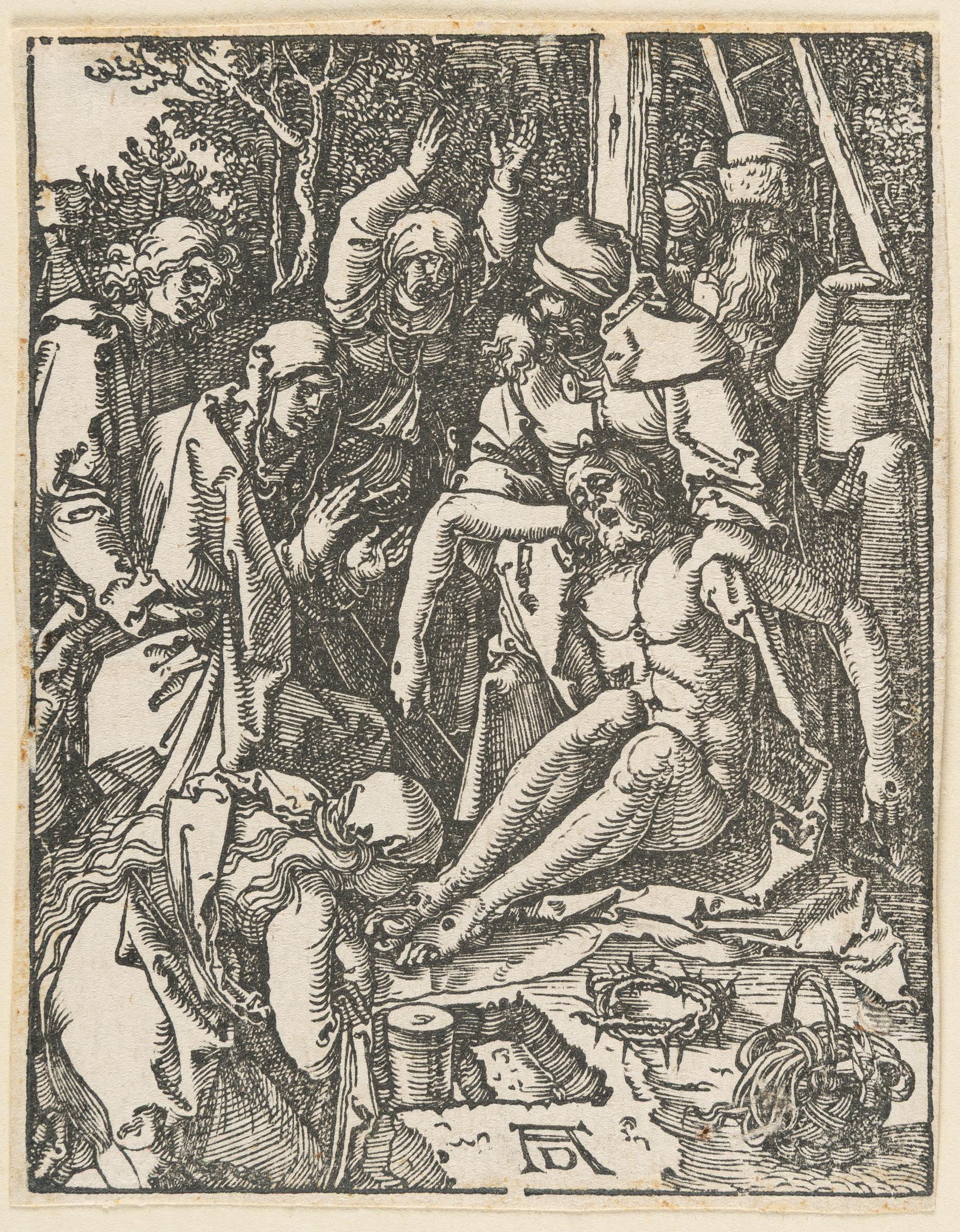 Plate 28, from: The Small Passion. A good impression after the text edition. Below the monogram with a gap in the border line. Trimmed outside the borderline, with thread margins in places. – The paper slightly time-stained. Small tear at the bottom left at the basket, filled in. Reinforced with a strip of paper along the left edge on the reverse. A tiny hole at the bottom right. Mounted on the support at the top edge on the reverse, otherwise in good condition.