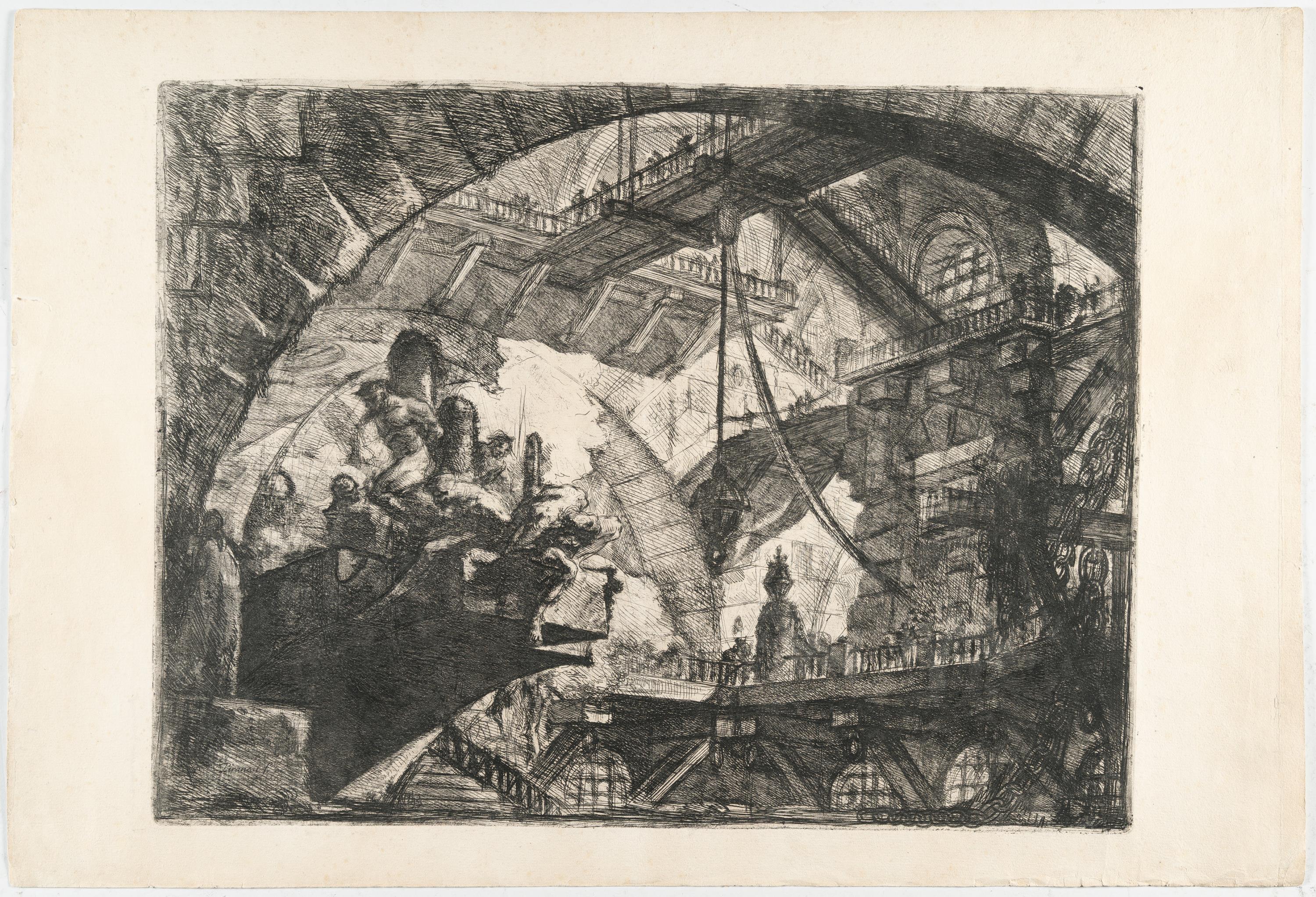 Plate X from: Carceri d’Invenzione. A fine, black and atmospheric impression of the second state, printed after the addition of the beam with chains projecting in from the corner of the right edge, but prior to the addition of the numeral “X“ to the top right corner. With wide margins around the platemark. – Slight foxing. A 2.5 cm long tear in the left margin. With the usual vertical centrefold. The edges somewhat light-stained. Otherwise in good condition.