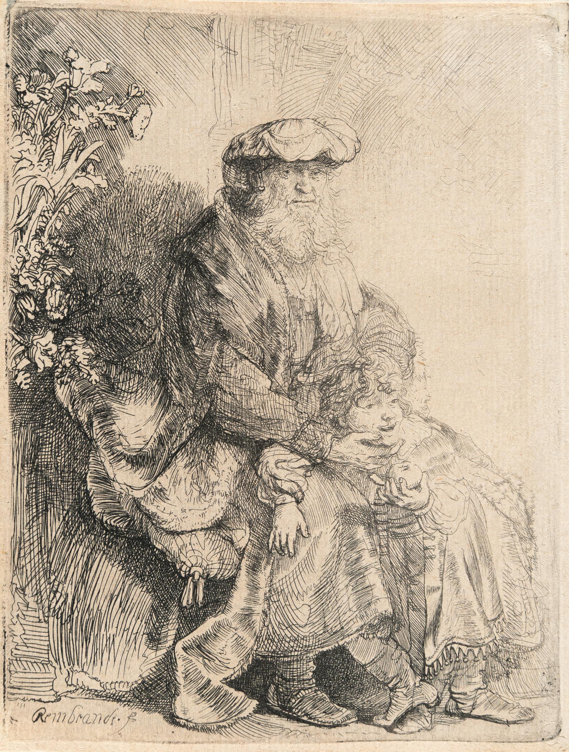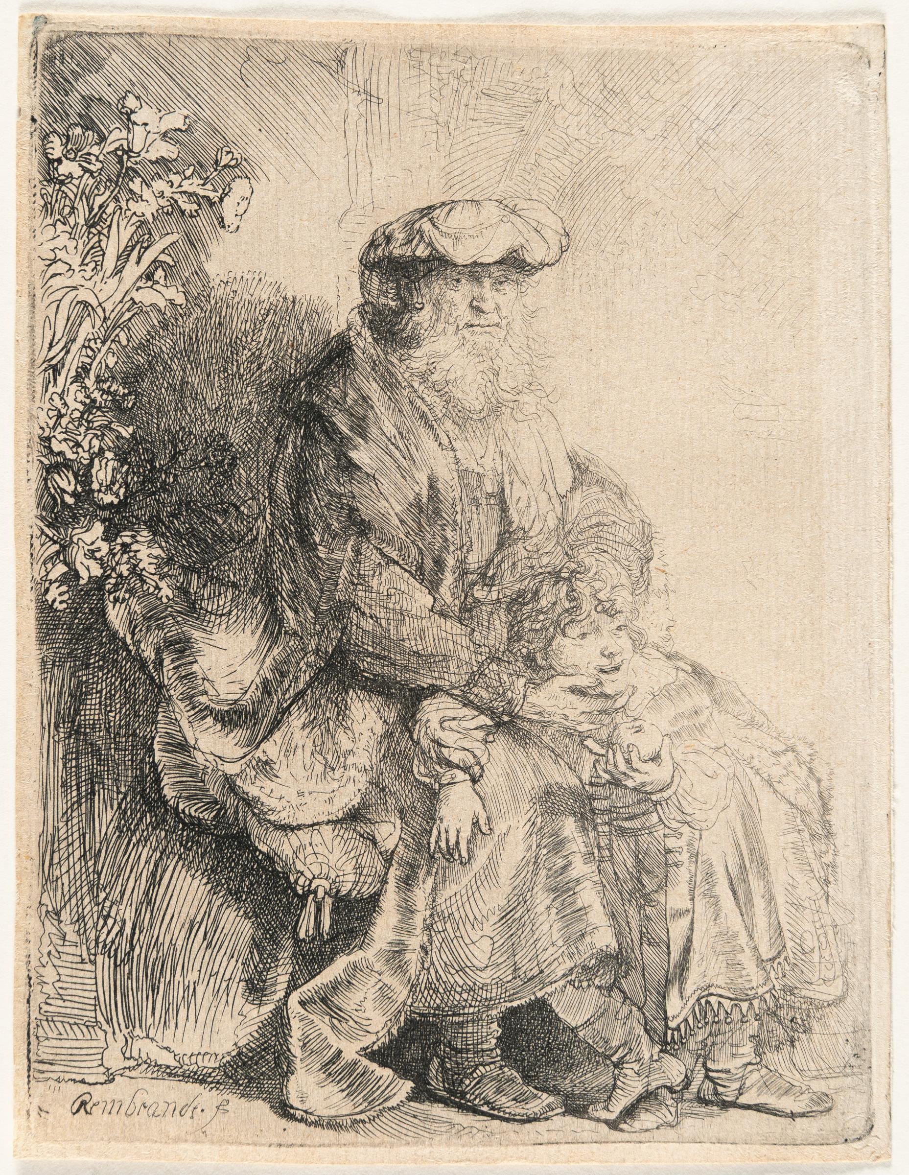 An exceptionally fine lifetime impression of the first state with beautiful contrasts, printed with light ink tone, with inky plate edges, many fine vertical scratches and the lucid fine shading beneath Jacob's cap. Before the addition of the two dots in the upper right corner. With narrow margins. – Paper slightly discoloured along the right hand edge, possibly due to a mounting strip on the reverse. In the upper right corner with a tiny paper abrasion. A tiny ink stain in the upper left corner, otherwise in very good condition.