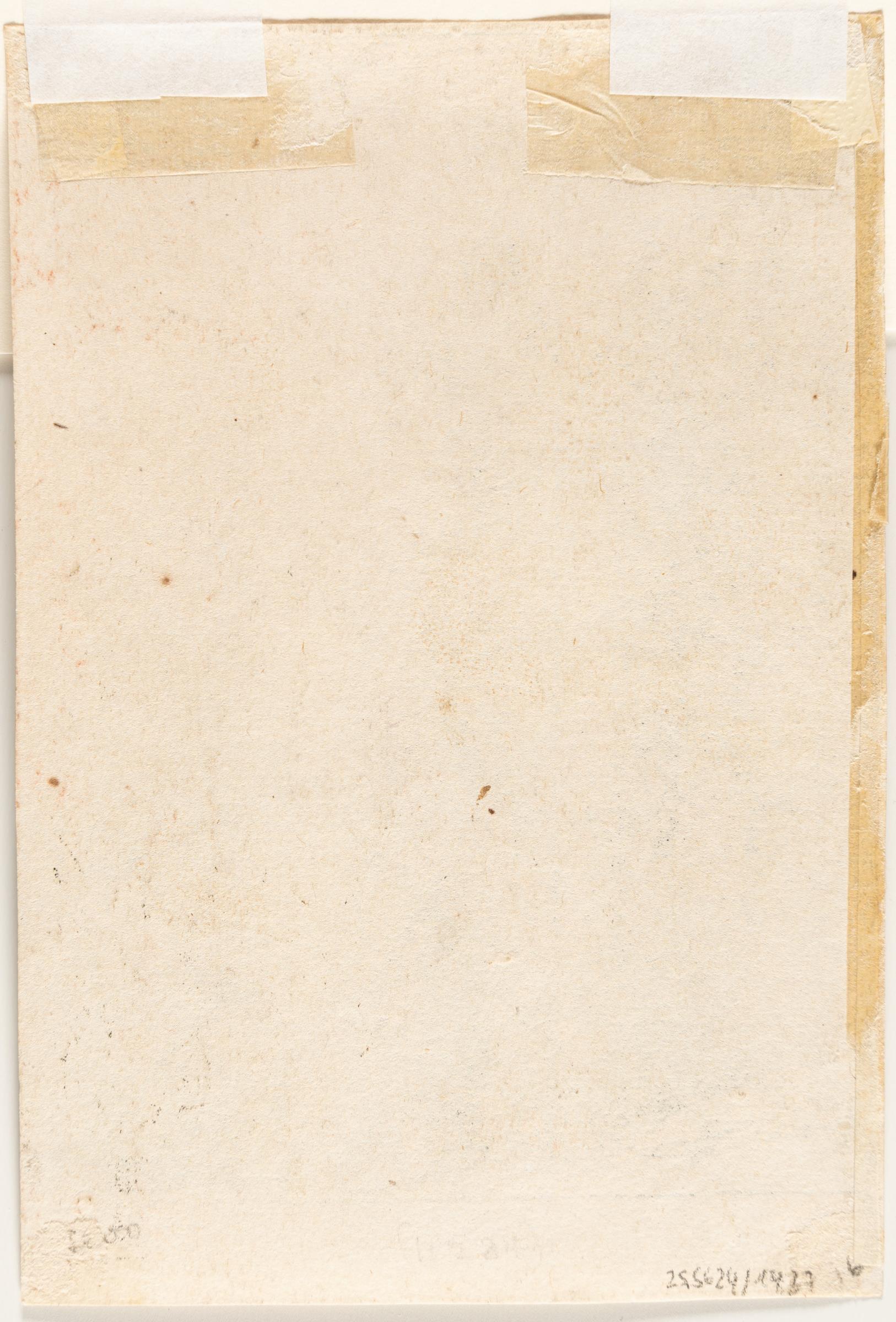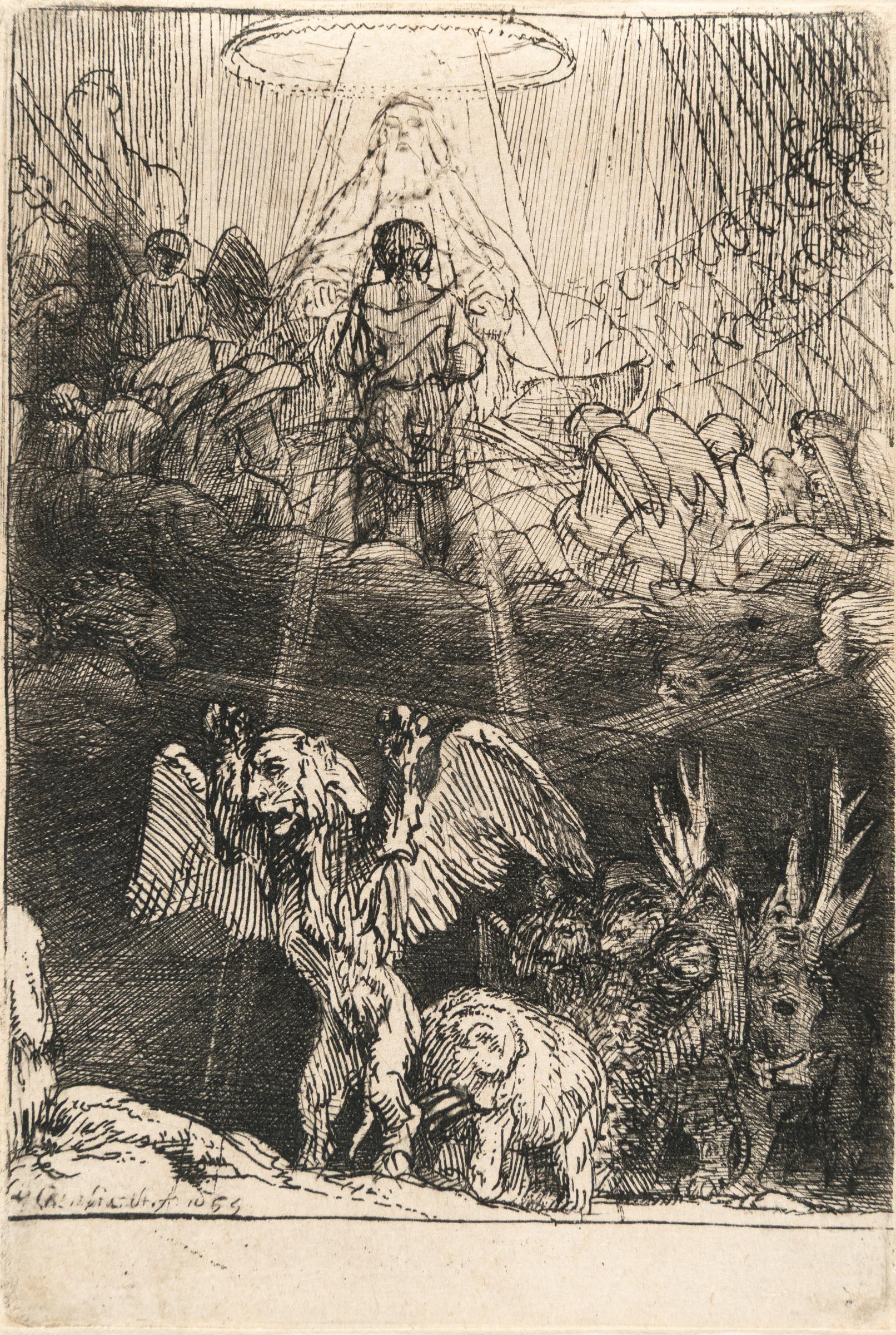 A fine lifetime impression of the third state, with strong touches of burr evident on the God-like figure at the top. After the plate has been reduced in size, but prior to the addition of diagonal shading to the background behind the apocalyptic animals. n the foreground, four apocalyptic beasts emerge beneath a cloud driven by cherubs. Standing on the cloud with his back turned to the viewer is the prophet Daniel, facing God the Father, who is enthroned in the heavens. Around them, a host of celestial figures bow in reverence. This scene belongs to a cycle of four allegorical compositions based on Piedra gloriosa (Amsterdam, 1655), a messianic treatise that blends Jewish and Christian eschatological readings of the statue in Nebuchadnezzar’s dream (Daniel 2) and its symbolic transformation in Daniel’s vision (Daniel 7). Thread margins on three sides, trimmed onto the platemark on the right side. – Paper slightly thinned at the corner tips. Verso with remnants of former mounting. Otherwise in very good condition.
