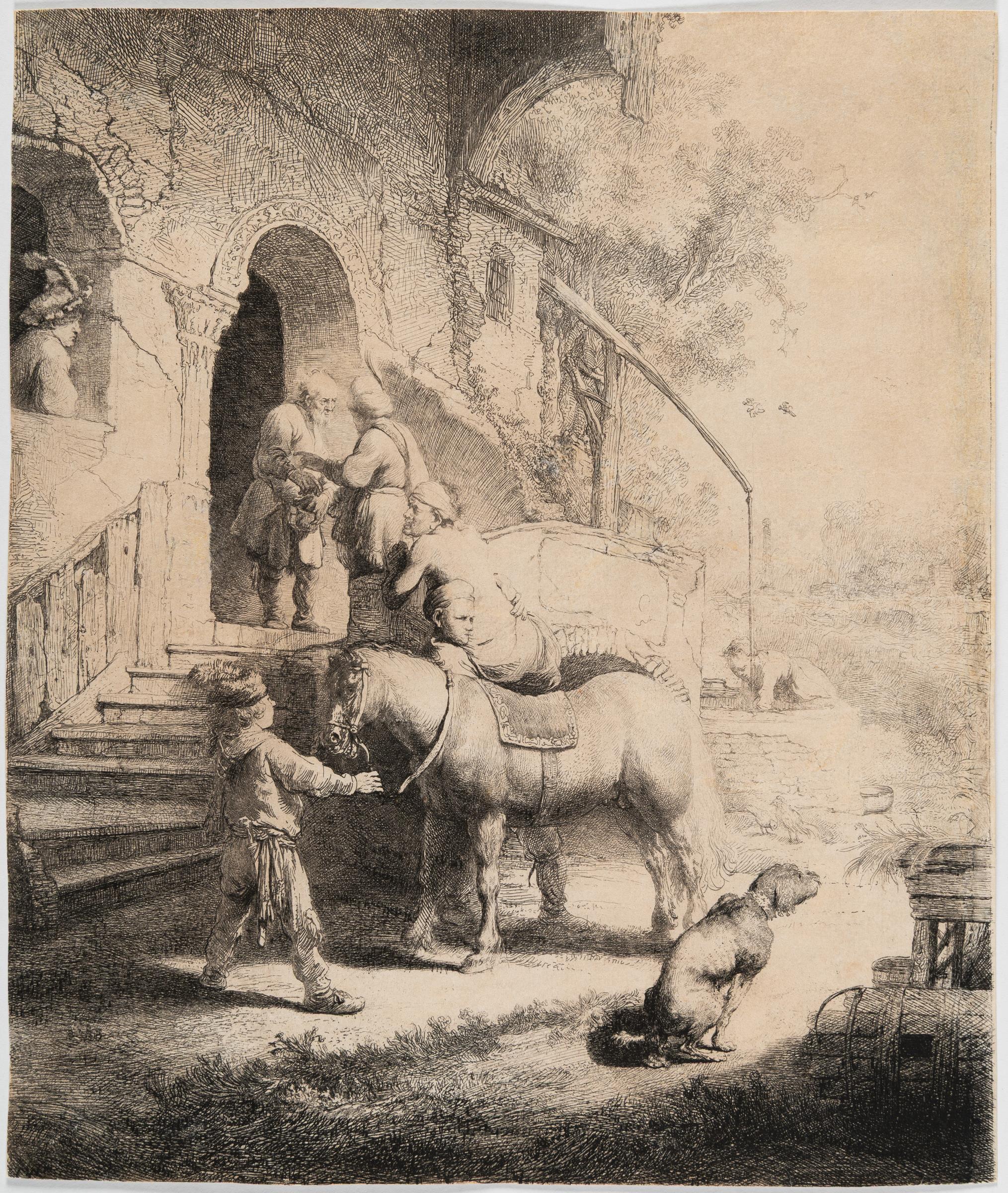 A superb impression of the extremely rare first state, before the shading of the horse's tail and the completion of the wall above the horse. With beautiful contrasts and tonal balances. Trimmed to the image (since there was a wide space between the platemarks and the image, there are only a few surviving impressions that were not trimmed to the image). Rembrandt presents a interpretation of the Parable of the Good Samaritan (Luke 10:25–37). A man, left injured by robbers, is ignored by a priest and a Levite before a Samaritan – socially marginalised at the time – offers help. The scene underscores Christ’s message: true compassion lies not in social status, but in action. Rembrandt depicts the moment the Samaritan arrives at the inn. He entrusts the wounded man to the innkeeper, handing over money for his care. The surrounding scene is rich in everyday detail: a dog relieves itself in the foreground, water is drawn from a well, and servants tend to horse and rider. The inn, once grand, now shows signs of decay – a visual metaphor for moral and material decline. Created during Rembrandt’s early Amsterdam years, the work exemplifies his growing interest in emotional depth and human psychology within biblical narratives. Technically, the etching demonstrates his command of light, texture, and atmosphere. – Restored along the right edge, otherwise in good condition.