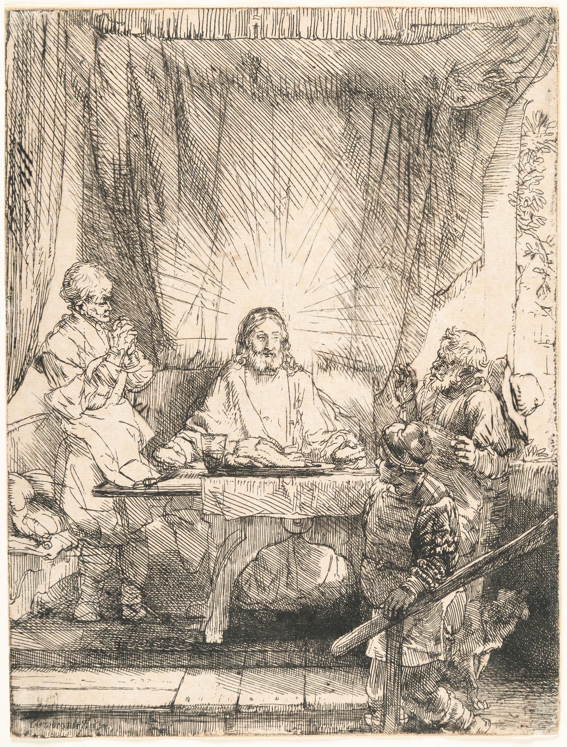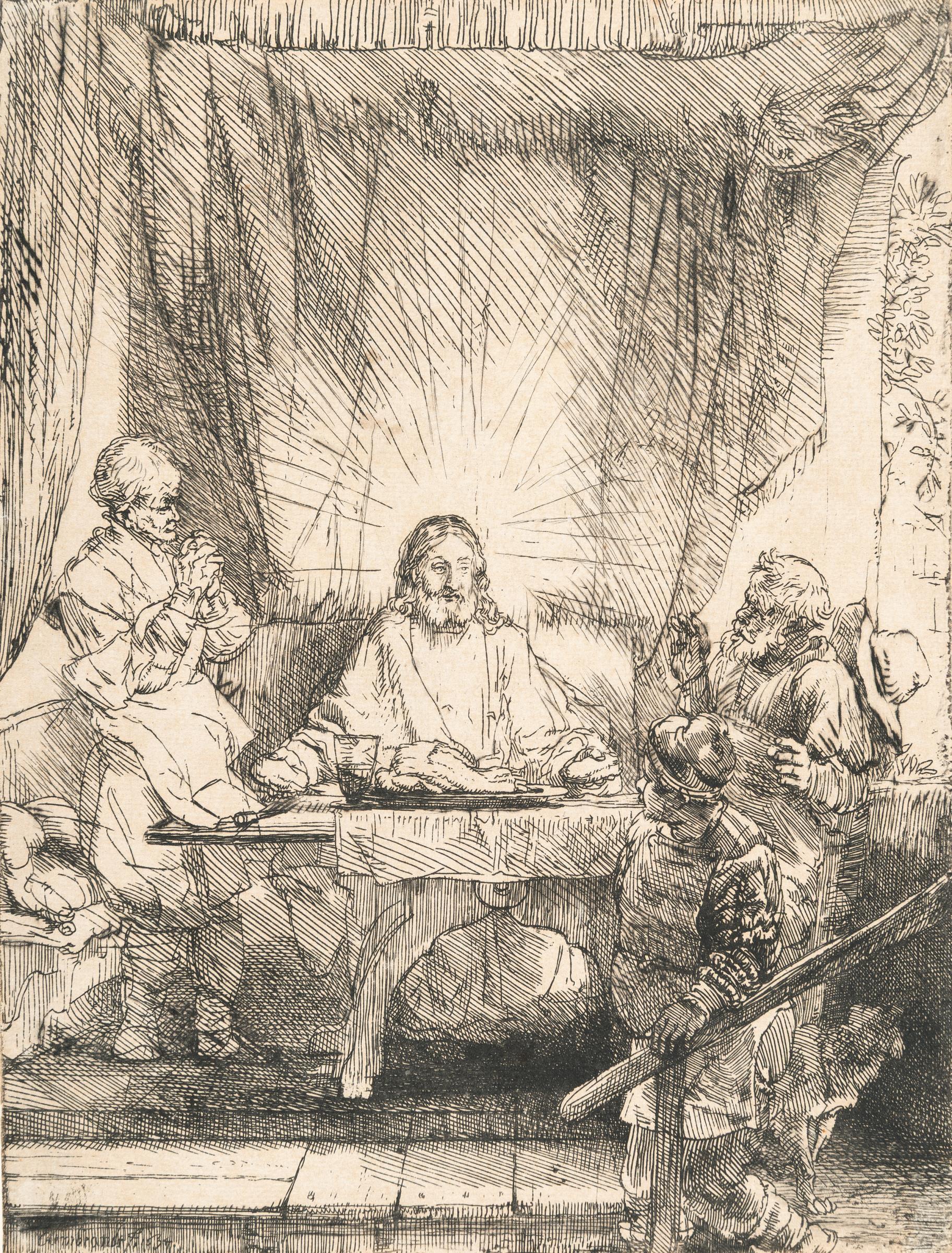 A very fine, early lifetime impression of the second state, with strong burr visible in the hat on the back of the man on the far right as well as on the curtains, and with subtle plate tone throughout. The outline of the hat now completed and more rays encircling Christ's head drawn in. In the same year Rembrandt created his small etchings on the childhood of Christ, he also produced four larger prints depicting key moments from Christ’s life. Among them is the Supper at Emmaus, which captures the moment two disciples recognise the resurrected Christ as he breaks bread with them. Their emotional response is clear—one raises his arms in shock, the other folds his hands in prayer. Christ, seated at the centre, radiates light, symbolising spiritual revelation. In contrast, the innkeeper in the foreground remains unaware of the miracle, still in darkness. Trimmed to the platemark. – Paper lightly time-stained and with foxing on the verso. The lower right corner reattached. Otherwise in very good condition.