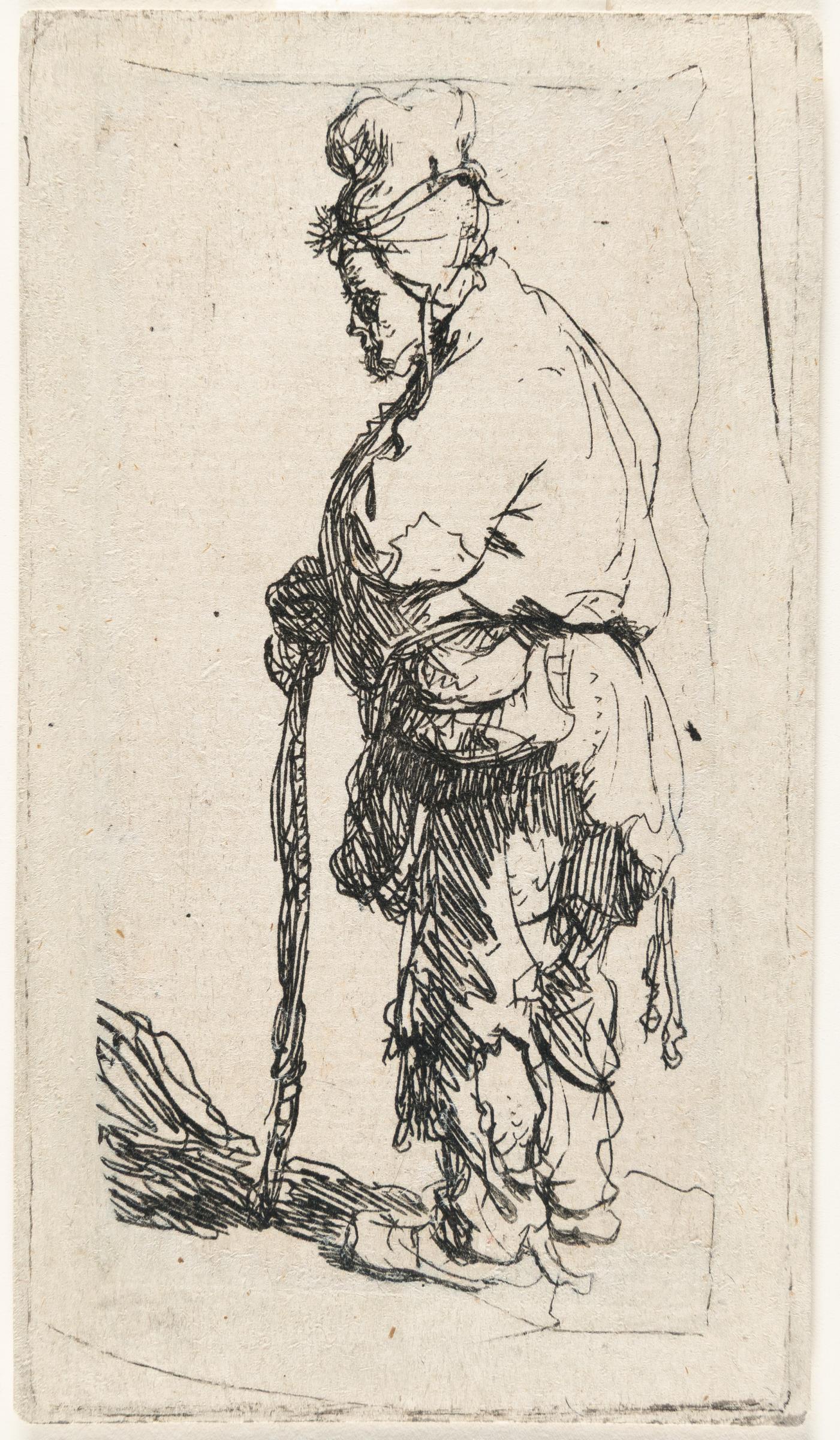 Bettler, der sich auf einen Stock stützt, nach links blickend