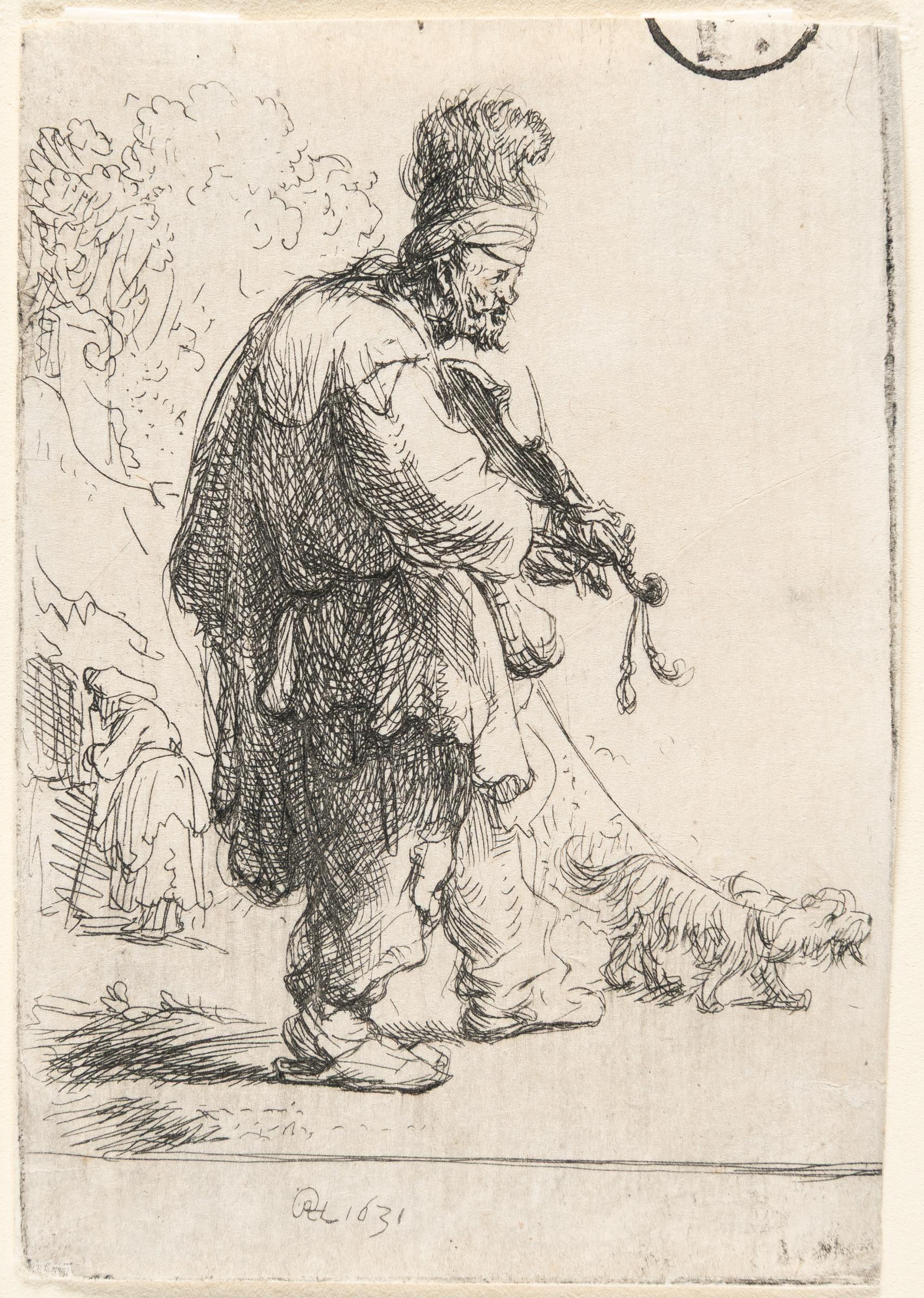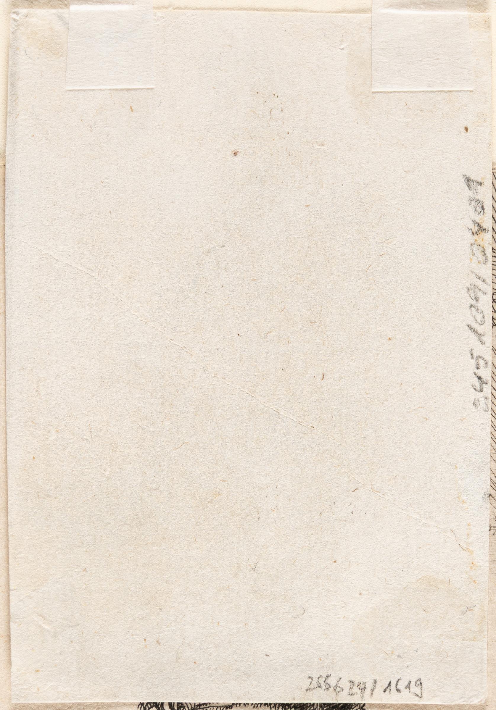 A very fine lifetime impression of the fifth state, with strenghtened contours of the man's lower left leg, yet before the doubled curved stroke on his upper right arm. Indicated by Nowell-Usticke with 'R+': 'A scarce, delicate little print'. Trimmed to the platemarks on three sides, cut 1 mm within on top. – A diagonal, hardly noticeable crease. Paper minimally thinned out in places. Otherwise in good condition.