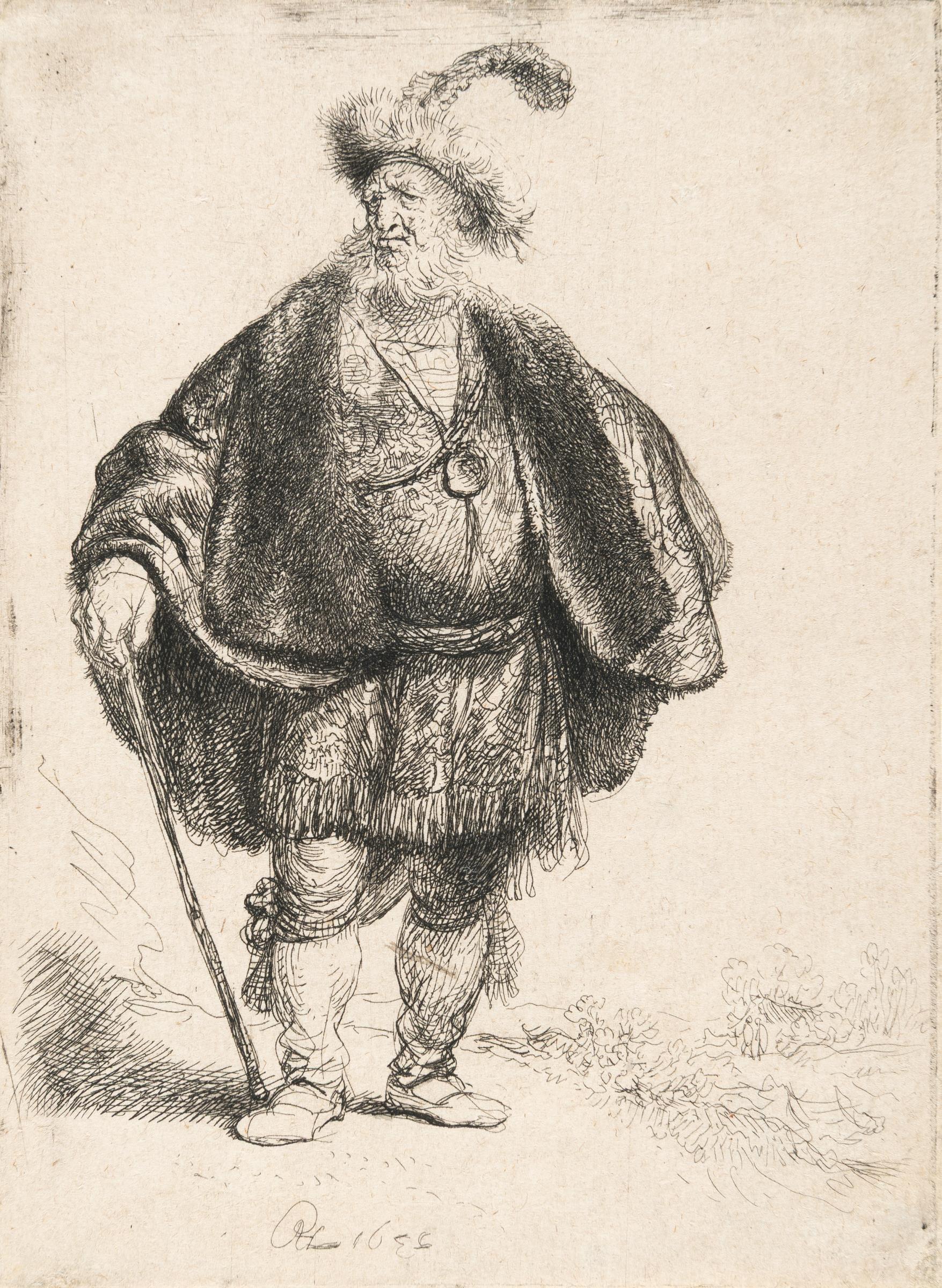 An early, richly tonal impression of the first state with slightly inky plate edges and a sharp corner upper right as well as horizontal scratches above the feather. Before the addition of burin strokes to strengthen the outline of the cane. Thread margins. This full-length portrayal depicts a stout, bearded man in elaborate orientalising costume: a fringed tunic, fur-trimmed cloak, high boots, and a plumed fur beret, all rendered with a striking attention to texture and detail. Shown frontally, he adopts a poised stance—his right hand resting on a staff, the left akimbo—while his right foot is advanced and his gaze turns contemplatively to the left. The figure evokes the 17th-century European fascination with the exoticised East, both in fashion and physiognomy. – Paper slightly thinned out in places, otherwise in very good condition.