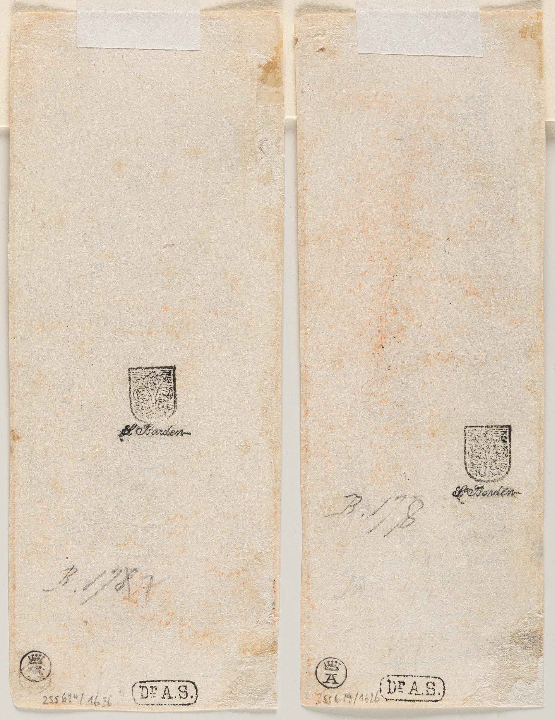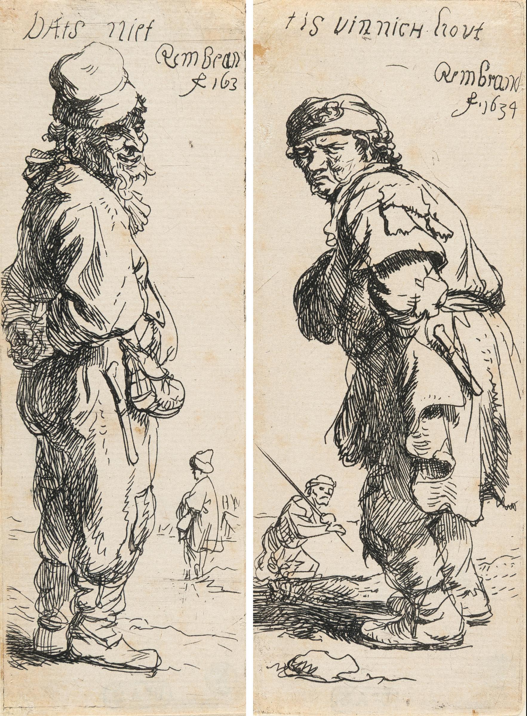 Very fine, sharp impressions of the only states. These two narrow, interrelated etchings revisit the theme and style of Rembrandt’s beggar studies from around 1630, but with a freer, more confident hand. Inspired by two small engravings by Hans Sebald Beham from 1542 (Bartsch 188, 189) – where a similar dialogue unfolds between two peasants – Rembrandt transposes the encounter to a sparsely suggested frozen Dutch landscape. The figures, ragged and wandering, are interpreted as contemporary embodiments of Heraclitus and Democritus – the philosophers of sorrow and laughter. Thread margins. – Light foxing. Thinned along the edges, with a few small tears in the margins, professionally closed with transparent paper. Otherwise in good condition.