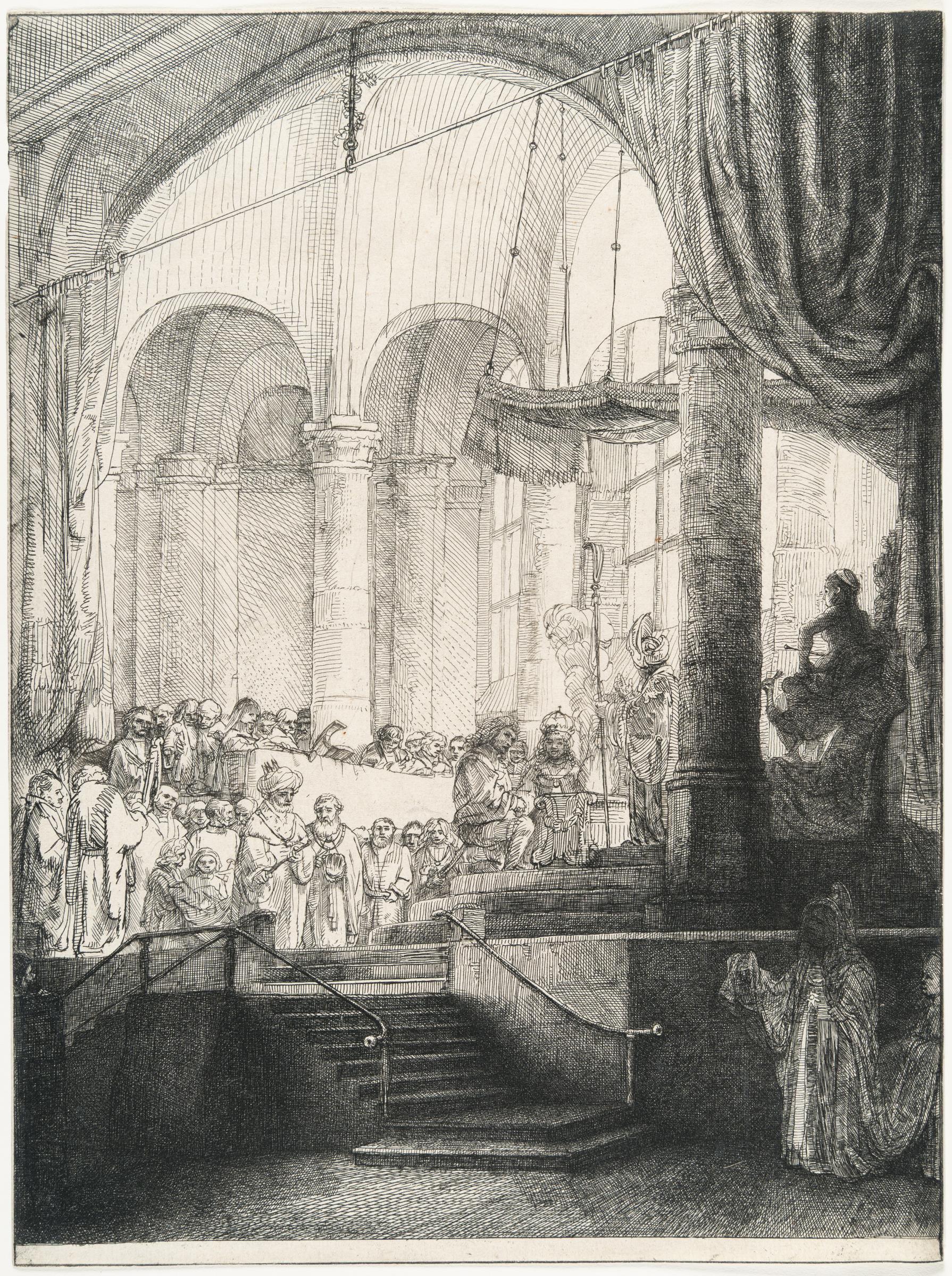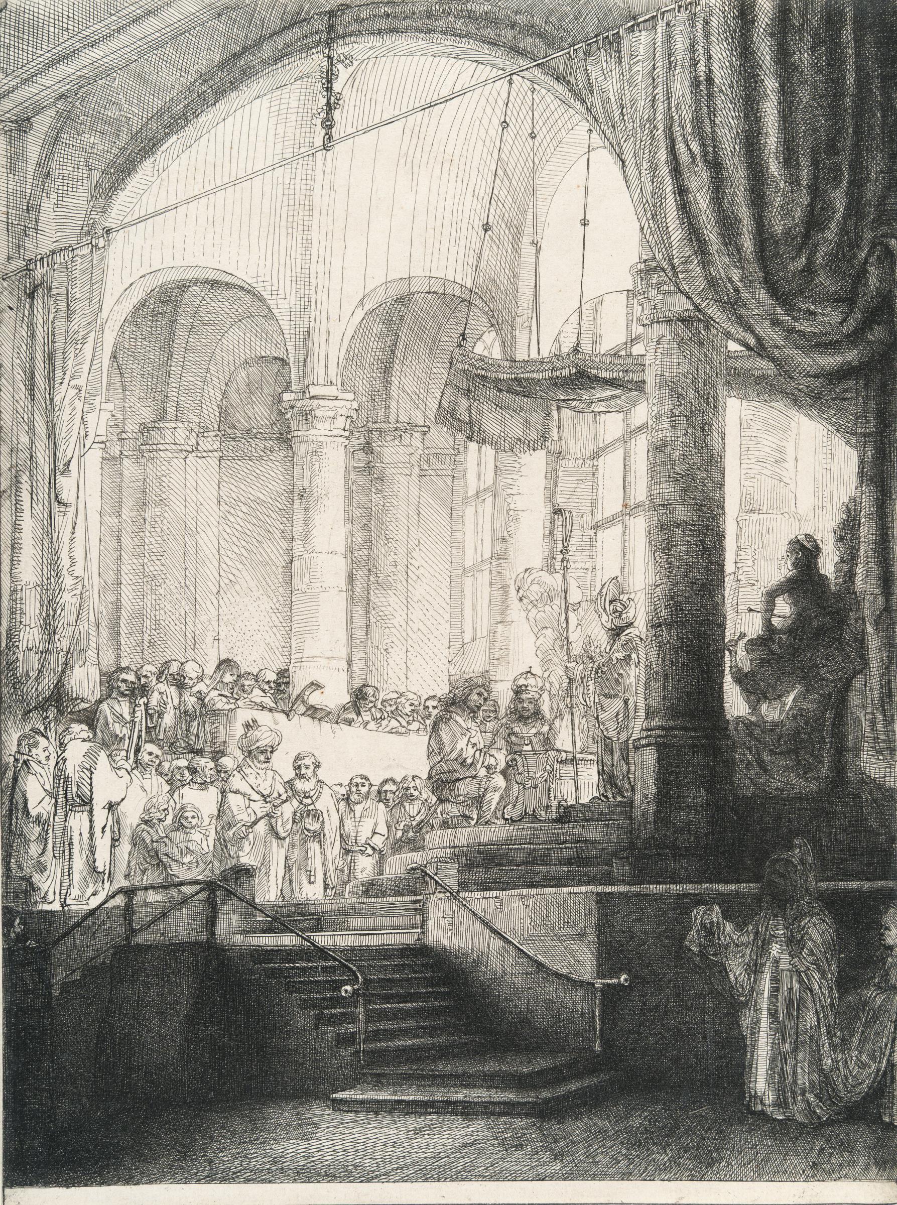 A superb, atmospheric lifetime impression of the first state, before the extension of Medea’s robe and that of her servant, which was added with drypoint. The sculpted figure of Juno is wearing a cap, which was later replaced by a crown. Rembrandt created illustrations for three books, with Medea being his second. Commissioned by Jan Six for the title page of his tragedy, Medea had been performed in October 1647 at the Amsterdam Stadsschouwburg and published twice (1648 and 1679). However, only the fourth state of the etching was used as the frontispiece for the first edition, while the fifth state appeared in deluxe copies of the second edition. Impressions of the first three states—before the signature, date, monogram, and the verses in the lower margin—are rare. For his depiction, Rembrandt chose the wedding scene, though Six did not include it in his adapted version, likely to encapsulate the tragic climax in a single image. The viewer’s gaze is guided by a spiraling staircase from the wedding couple to Juno, the goddess of marriage, seated in attendance. Medea, Jason’s first wife, appears in the shadows below, holding a dagger, poised to fulfill her vow and murder her children and Jason’s bride. Through this intricate circular composition, Rembrandt vividly conveys the full scope of the tragedy. One of the very few impressions on laid paper: most surviving impressions of the first state were printed on Japan paper. Pen borderline. Thread margins or trimmed on the platemark; top right corner irregular. – The paper shows slight thinning and a small dent along the left edge. Slight horizontal crease visible on the verso. Verso in the upper corners with remnants of previous mounting. Otherwise in very good condition. Very rare in this early state!
