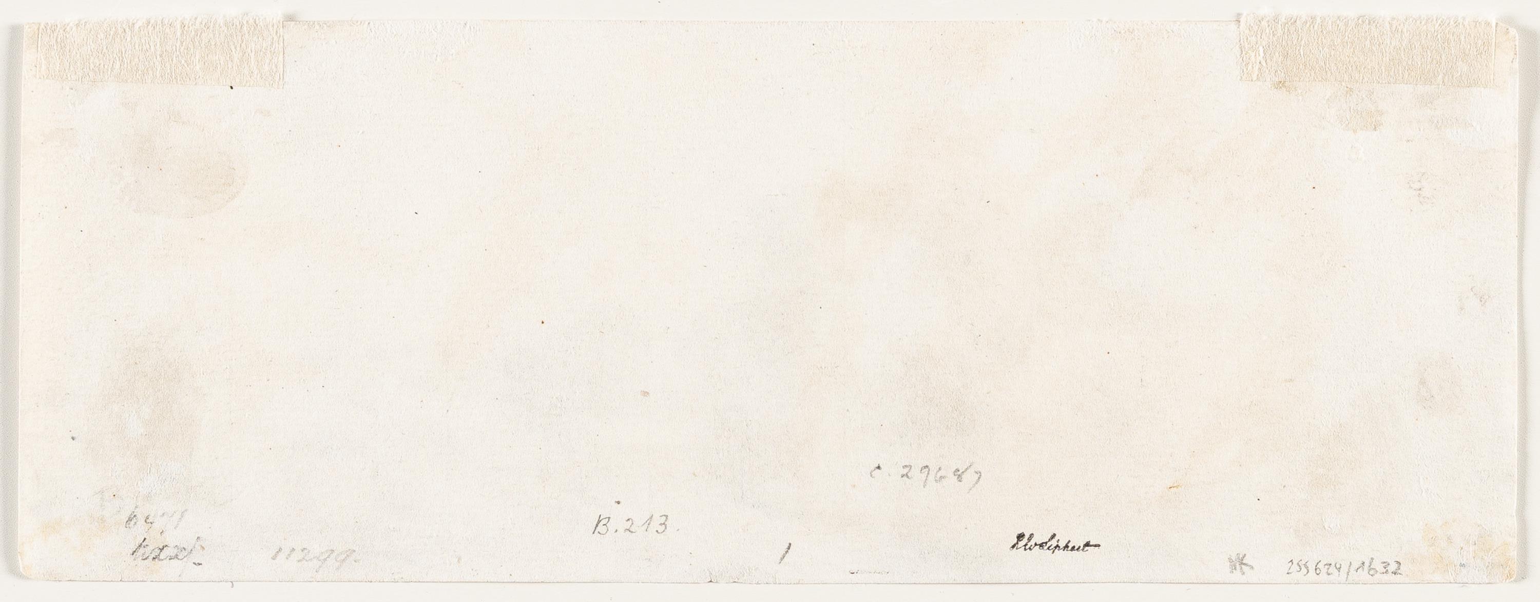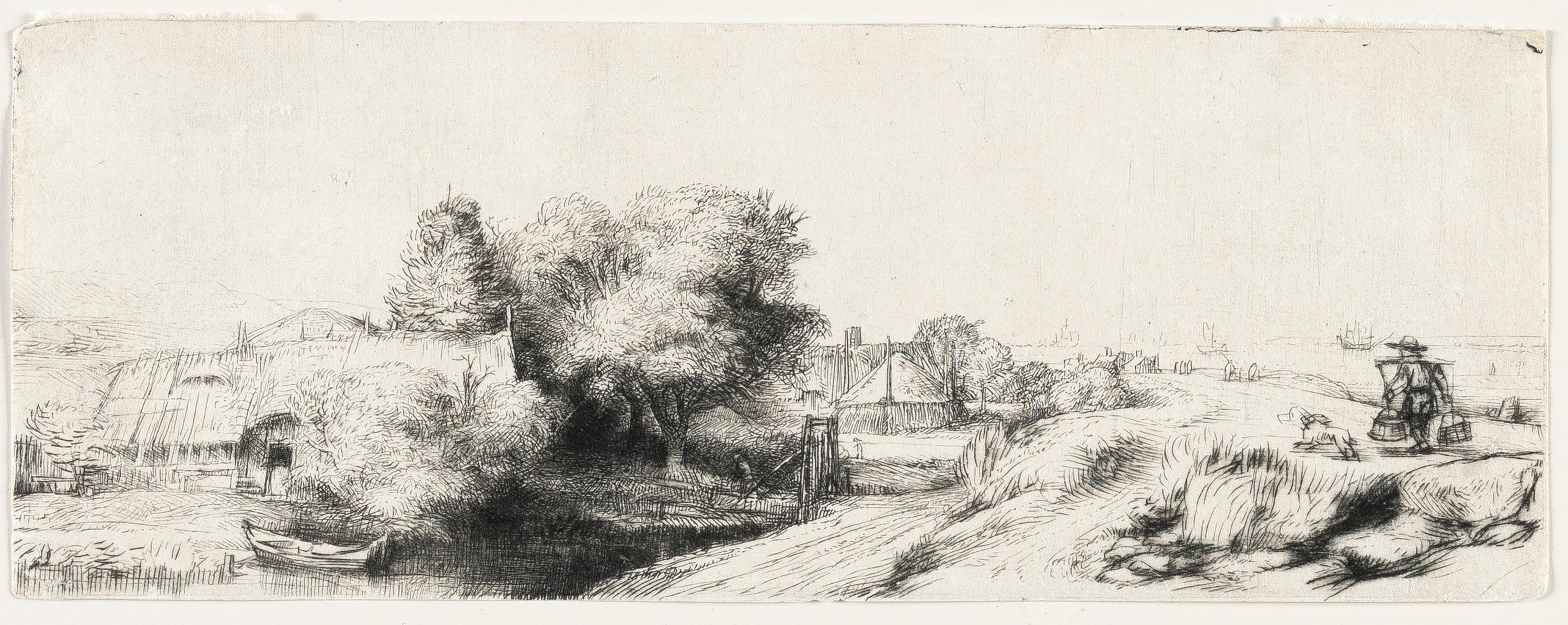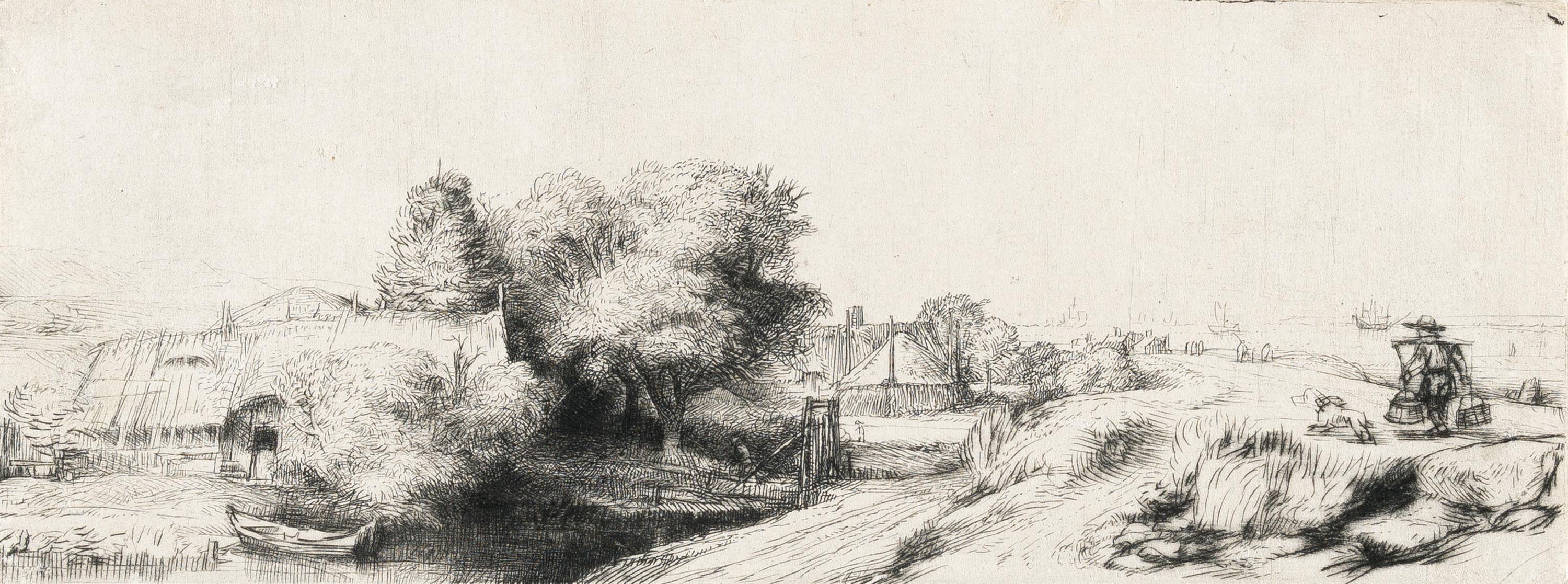 A fine lifetime impression of the third state, with strong burr and printed with delicate tone and fine wiping scratches in the sky. Nowell-Usticke classifies this with a 'RR' – 'Rare'. 'A very attractive small landscape'. With the distant hilly landscape added behind the farm buildings in the centre left. In this etching, Rembrandt captures the quiet immensity of the Dutch landscape, rendering a milkman and his dog almost incidental within the vast, atmospheric surroundings. The absence of a central focal point invites a sense of endless space, reflecting both the flat geography of the Netherlands and the deep connection between the Dutch people and the land they shaped. Thread margins or trimmed to the platemark. A little wash on the milkman. – The corner tips have been neatly rounded. Old paper hinges in the upper corners on the verso from a previous mounting. Otherwise in good condition. Very rare!