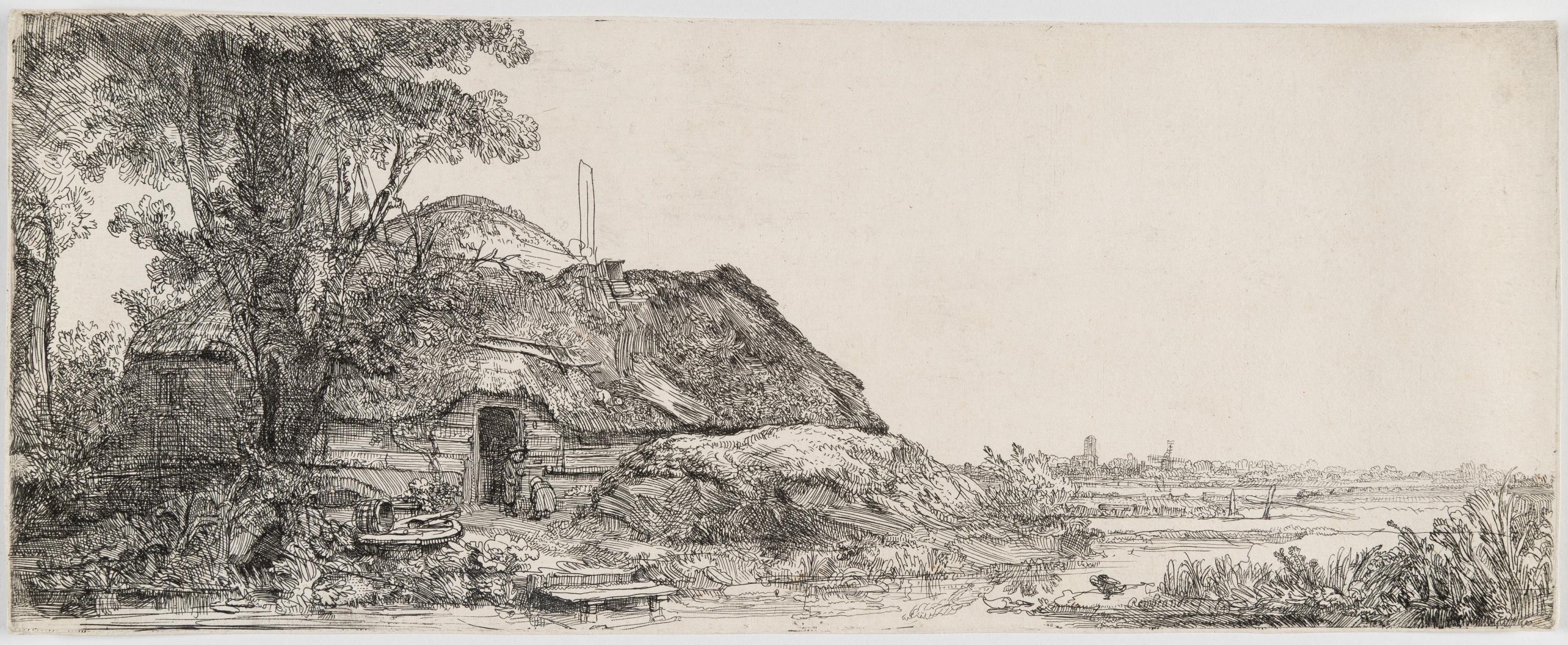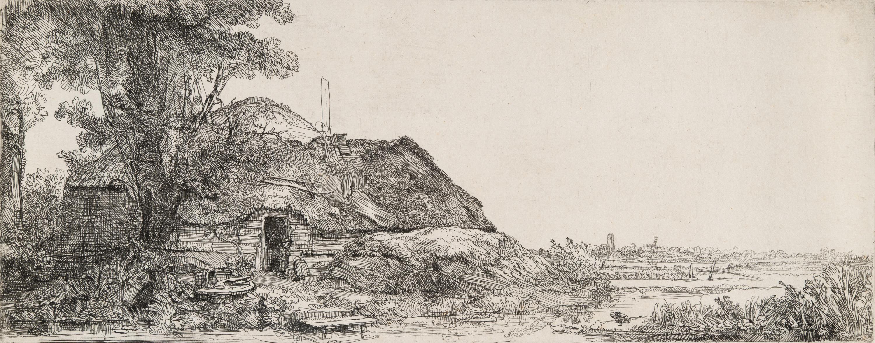 A fine, early, strong and even impression, printing with light plate tone, with fine diagonal lines in the water at the bottom left; sharp vertical scratches at the left edge centre and many fine vertical lines in the sky. With narrow margins on all sides. The view of a picturesque cottage is a product of the imagination, a capriccio, inspired by the countryside surrounding Amsterdam. Six (1909, p. 96) observed that the scene combines, unrealistically, a view of Kostverloren with a profile of Amsterdam, even though the city would, in reality, have been situated behind the viewer. A drawing in the Louvre, dating to around 1639 and titled Cottage with a Cart and Road, possibly executed en plein air, appears to have served as the starting point for the left-hand side of the composition. This is among the earliest of Rembrandt’s landscape etchings, yet the plate is handled with remarkable confidence. In this richly detailed image, Rembrandt successfully evokes a wide range of textures – thatch, foliage, and water – all rendered with a high degree of finish. Rembrandt’s characteristic inclusion of incidental detail – such as the children by the doorway, the abandoned milk pail and yoke lying by an old cartwheel, and the deteriorating thatch – has led some to suggest an allegorical reading of the plate. While the omnipresent theme of vanitas, so prevalent in seventeenth-century imagery, may indeed have informed his thinking, it remains difficult to determine his intentions with any certainty. It seems likely that he was primarily concerned with issues of representational skill and compositional balance – the very qualities that continue to draw viewers to his work today. A few tiny spots, smoothed vertical centre crease. The corner tips carefully made-up, otherwise in good condition. Very rare!