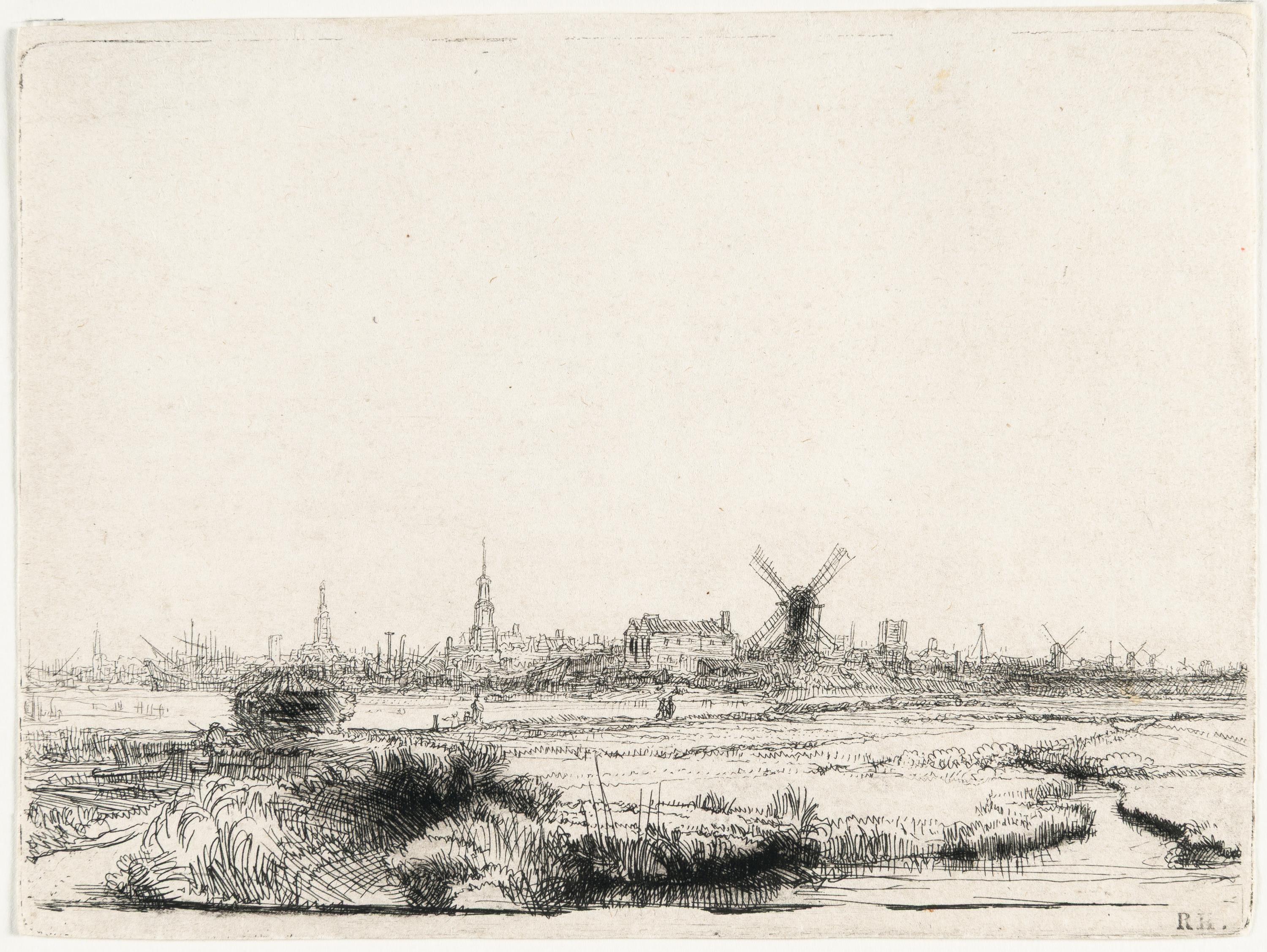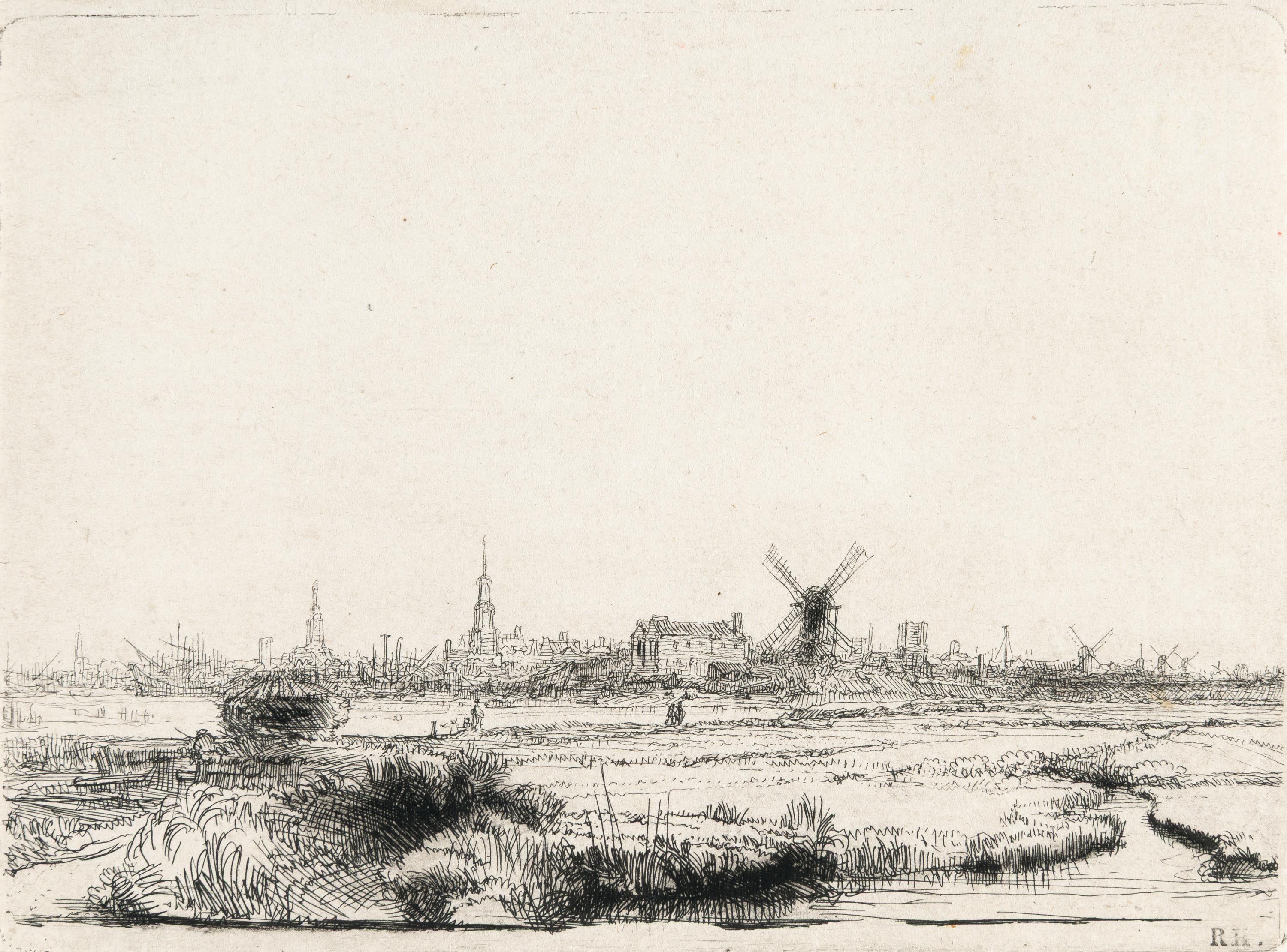 A superb impression of the only state, with the fine details of the distant landscape at the left edge crisp and strong, and the reeds in the foreground printed in a rich, velvety black. In this view of Amsterdam, Rembrandt achieves extraordinary depth despite the very low horizon. The artist places the reeds and other plants growing along the canal and the footpath prominently in the foreground, while the city appears tiny in the distance. In fact, the tallest reed is as tall as the tallest tower in the city, that one of the Oude Kerk. Eric Hinterding describes the recognisable landmarks from left to right: ‘the Haringspakkertoren, the Oude Kerk, the Montelbaanstoren, the warehouses and jetties of the Dutch East India Company and the mill at the Rijzenhoofd bulwark’ (Hinterding, Lugt Collection, no. 165, p. 284). The fact that the panorama is depicted in mirror image could indicate that Rembrandt drew it directly on the plate on the spot. If he had started from a prepared drawing, it seems plausible that he would have transferred the drawing to the plate so that it could be printed the right way round.Narrow margins at the top; trimmed to the platemarks on the other three sides. – Very faint foxing in the sky area at right; corners gently rounded. Verso along the upper edge with a thin strip from an earlier mounting. Otherwise in very good condition.