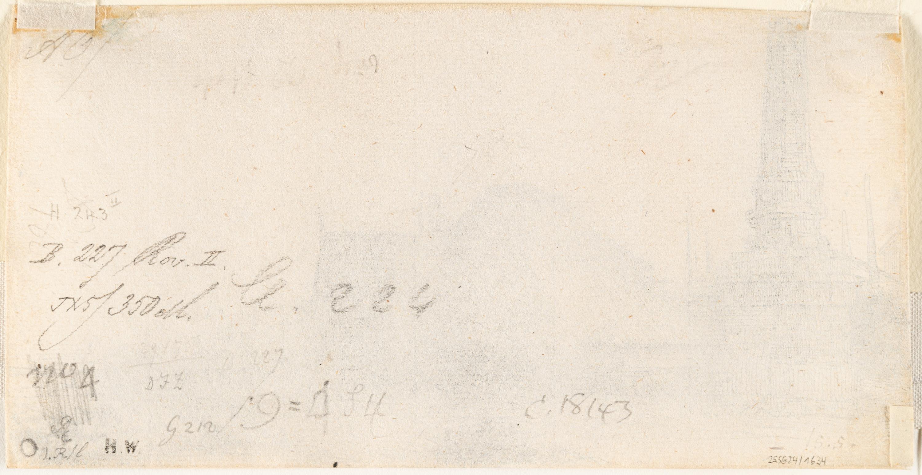 A very fine, atmospheric lifetime impression of the second state of this rare subject, featuring strong burr and strong sulphur tint in the sky. The farm buildings and meadow just behind the wheelbarrow are now shaded by diagonal hatching. Rembrandt's landscape etching depicts the milestone at Spieringshorn on the Spaarndammerdijk, marking the district where suspicious persons were detained and banished individuals were prohibited from staying. This obelisk, erected in 1624 after the city's expansion, is shown with a typical farmhouse of the region, though the additional farmhouse and church tower are Rembrandt's inventions. The artist's use of a semicircular upper edge—common in religious works—elevates this landscape, a genre typically ranked lower in artistic hierarchy. Thread margins; trimmed within the platemark at the lower right. – At the lower left edge, the paper slightly thinned and reinforced on verso. Verso with remnants of a former mounting. Otherwise in good condition.