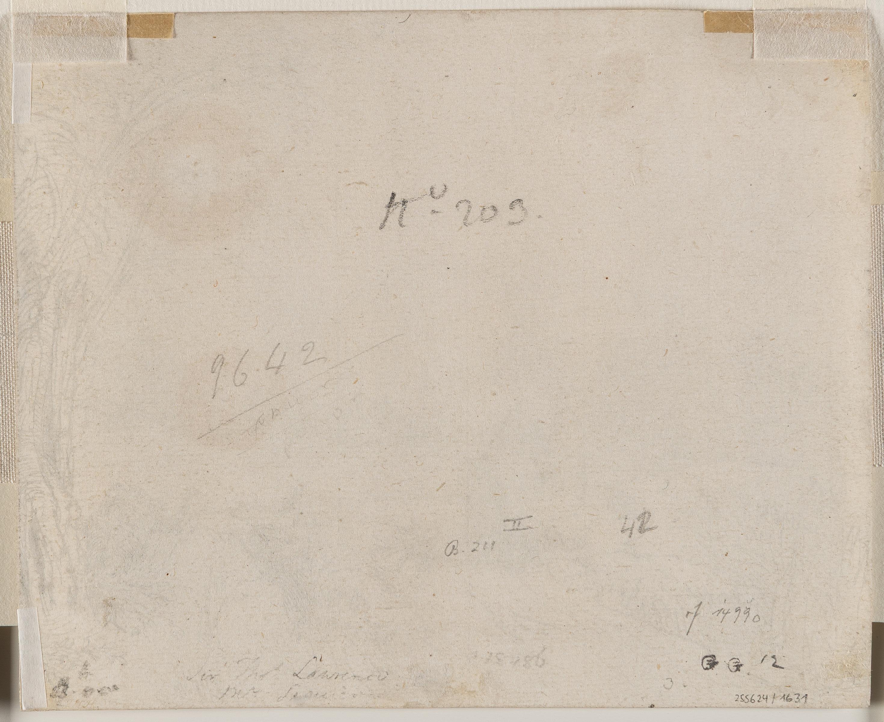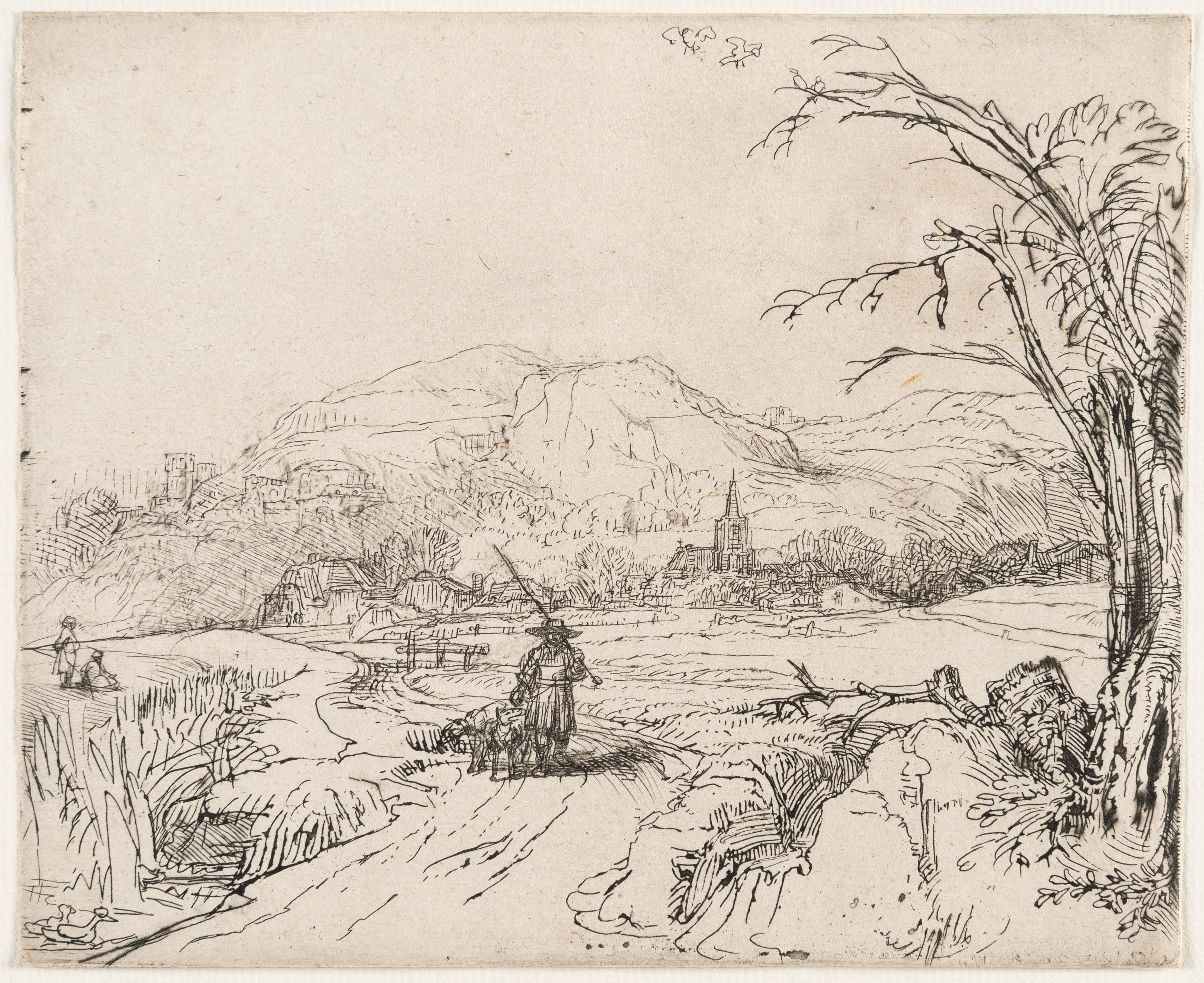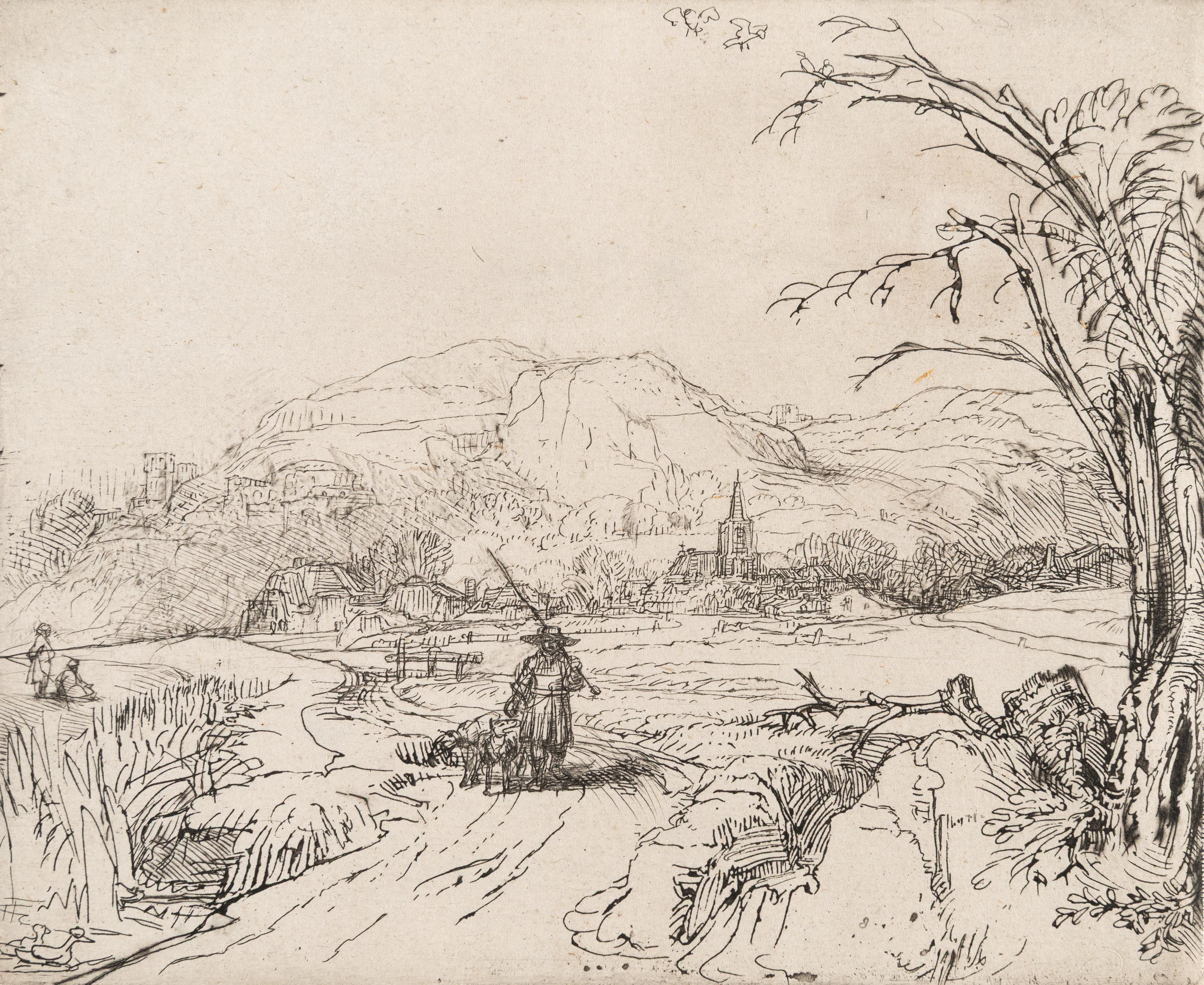 A very fine and crisp lifetime impression of the second state, exhibiting strong burr particularly in the tree on the right and along the side edges. The farm and hay barn behind the standing and seated figures to the left, as well as the wooden fence just left of the sportsman’s head, have now been burnished out. Prints of this subject are rare, as the plate was lost early on. In Nowell-Usticke, it is marked with an 'R' for 'rare' and described as 'a scarce plate'. In this finely executed etching, a wide Dutch landscape unfolds, traversed by a canal running alongside a road that leads towards a village with a church spire at its centre. The composition is framed on the right by a copse in the foreground, while on the left, two seated figures can be seen in a meadow. Two ducks glide along the canal, a quiet detail that enhances the scene’s pastoral serenity. In the middle ground, a sportsman accompanied by two dogs appears, a motif that gives the print its traditional title Het jagertje ('The Little Hunter'). Beyond him, gentle hills rise, dotted with scattered buildings along their slopes. In this second state of the print; a previously visible farmhouse and barn above the two seated figures on the left have been carefully burnished out; an alteration that reflects Rembrandt’s deliberate approach to composition. The etching demonstrates his masterful use of light and line to create a rich atmospheric effect. Trimmed to the platemarks. – A very faint, barely noticeable stain at the heigt of the foliage on the right. Verso with remains of former mounting tape. Otherwise in very good condition. Very rare!