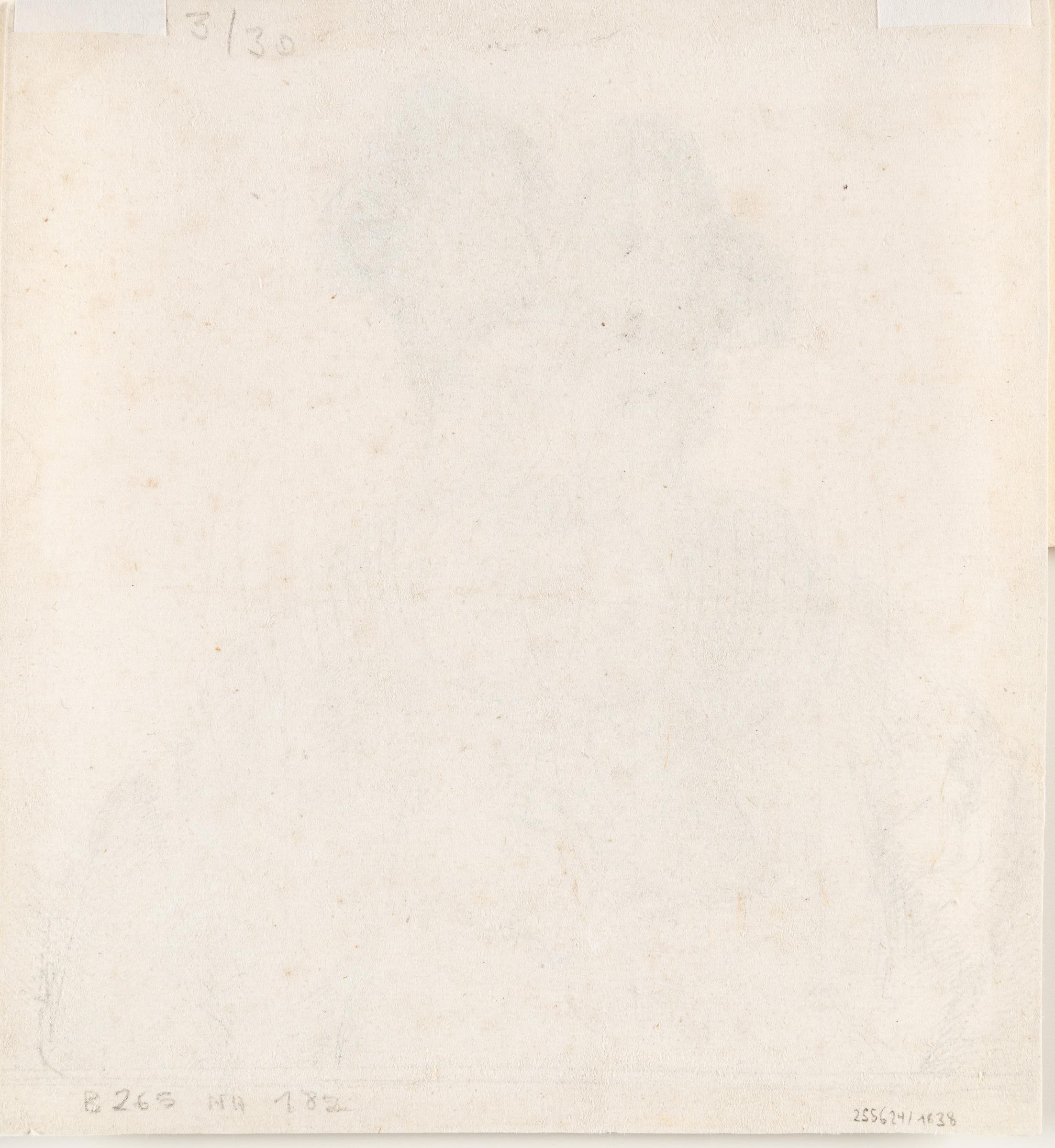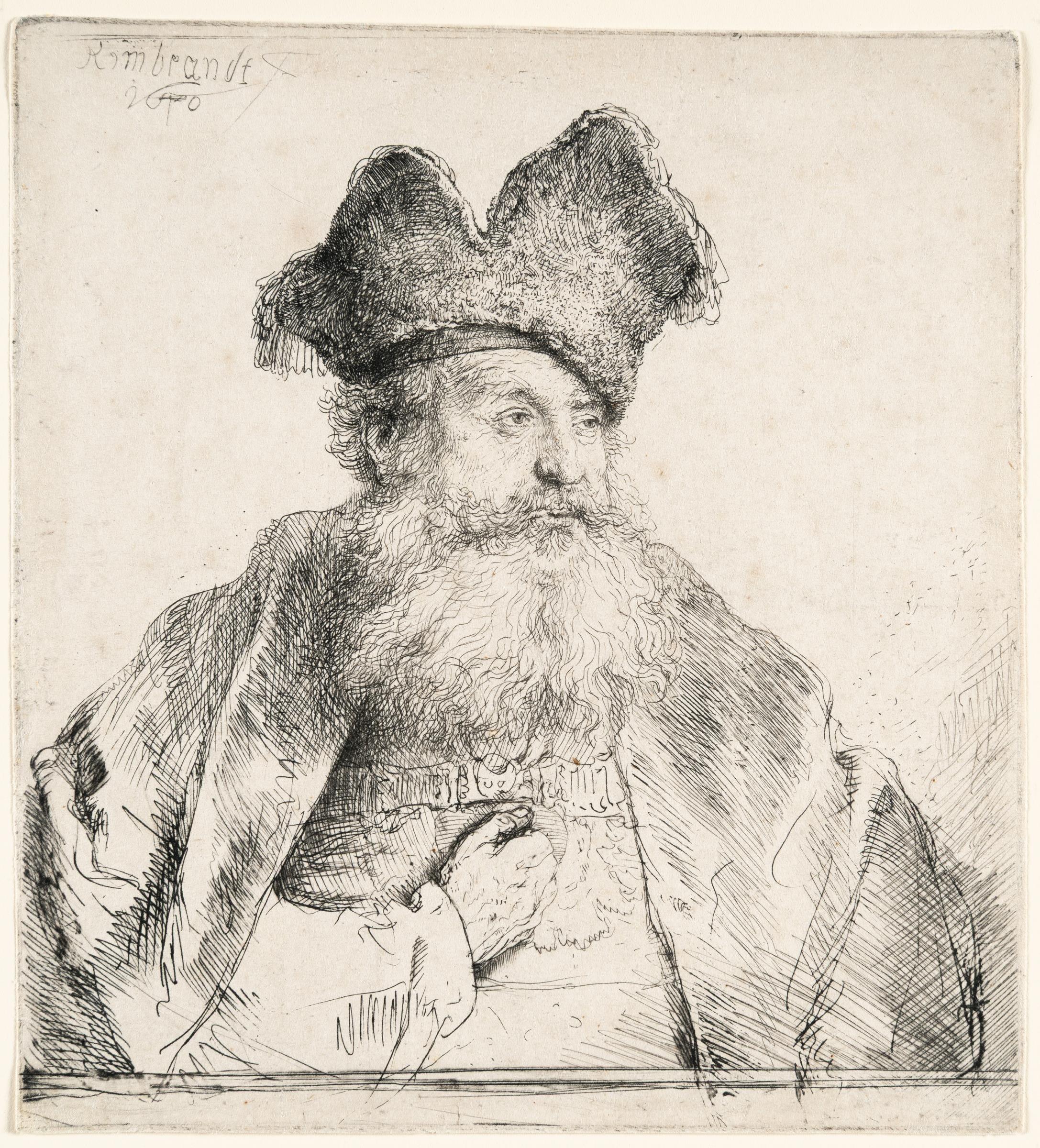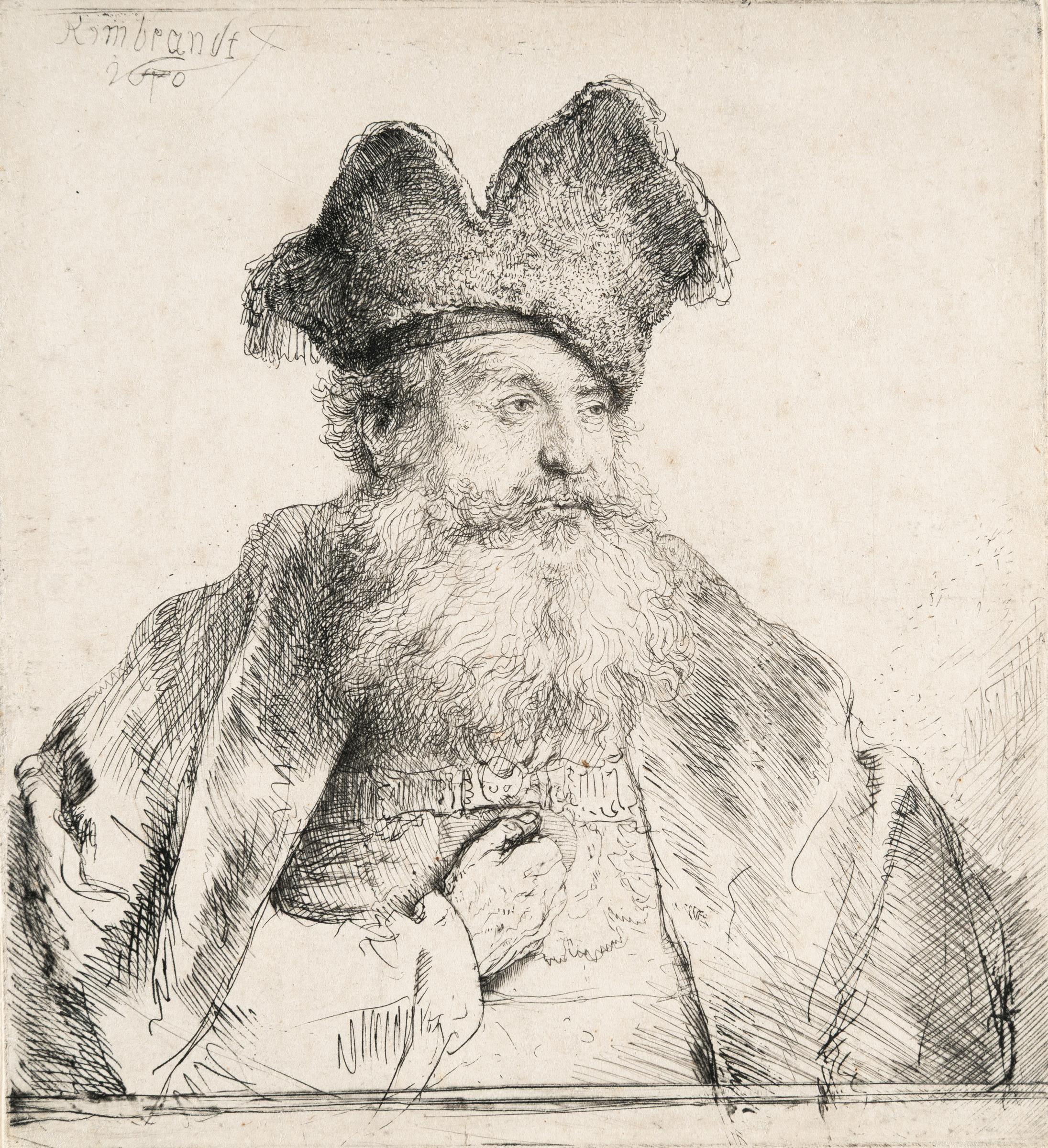 A superb lifetime impression of the first state, with strong burr on the horizontal lines in the bottom left corner and on the vertical lines in the bottom right corner. Before the slipped stroke at the level of the left eye. Study heads, known in Dutch as tronies, held particular significance for Rembrandt. Though they often appear to be drawn from life, these expressive character studies are in fact imaginative creations. What mattered to the artist was capturing striking facial features or unusual attire—such as the bearded man’s distinctive fur-trimmed cap. Trimmed to or cut on the platemarks. – Very faint, barely noticeable foxing, otherwise in very good condition.