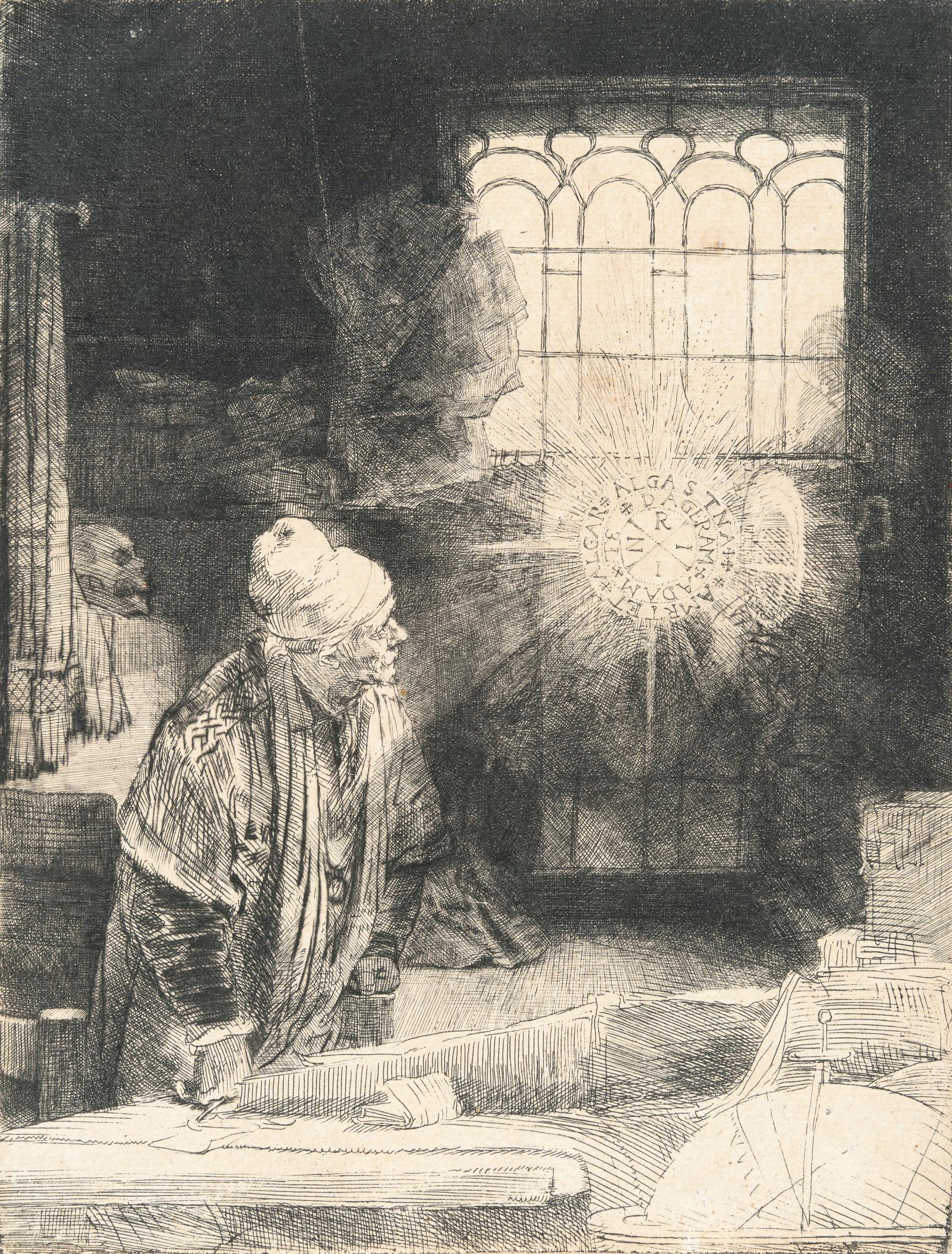 An extremely fine, lifetime impression, printed on coarse-fibred, soft oatmeal paper, with strong burr on the curtain, the skull and on the coat of the scholar. With fine margins. This impression offers a compelling example of Rembrandt’s nuanced handling of plate tone and surface wiping. Through selective wiping, he carefully exposed key elements such as the books and manuscripts on the shelves at upper left, as well as the modelling of Faust’s garment. Simultaneously, he preserved the rich burr in the densely etched areas of the curtain and its fringes, thereby achieving a striking balance between linear precision and atmospheric density. An impression on similar oatmeal paper is held in the Albertina, Vienna, and is reproduced life-size in Rembrandt: The Late Works, p. 156. By contrast, earlier impressions printed on Japanese and European laid papers exhibit a markedly different character. In those, Rembrandt applied the ink more generously and wiped the plate only lightly, allowing heavy plate tone and burr to obscure finer details. As a result, the middle ground—particularly Faust’s shoulder and cloak—becomes enveloped in a richly textured shadow, lending the composition a markedly painterly quality. Rembrandt's choice of oatmeal paper—used for only a select number of impressions—is significant. Its lightly fibrous texture and soft buff hue contribute to the evocation of Faust’s dimly lit, dust-filled study. This particular paper not only amplifies the atmospheric effect but also serves as a deliberate aesthetic decision within the broader strategy of the print. The combined use of selective wiping, controlled burr, and an optically responsive support underscores Rembrandt’s sophisticated understanding of how material and technique can be orchestrated to heighten expressive content. (See Nancy Ash and Shelley Fletcher, ‘Rembrandt the Printmaker: Materials and Techniques’, in: Erik Hinterding et al. (eds), Rembrandt the Printmaker, London: British Museum Press, 2000, pp. 53–65; and Erik Hinterding, Rembrandt as an Etcher: The Practice of Production and Distribution, vol. 1, Ouderkerk aan de Amstel, 2006, pp. 111–145.) The paper slightly time-stained. Two small brown spots in the window. A faint paper rubbing on the lower right edge. Verso traces and remnants of a former mounting, otherwise in very good condition.