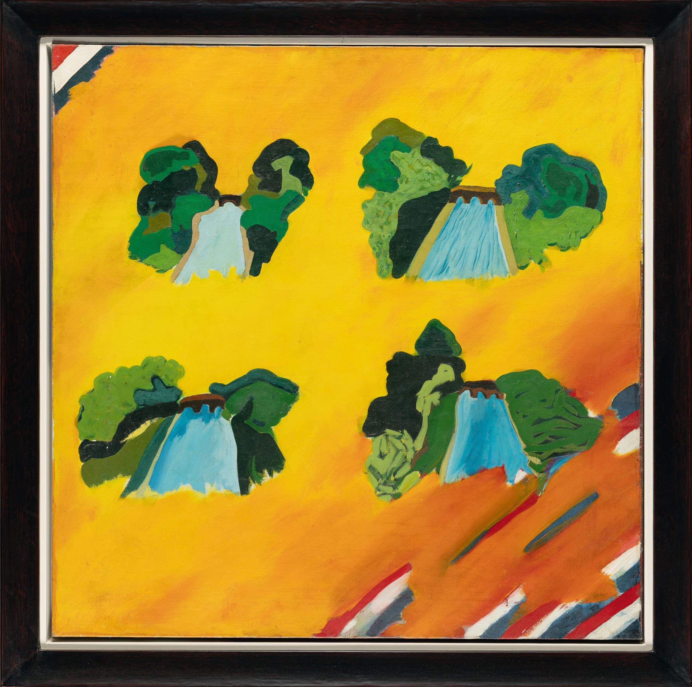 • Vereinfachte Gegenständlichkeit - hier in Form von vier Brücken - wird collageartig vor einen abstrakten Hintergrund gesetzt.