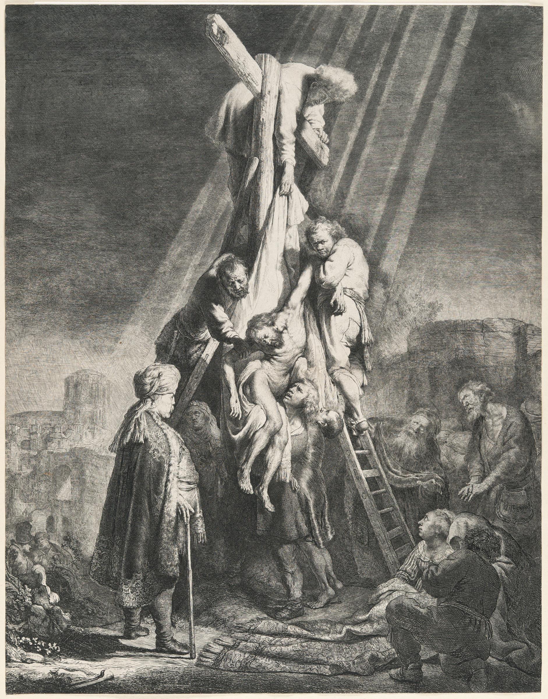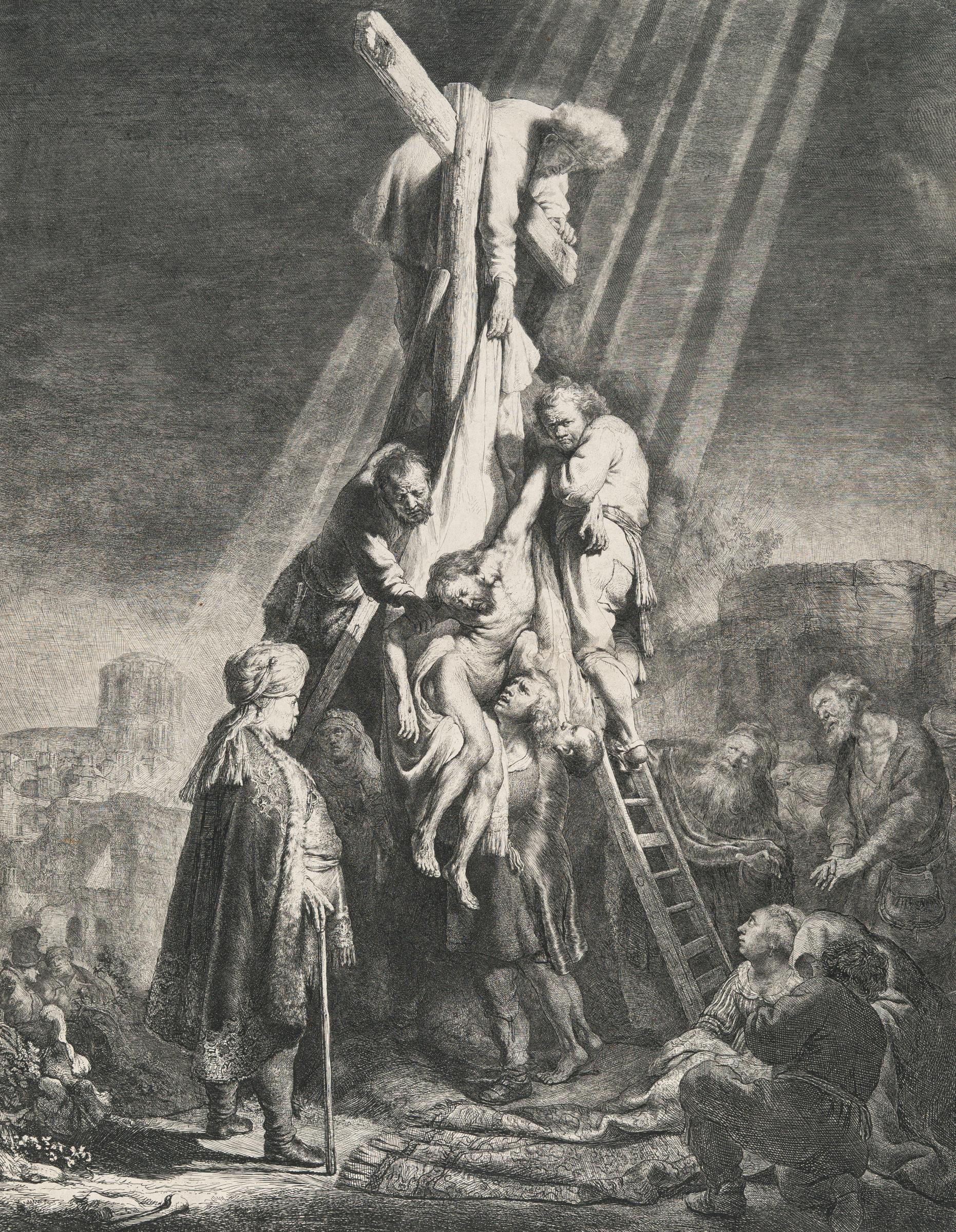 A very fine, dark and richly-inked impression of this large print, with strong contrasts and no signs of wear, consistent with the earliest impressions of this subject. The large-format etching reproduces a painting by the artist created at the same time (1632/33), which is now in the Alte Pinakothek in Munich (inv. no. 39565). Prince Frederick of Orange, stadtholder of the Netherlands from 1625 to 1647, commissioned Rembrandt to paint five works depicting scenes from the Passion. This theme was a great challenge for Rembrandt, as it was depicted in Dutch art in a very rare manner. Rembrandt found an inspiring model for his composition in the monumental ‘Descent from the Cross’ painted by Rubens in 1612, which can be seen in the Cathedral of Our Lady in Antwerp. Rembrandt changed the traditional interpenetration of the dramatic and the heroic in previous interpretations of the motif; in the 1630s in particular, he was concerned with depicting events of this kind in a natural way (Stechow 1929, p. 217). The collapsed body of Christ makes it clear that he is perceived as truly dead. The extremely elaborate rays of light falling from the upper edge of the canvas onto the main scene on the cross suggest a connection with the divine (K. Röder, in exhibition catalogue Schwerin 1995, p. 82). Trimmed to the borderline, cut under loss of the white margin. – Isolated, unobtrusive, skilfully repaired tears in the margins. The upper right corner made up. Smoothed horizontal creases, with occasional restorations. Otherwise in good condition.