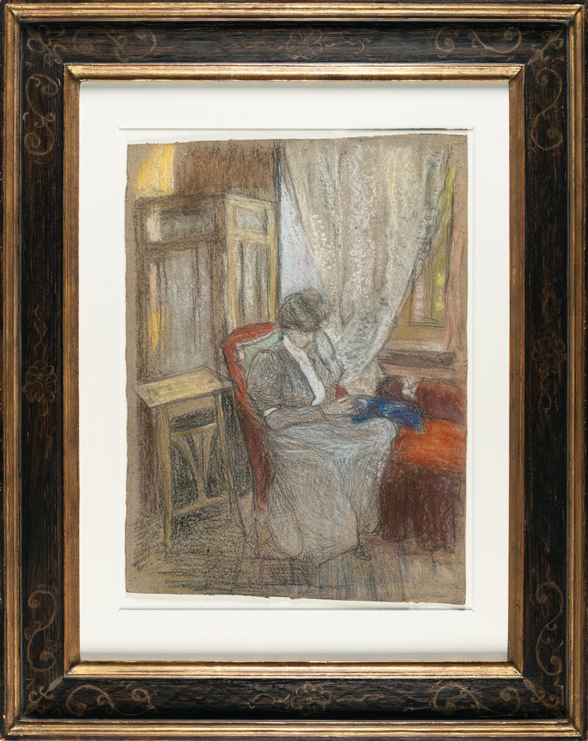 In der Darstellung einer jungen Frau beim Sticken offenbart sich eine sensible Komposition, die sowohl äußeres, als auch inneres Erleben erfahrbar macht. Das Thema – eine zurückgezogene häusliche Szene – wird mit zarten, aber bestimmten Linien gefasst. Das leuchtende Hellblau des Kleides und die rötlich akzentuierten Gesichtszüge heben sich wirkungsvoll vom neutralen grauen Karton ab und erzeugen eine balancierte Farbspannung.