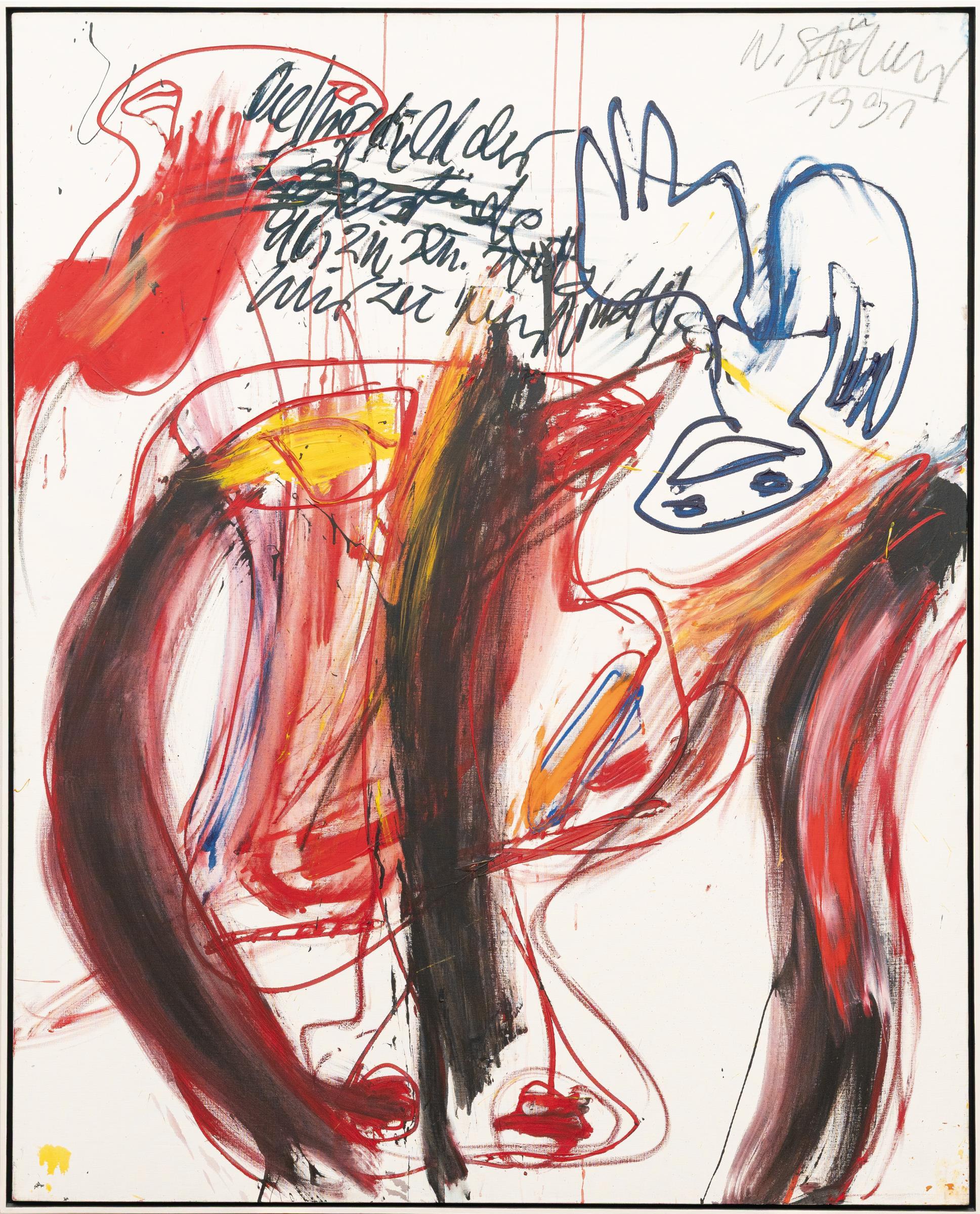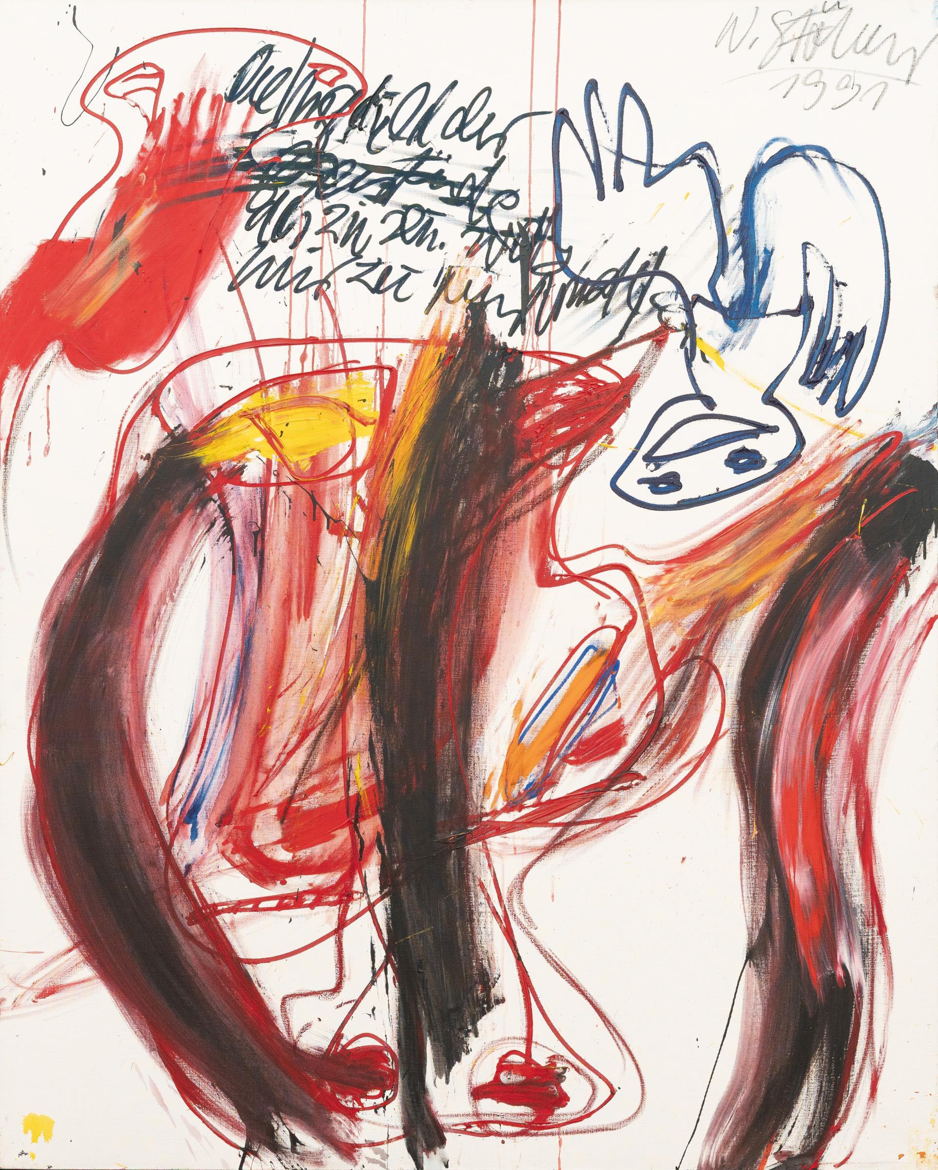 Auch die späteren Arbeiten wie „Die Ungeduld der Gegenstände, das zu sein, was wir zu tun fürchten“ weisen die unverkennbare Handschrift Walter Stöhrers auf. Er malt gestisch–furios auf große Formate, überwiegend in den Grundfarben Blau, Gelb und Rot, wobei er häufig den weißen Grund der Leinwand stehen lässt. In diesem Fall kommt eine weitere Dimension hinzu, denn der schwer leserliche Titel des Werks wird hier zu einem wesentlichen Gestaltungselement. Als prägend empfand Stöhrer schon früh die US-amerikanischen Künstler Cy Twombly und Jackson Pollock, ebenso wie die figurativen Darstellungen von Pierre Alechinsky und Asger Jorn. Die große Besonderheit an seinen eruptiven Farbbahnen, seiner sehr ehrlichen Malerei, ist es aber, dass sie einen überzeugenden eigenen und „figürlichen“ Weg nimmt. Das expressiv Gestische und das konstant Figürliche, das in der Kunst nach 1945 eigentlich kaum zu vereinen ist, wird von Stöhrer mit großer malerischer Kraft zusammengeführt.