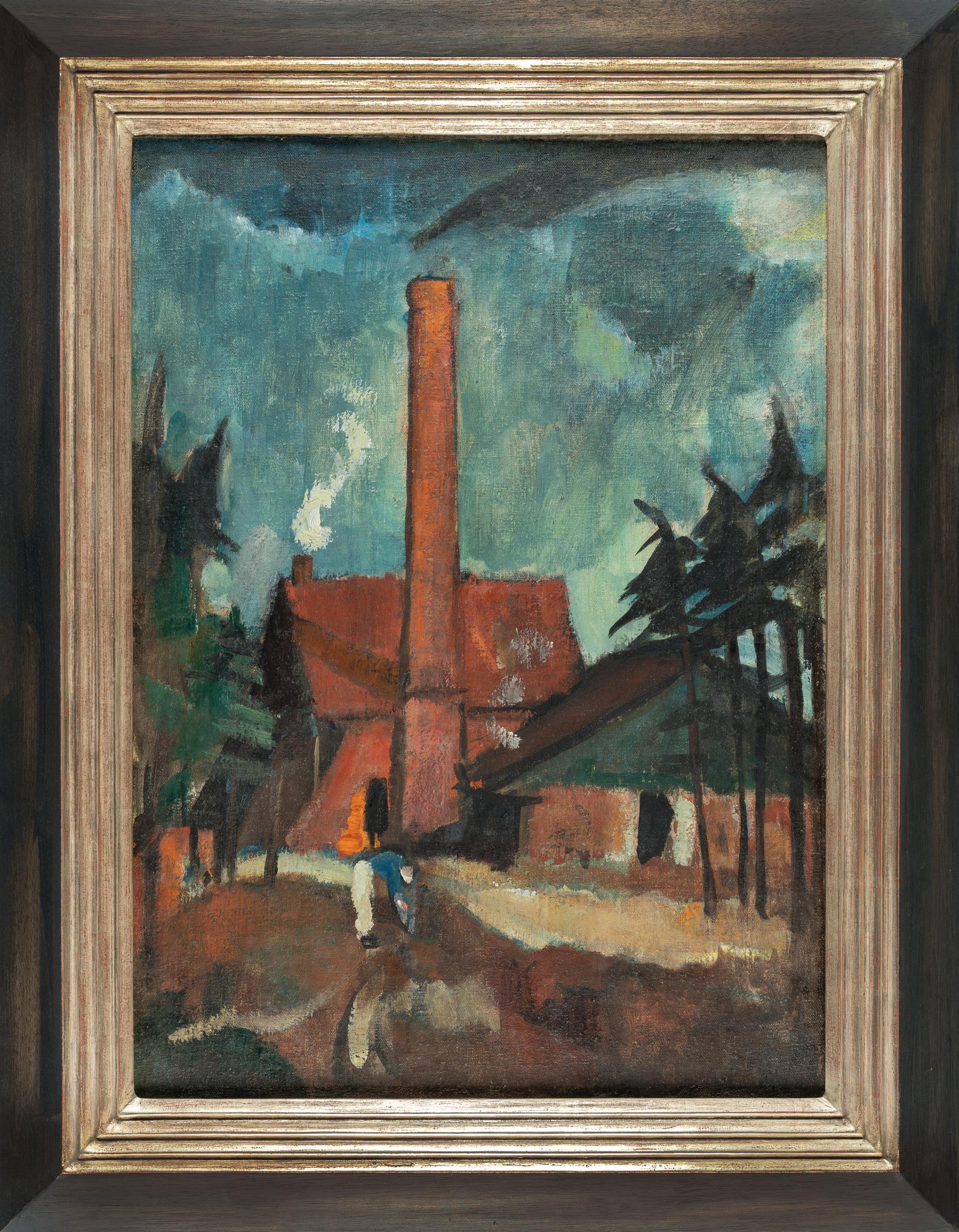 1913 malt Stenner das hier angebotene Bild. Die Vorderseite – oder besser: die Seite, die für die Vorderseite gehalten wird – gibt uns einen Einblick in die Welt der Arbeiter. Das Motiv der Ziegelei taucht wiederholt im Werk Stenners auf, eine andere Version wurde aus der Kunsthalle Bielefeld im Rahmen nationalsozialistischer „Säuberungen“ als „Entartete Kunst“ entfernt. In unserer Version nun rauchen die Schornsteine der Fabrik, Ziegel werden gebrannt. Fast idyllisch mutet die Gebäudeansammlung umgeben von hohen Tannen an; eine Figur in blauweißem Gewand nähert sich. Stenner idealisiert gewiss, und doch zeigt er ein Motiv, welches für viele Menschen alltäglicher nicht gewesen sein könnte: Der Blick vor dem Beginn der Arbeitsschicht, in den zahlreichen Fabriken des Reiches zum Beginn des 20. Jahrhunderts.